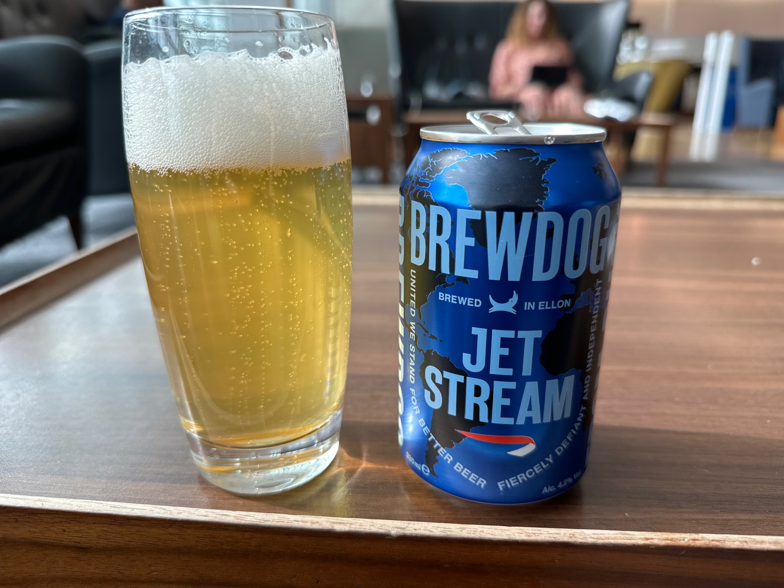The lounge was pretty crowded, but not so full as to stop us finding comfy seats near the window. Is this the first time I’ve sat near the window here? Normally I’d dive straight down to the champagne alcove at the back. Hmm. Anyway. Helen needed to do some laptoppy stuff so got on the wifi while I, uncharacteristically, started off with a beer. I regretted it almost immediately, because Brewdog Jet Stream is bland as fuck. But free beer is free so whatever.