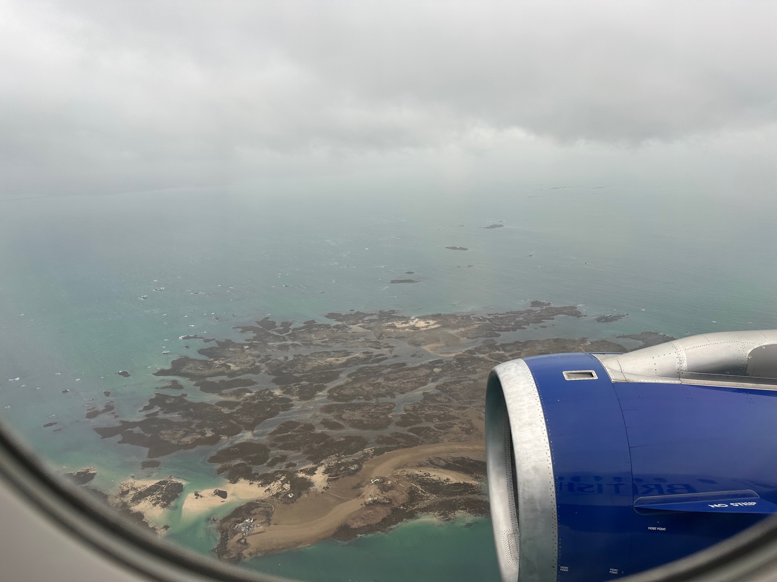 We’d both expected a pretty bumpy descent, as the forecast for Jersey was for horrific wind and rain. But in reality it was pretty bloody smooth, not unpleasant. There were glimpses of land as we came down, and Helen took my pad to write in capital letters