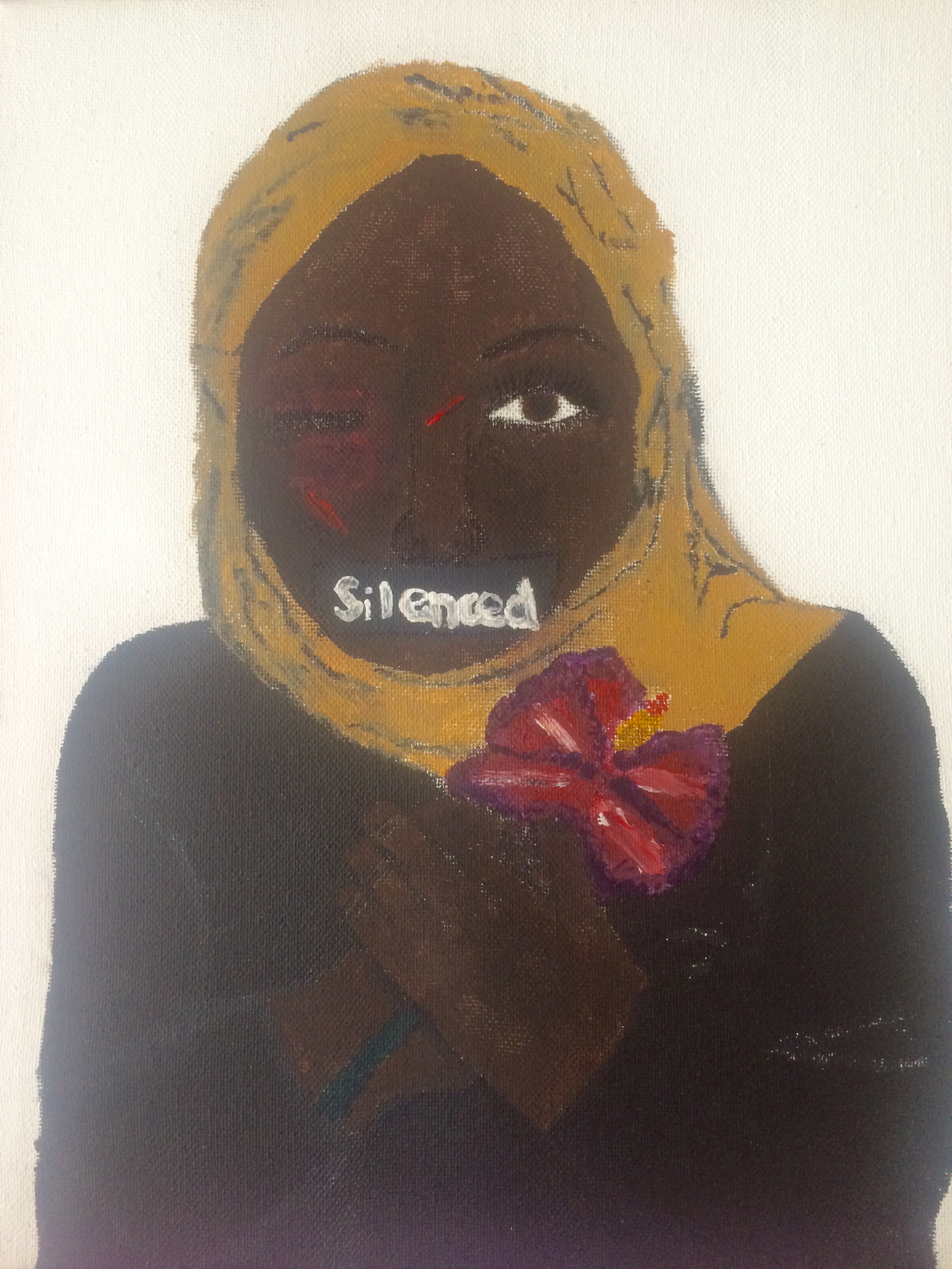 The artwork that I created represents the issue of political oppression by showing the emotions of how people felt. The young woman that I painted in my product shows her perspective about the lack of the freedom. In the book, Purple Hibiscus, Nigerians aren't able to use their own voices to fight for their freedom. Even if they did rebel against the issue, it caused more tension to rise. To add on, it makes the government use violence as punishment. There is violence shown in my art product by the bruises and cuts she has on her face. This shows one of the problems for political oppression. Also, there is silence everywhere, and it affects the way Nigerians behave. Without the power of their voices, there won't be new changes seeking for their freedom. The young woman has duct tape over her mouth that says silence, and this symbolizes fear. In general, people are afraid to speak up for what they believe is right, so no new changes can be made. The purple hibiscus that she is holding is a symbol for freedom and a change for the better. The red that is shown in the purple hibiscus represents violence and anger. Currently in Nigeria, there is female oppression because of their religion. They are required to wear a hijab over their head, based on what religion they follow. This symbolizes the differences between other religiousgroups. Because of the government controlling people and not respecting their rights, it has created an issue that affects different regions around the world.