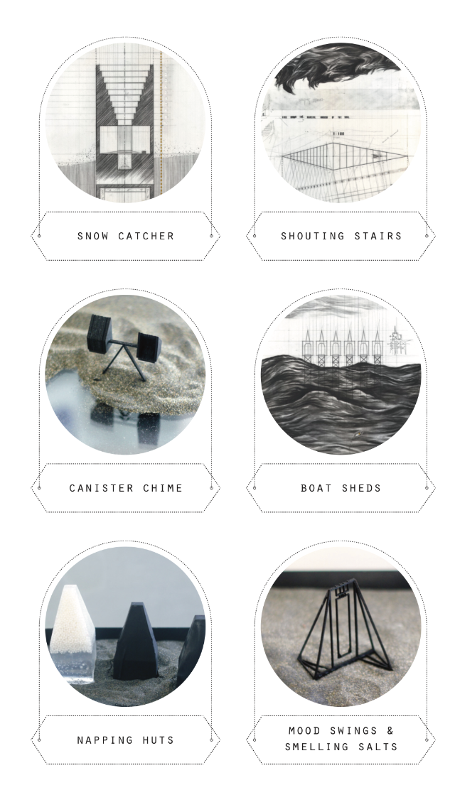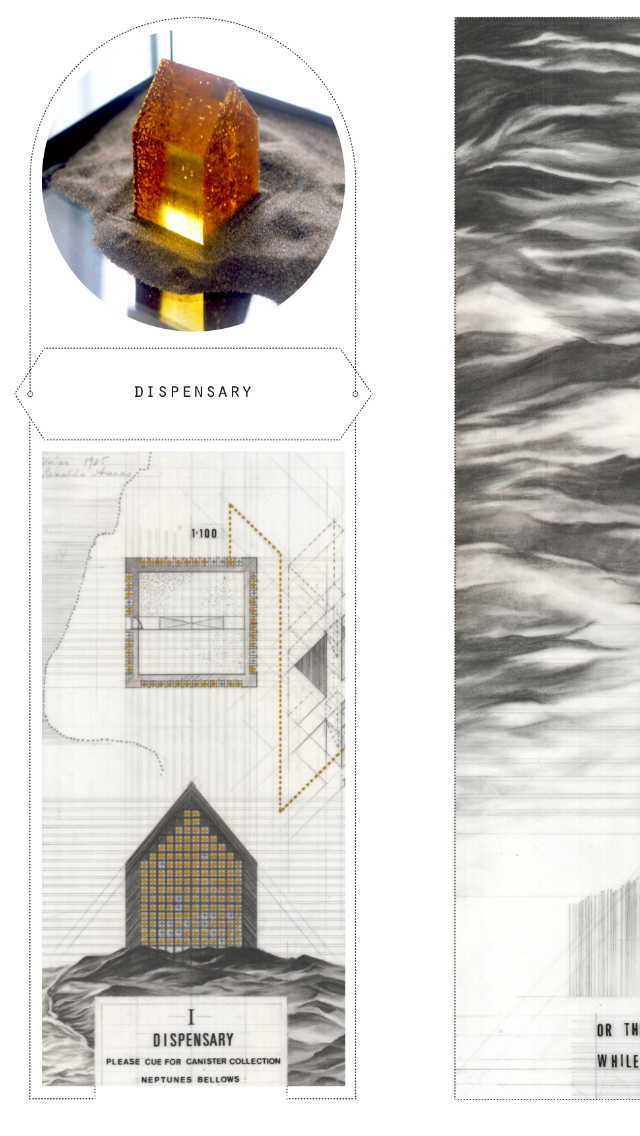 最后,新西兰馆的一些设计,是一些对未来的畅想,名为未来的岛屿。大都是近年来的获奖学生作品,其中一个有意思的作品来自Holly Xie的“消失的行为”。她的基地选择在南极洲的一个叫做欺骗岛的地方。她沿着岛选择了一系列的地点建造了一些装置,来保留人们一些消失的行为的记忆,比如大海的梳子,茶的塔.....她的图纸表达也特别唯美。我觉得她更像一个装置艺术家。