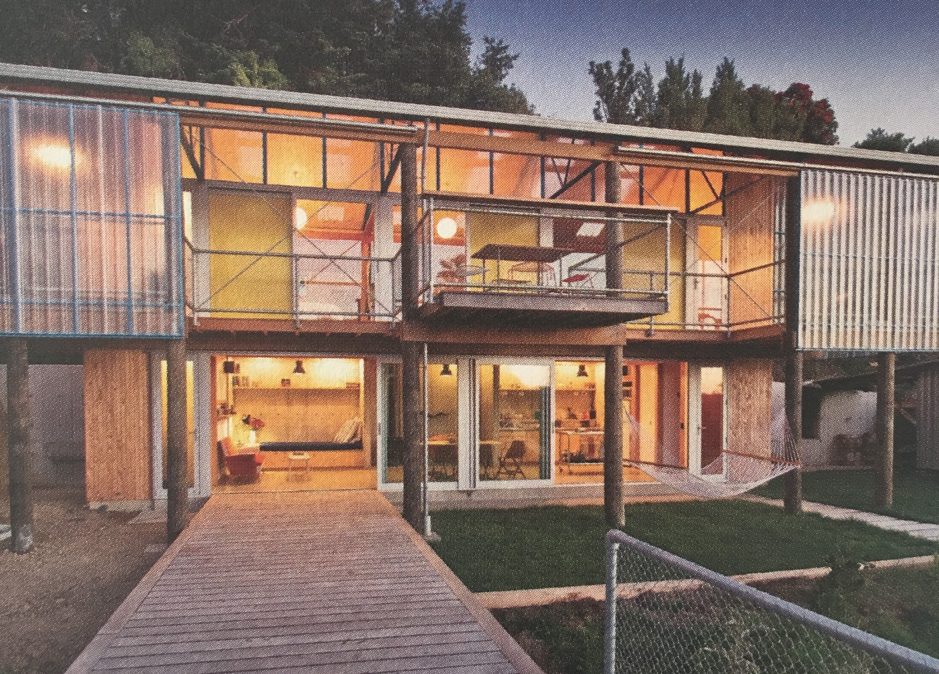 又扯远了,相似的一个建筑还有这个。也是建筑学生的实践。这涉及到一个尖锐的话题,买房。华人社会是比较喜欢,父母辈出资买房,至少付个首付为子女买房,这在现在的中国非常普遍。对于新西兰的年轻人来说,房子也是不可承受的奢侈品,而且父母一般都不会出钱帮子女买房的。原因有两点,理念不同,父母辈对子女的生活干涉比较少,大家界线清晰,大家都先是独立的自我,然后才是父母与子女的关系。说白了就是,大家各过各的,拎得清。第二点,很多洋人父母也没啥钱,(已经买了游艇和度假屋),自己也在还贷款。当然我讲的是老百姓,有钱人会成立家庭基金,家里的钱都是基金里的,子女能不能拿到钱可能要满足一些条件。因此,新西兰大部分的年轻人都是租房的,几个伙伴合租,像老友记里那样,或者couple租住在一起。这个项目里四个小伙伴因一次偶然的原因发现了在trademe(新西兰版淘宝)上的一个拍卖,拍了一个很便宜的地,买了工具,还买了四根便宜的生锈的truss(桁架)就开始自己动手建房了。