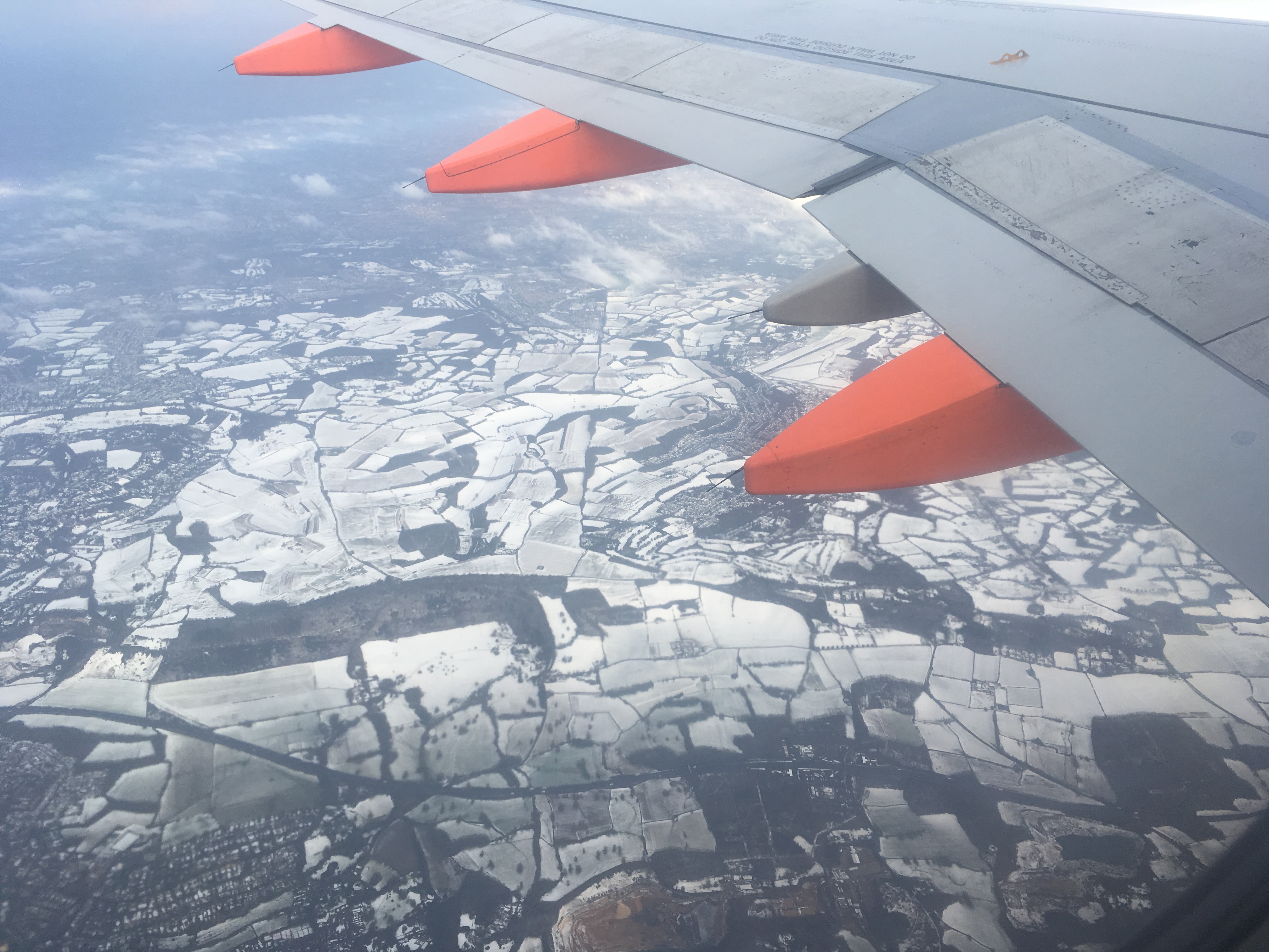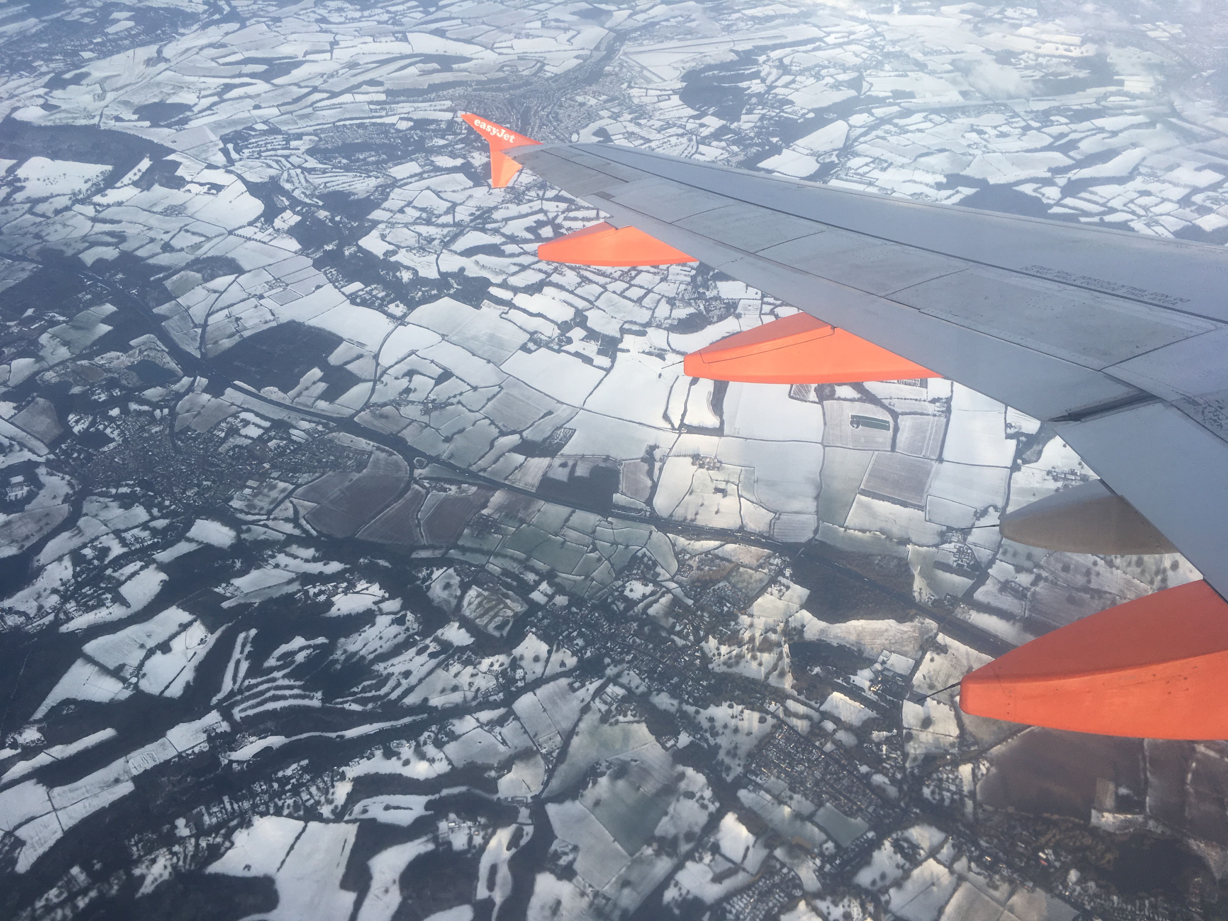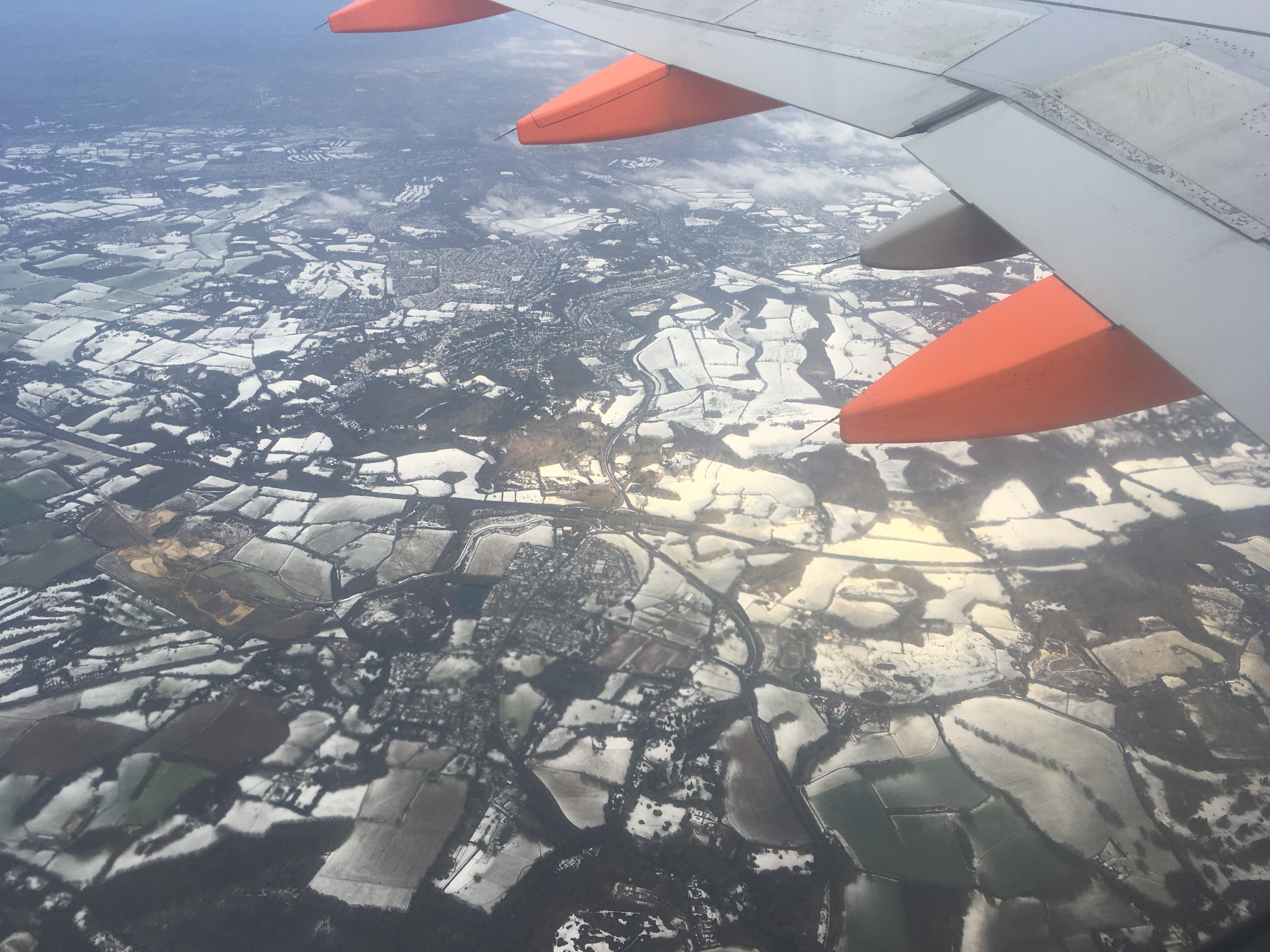 We taxi past an Emirates A380 and I'm a bit jealous. There's a mysterious bridge linking the north terminal to some other building - perhaps some distant gates? And we skirt around a few Thomson and Wow and Wizzair planes, plus a lot more BA than I thought there'd be at Gatwick, and then up, up and away. Turns out the snow across the south of England had settled.