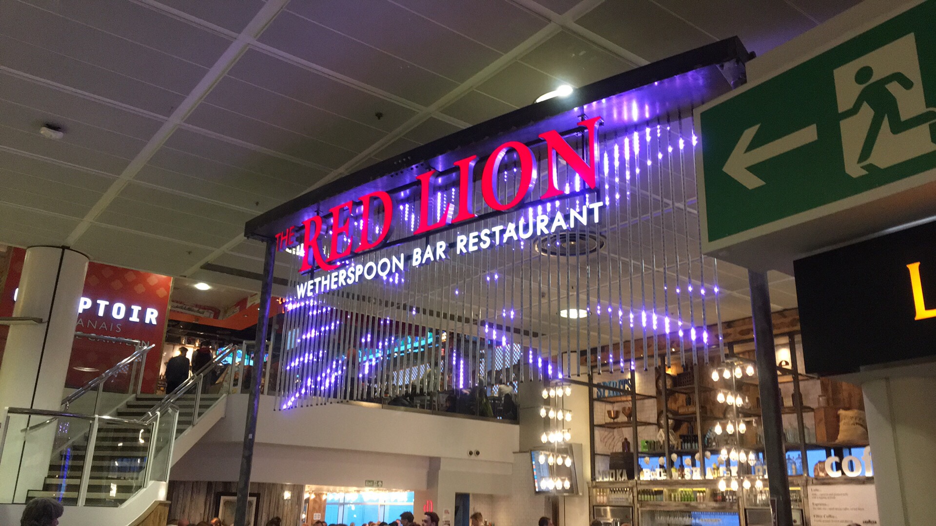 Into the terminal and the bright lights of an 8am Wetherspoon are twinkling. Really, they are: the Red Lion is heaving full and the sign is animated neon. This is too much. Besides, neither of us are in the mood for a beer just yet. Just water and a slice of cake.