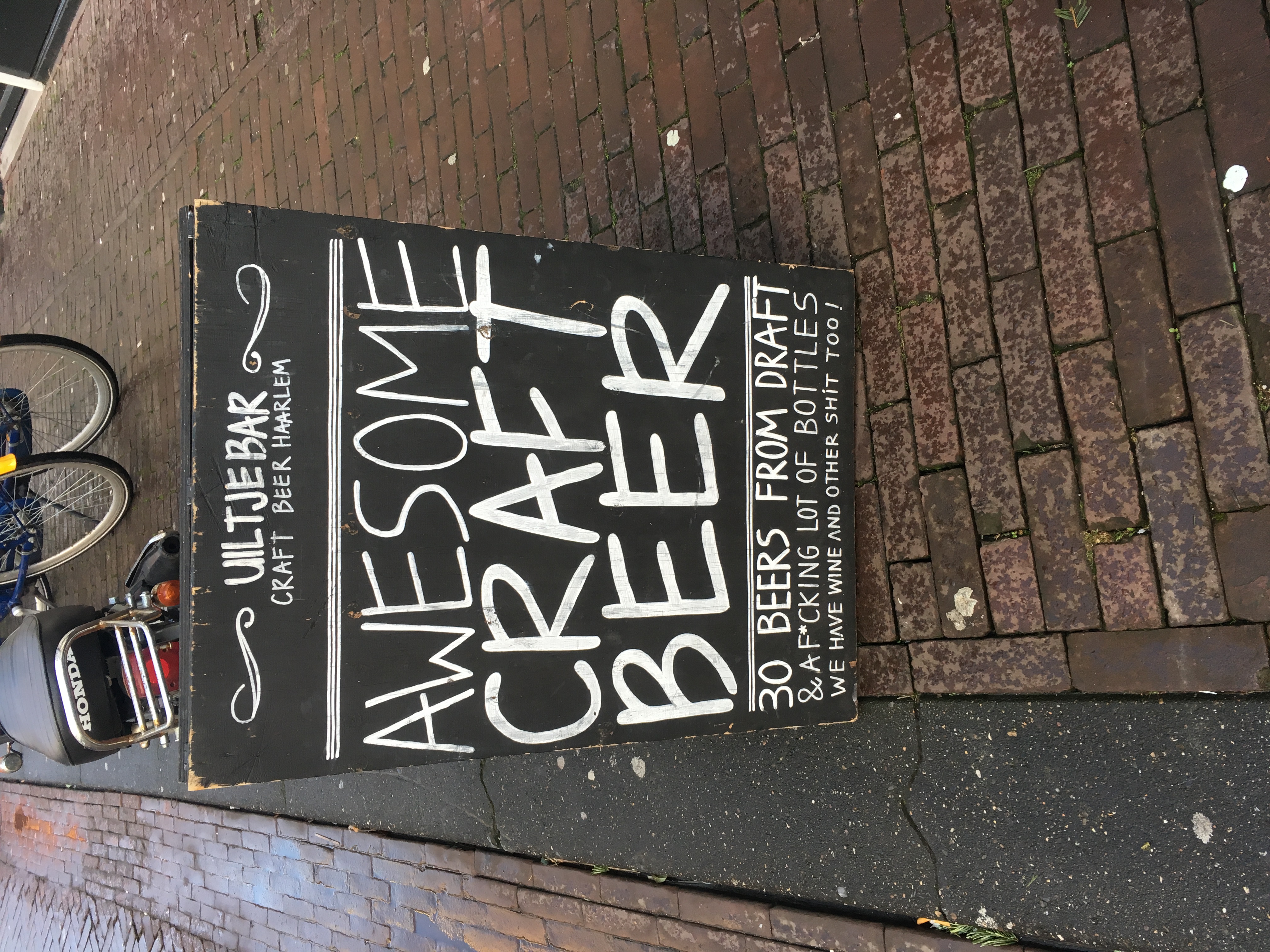 So that's basically the present delivered. She's brought me to Haarlem and taken me to Jopenkerk. Why have we left already? Oh, that's right, because there's a hipster bar run by another local brewery, based on owls - they're called Uiltje, Dutch for "owlet" - just around the corner. And who has about 20 different owl-based things decorating her house? That would be Helen. How it took me to find out about this place and not her, I do not know.