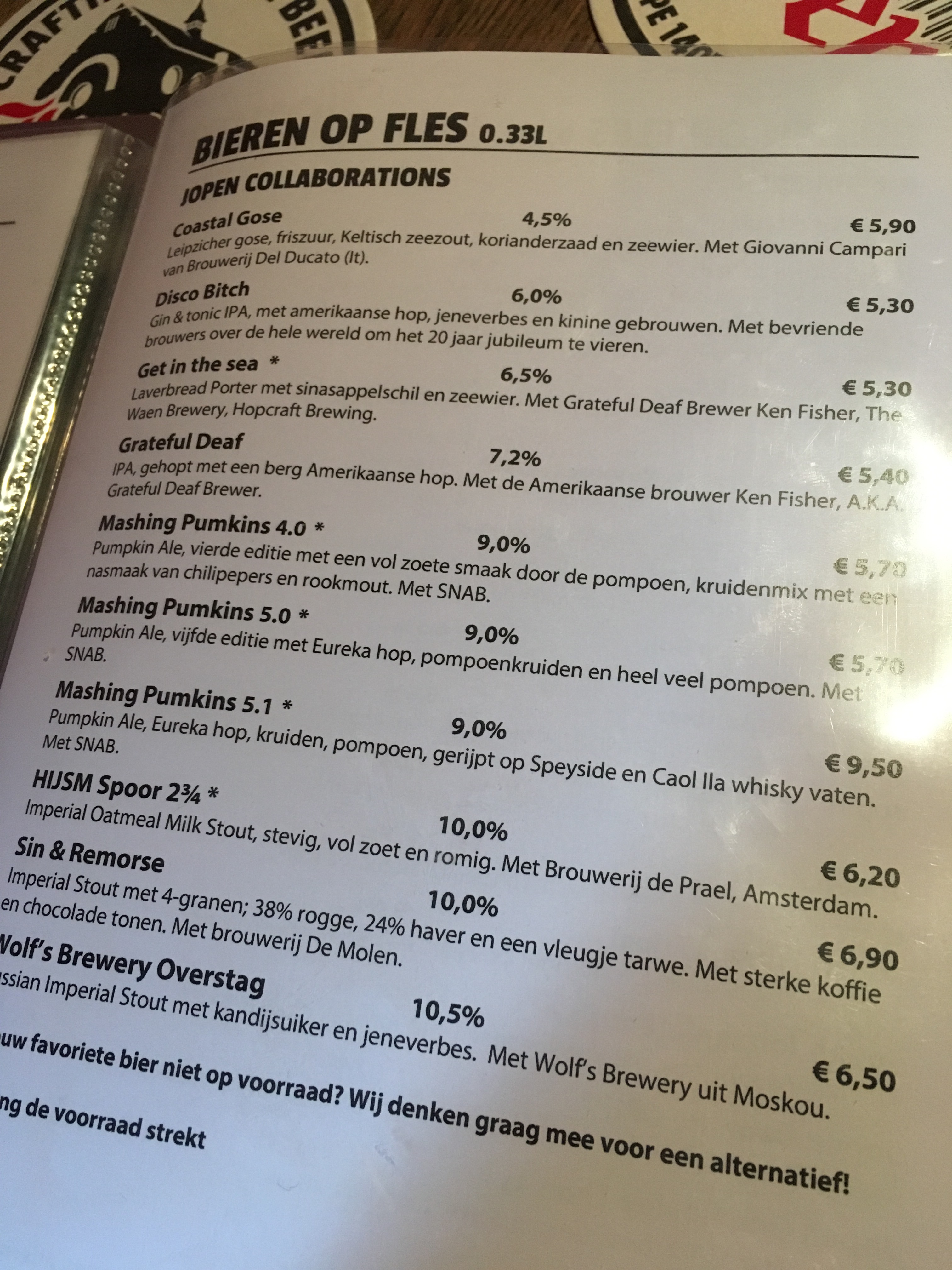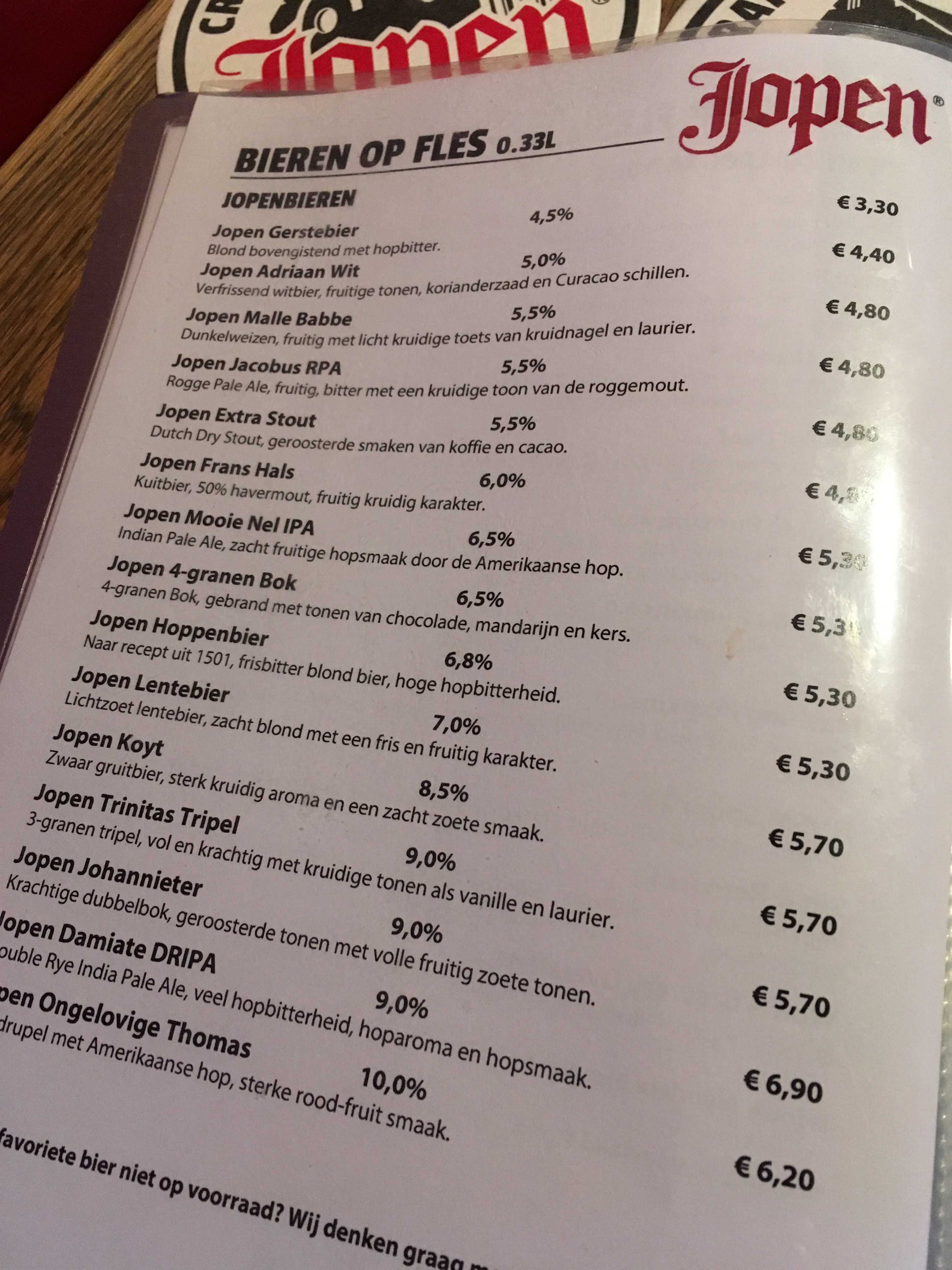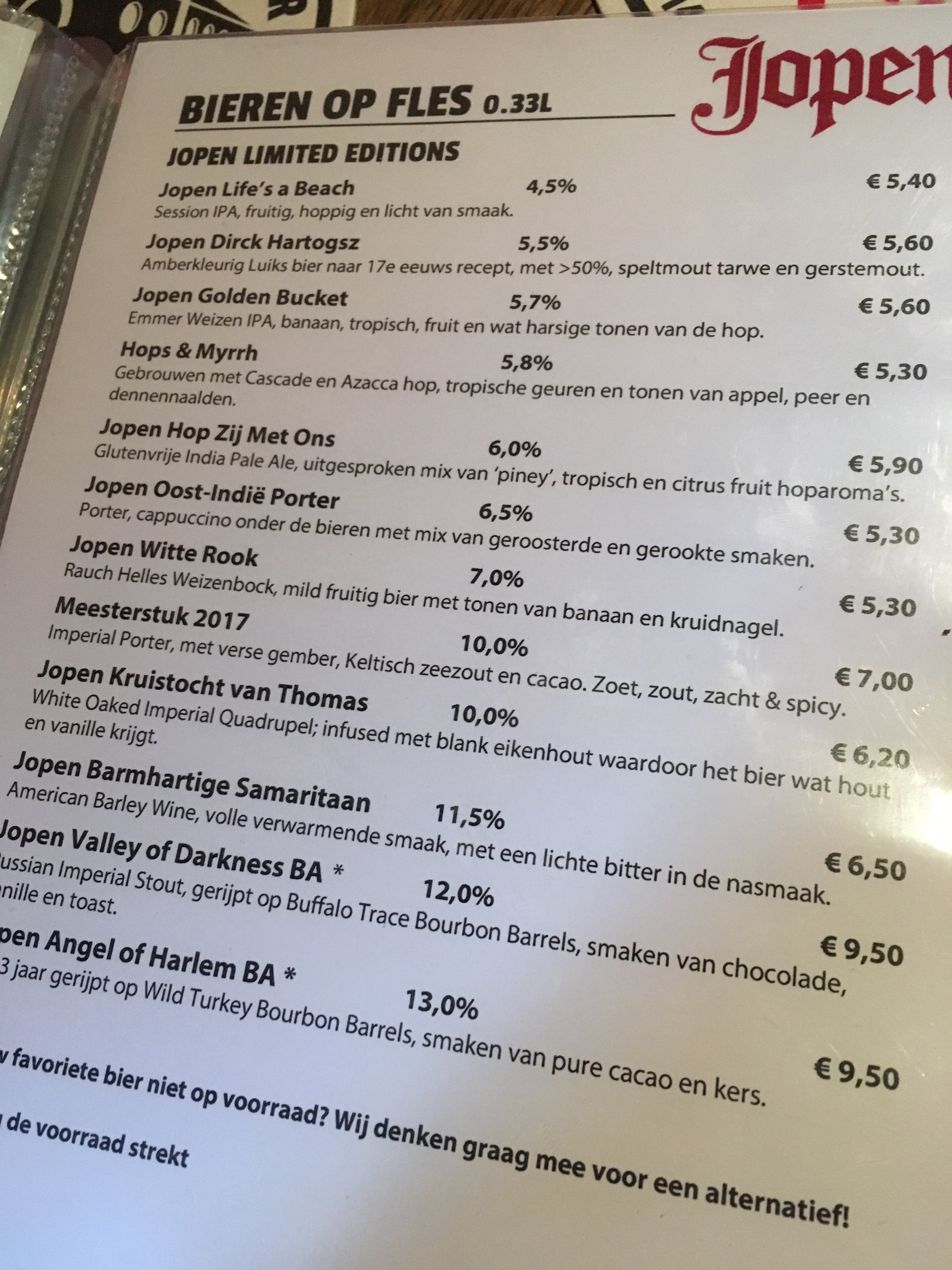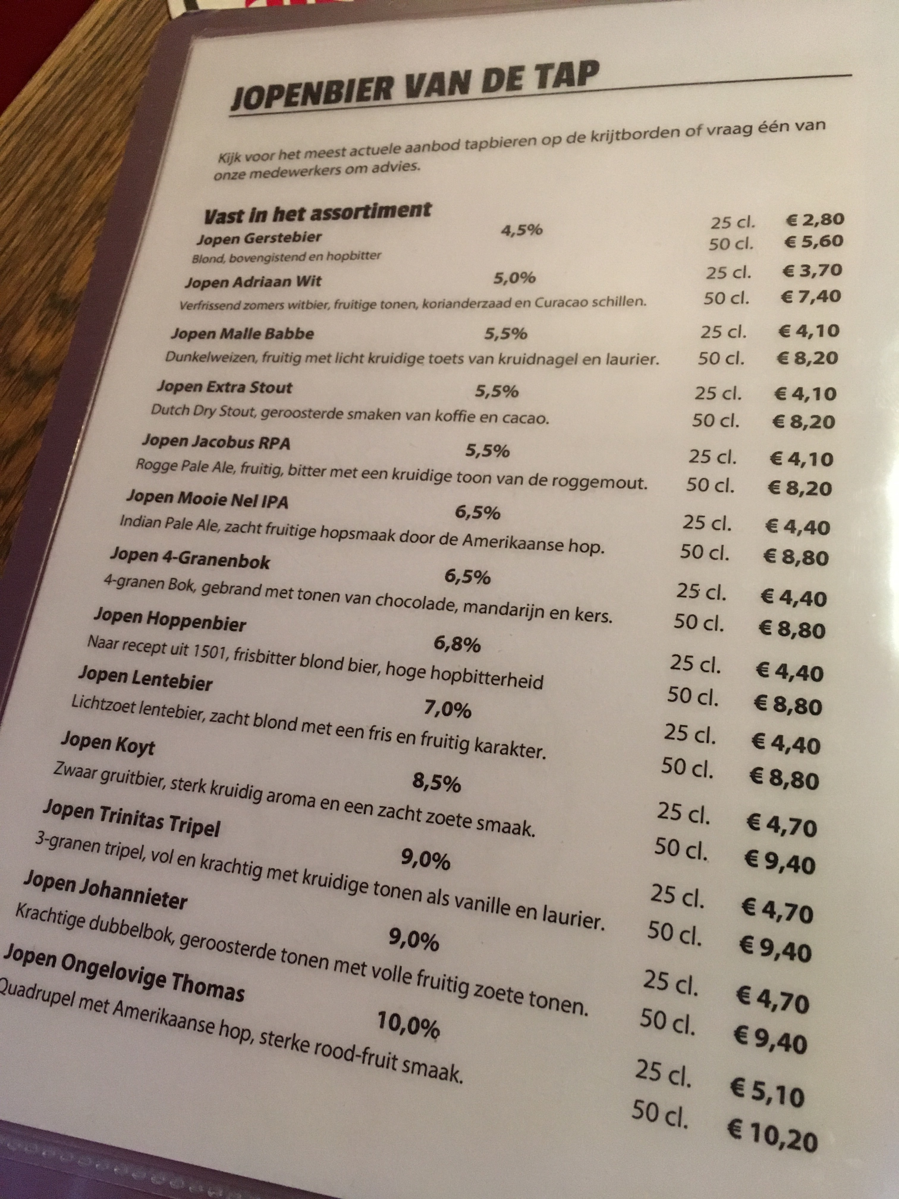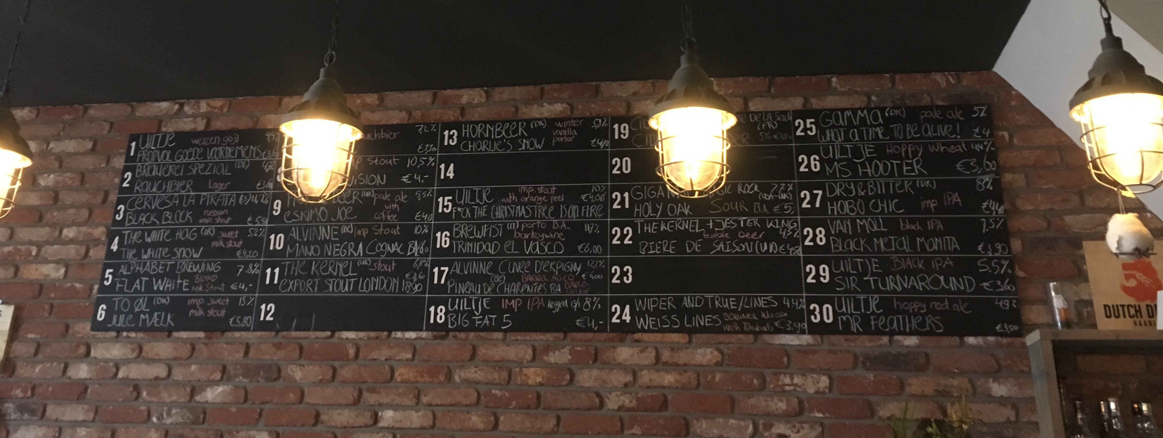 We grab a seat next to a blackboard listing about 18 beers they have on tap. We also have menus, with 4 full pages of beers. Holy crap. There's dark beers and IPAs and pilseners and witbier and ... well actually we're not totally sure about some of them because the menu is in Dutch and we don't bother asking for an English one.