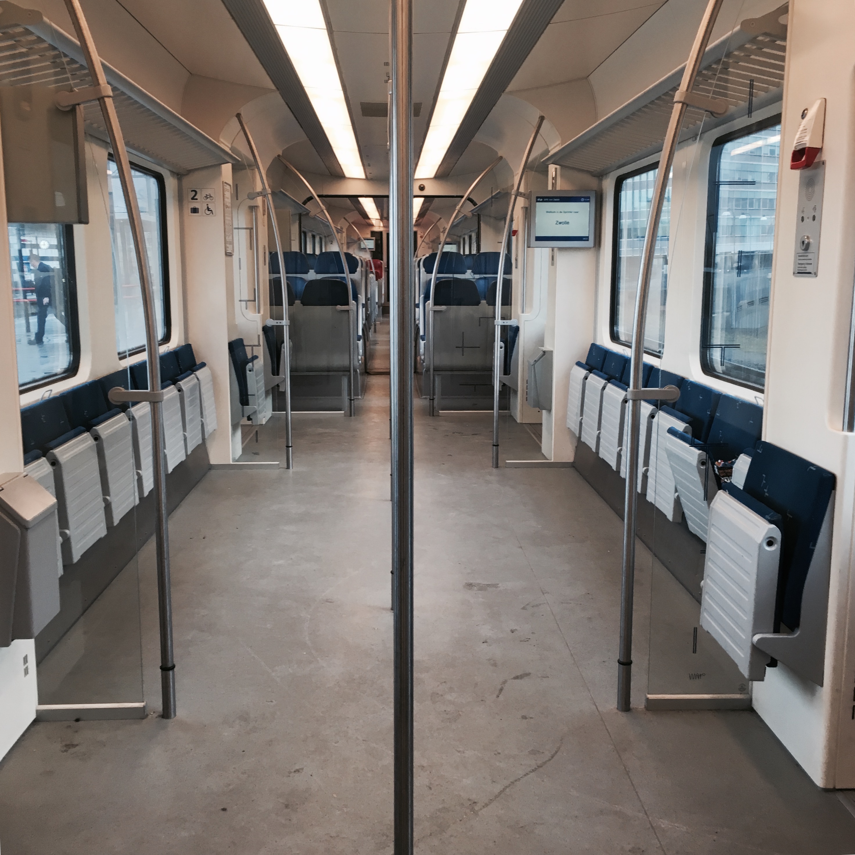 The driver's announcement refers to this service as a "Sprrrrinterrrrrrrr". It's going all the way to Amsterdaam Centraal and beyond, and before we leave - about 20 minutes after we board - it gets pretty full. Once we set off, there's an automated announcement which says the train is going in the other direction, to Den Haag, and lots of people look confused.