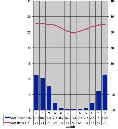The climate of the western dry deciduous forest is tropical. Temperatures range from an average maximum of 30°C to 33oC and an average minimum of 8° to 21oC. There are defined wet and dry seasons. Most of the precipitation happens between the months of October to April. A lot of the forests used to be tertiary limestone but it has been degraded over time. Now most of the western dry deciduous forests are formed by grasslands and secondary forests that have been extensively depleted. A portion of the secondary grasslands was created as vegetation was burned and it is now inhabitable for species that used to live there. Elevation rises as we move to east, but remains barely above sea level from the northern to the southern side of the island. Throughout the western side, canyons divide forests, separating flora and fauna.
