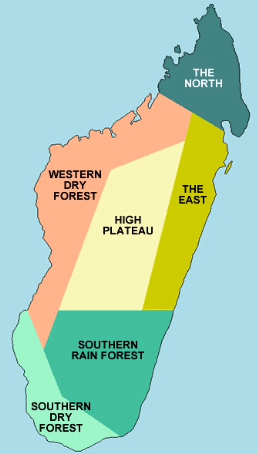 Because of its large size, Madagascar has a wide range of ecosystems, including rain forest, dry deciduous forests, spiny thickets, amongst others. Most of these ecosystems are considered to be in danger. According to the World Wildlife organization 97% of the dry deciduous forest of Madagascar have been depleted and destroyed since the first human settlement on the island. Because it covers a large portion of the island, this presentation will discuss the dry deciduous forest of Madagascar (orange section below).