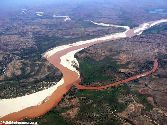 The Betsiboka River is 525-kilometers long river. It flows into Bombetoka Bay and it has been heavily damaged by erosion. Surrounding land has been depleted by overgrazing and environmentally unsustainable agricultural practices. This River houses three kinds of cichlids and other aquatic species that are being affected by the water pollution. Bombetoka bay is consequently polluted by the river's water as well.
