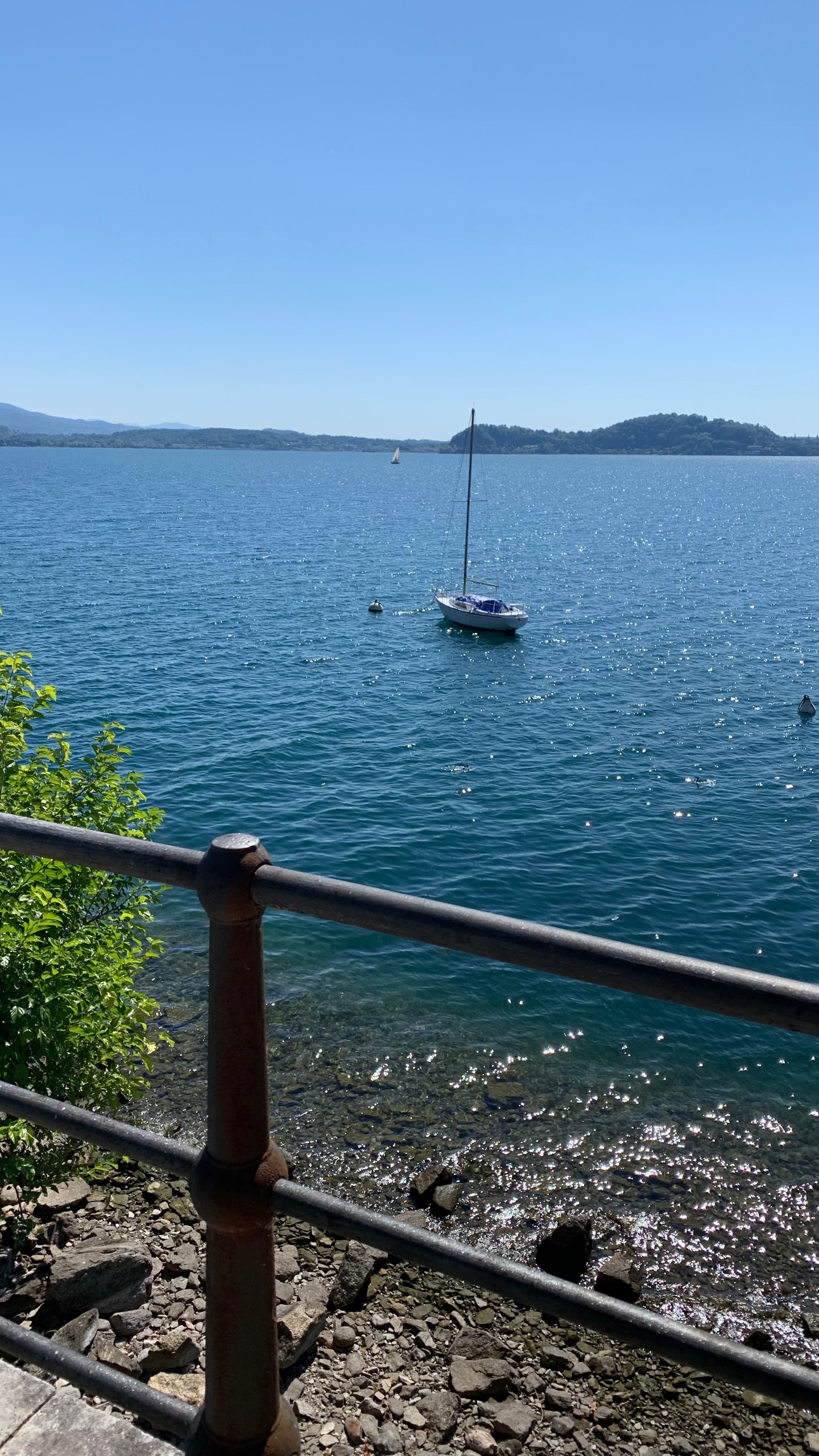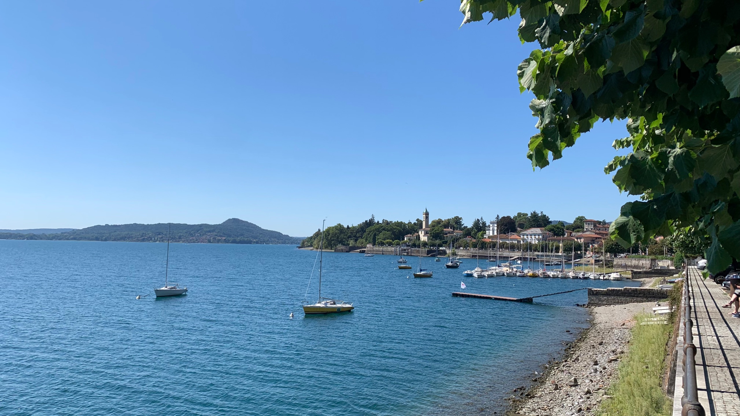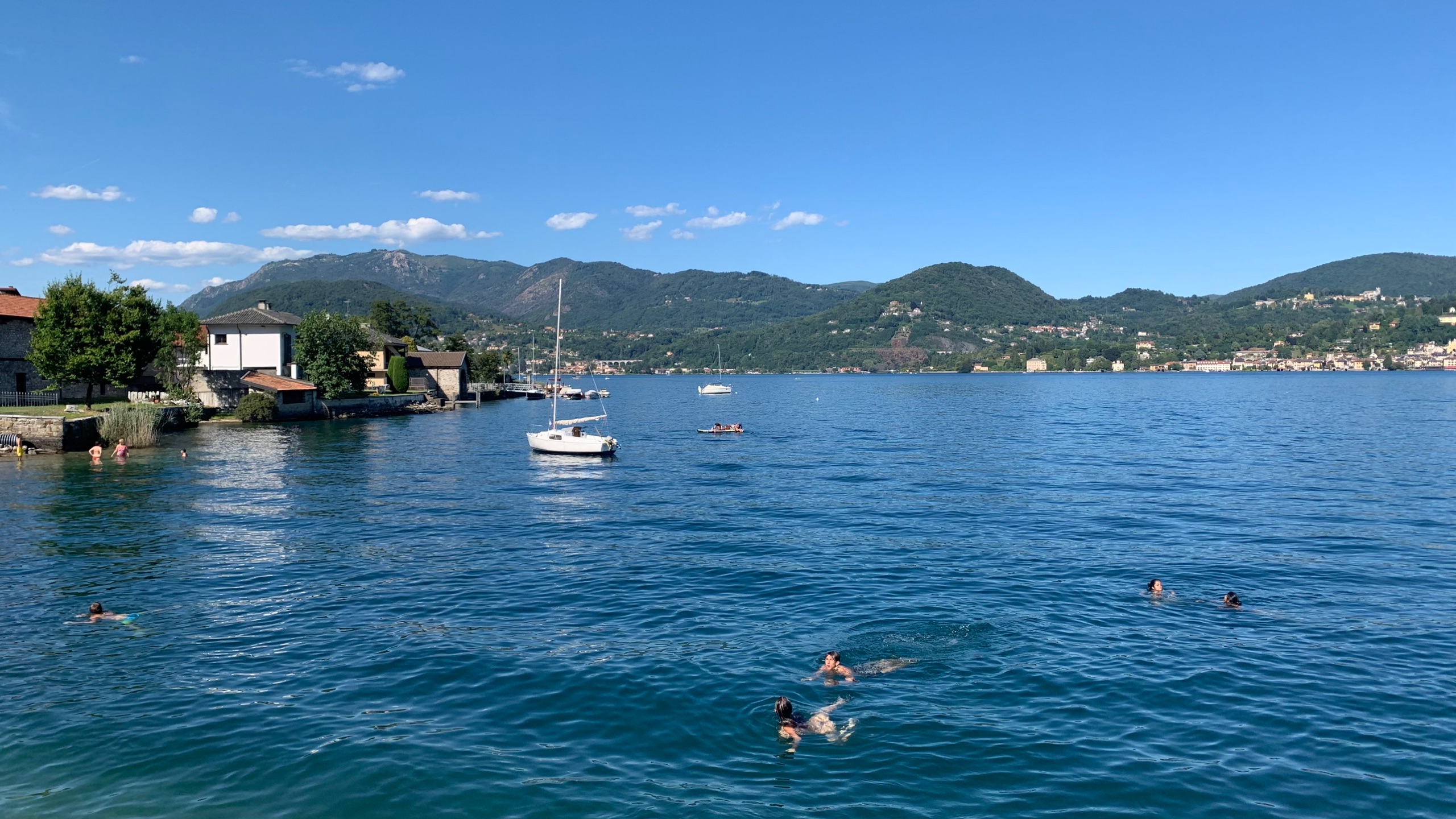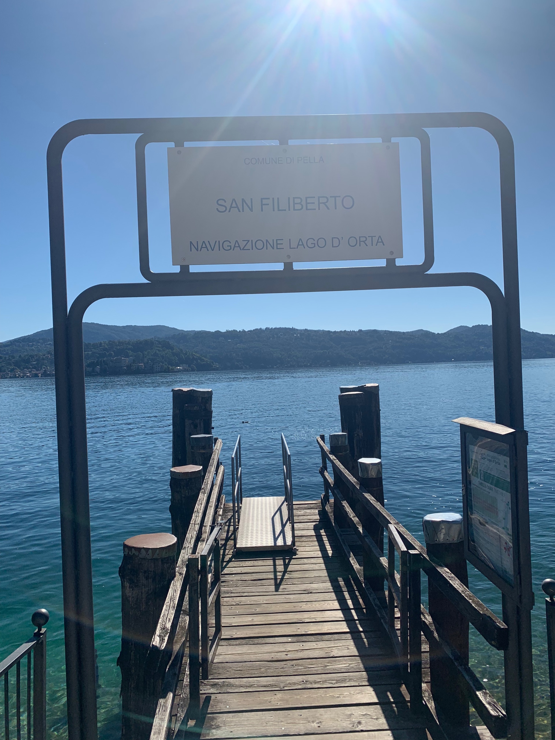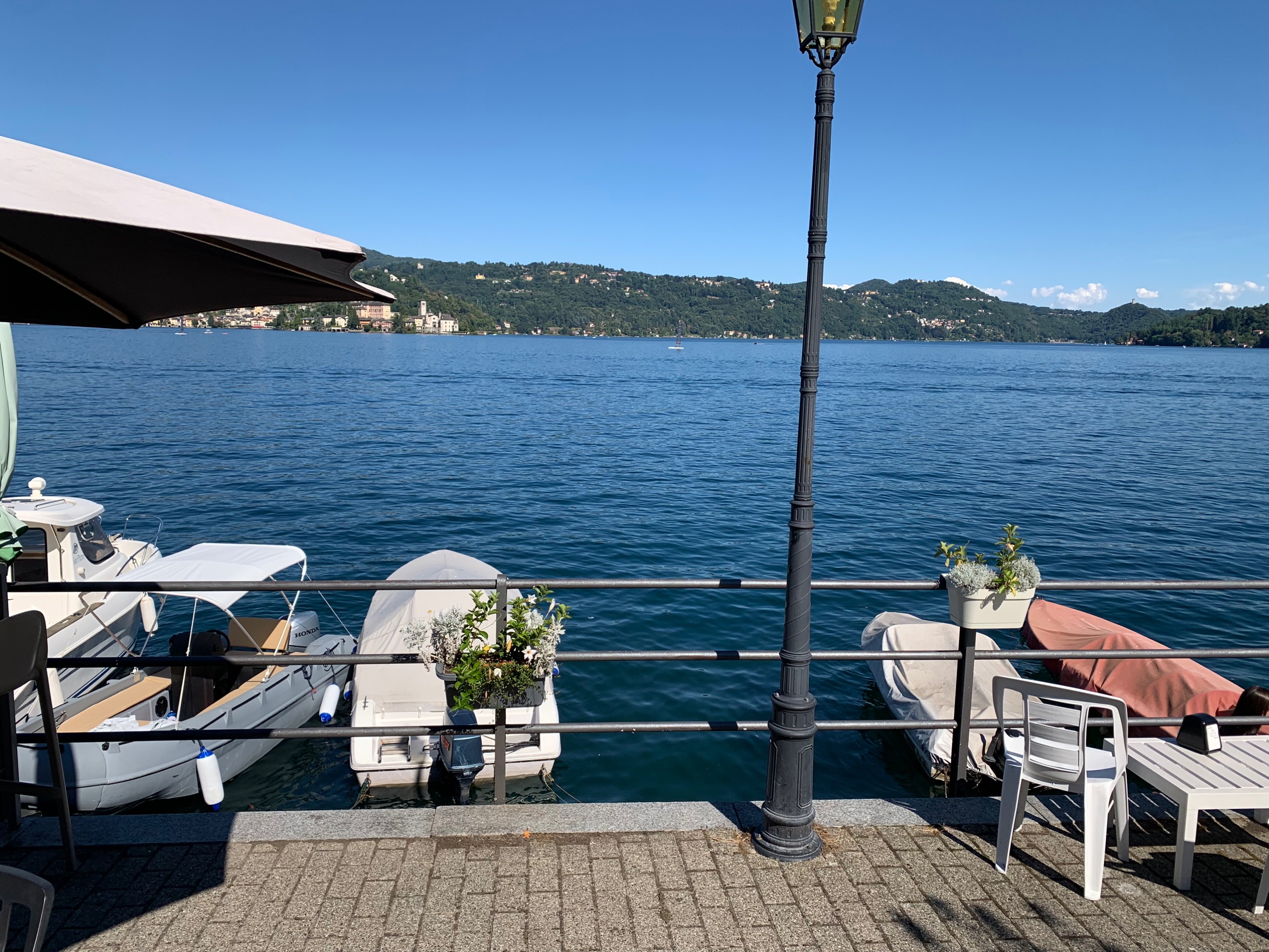 Als we het bekeken hebben stappen we op de boot naar Orta. Precies aan de overkant van het meer. Een gezellig plaatsje met heel smalle straatjes en leuke terrasjes en winkeltjes. Als we uitgekeken zijn stappen we weer op de boot naar ons beginpunt. San Filiberto. Hier staan we vlakbij met de camper. Het mooie heldere water van het meer lokt. Dus ook nog even een frisse duik.