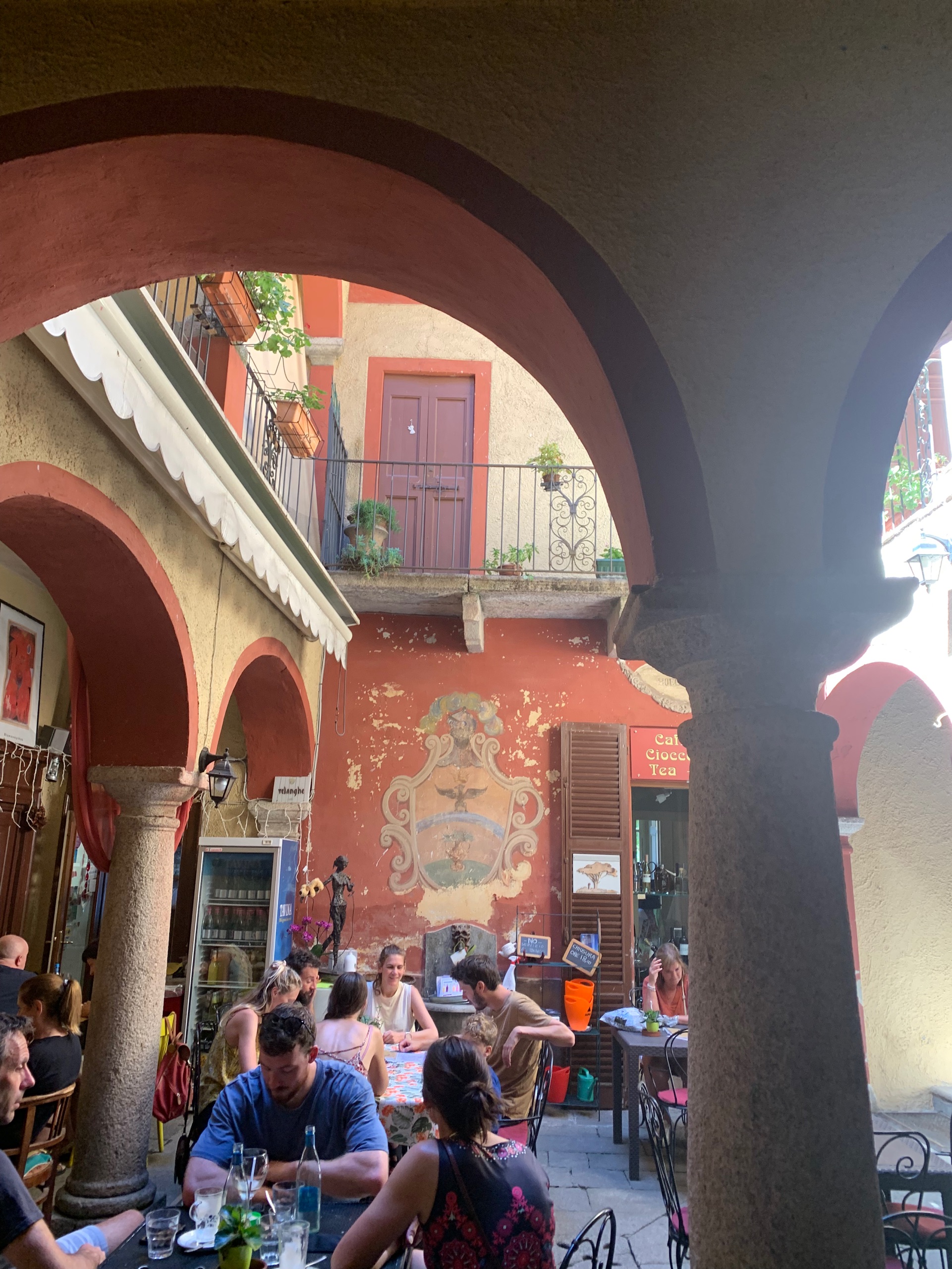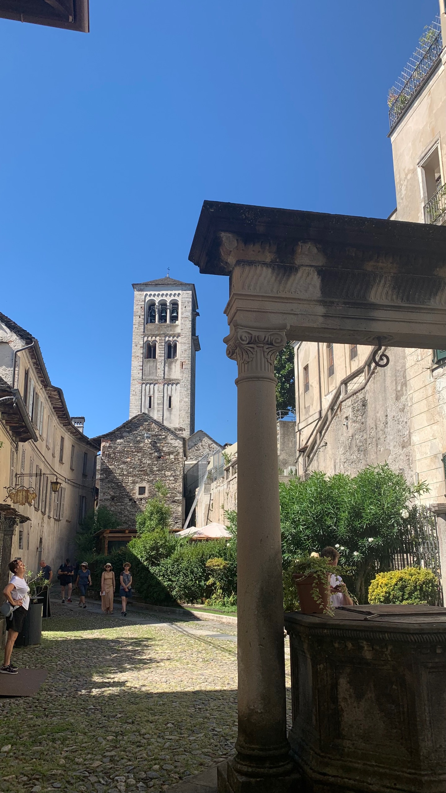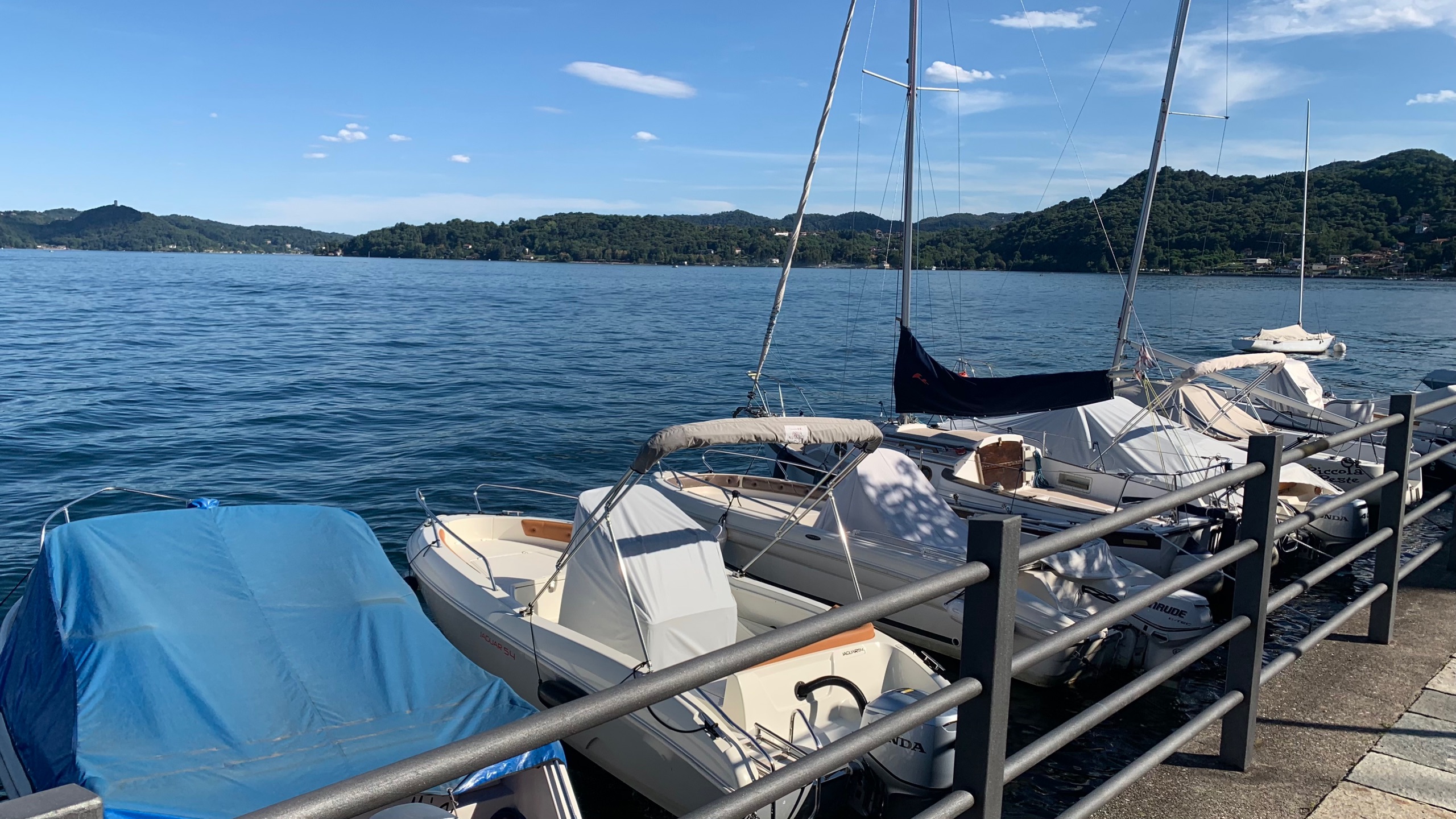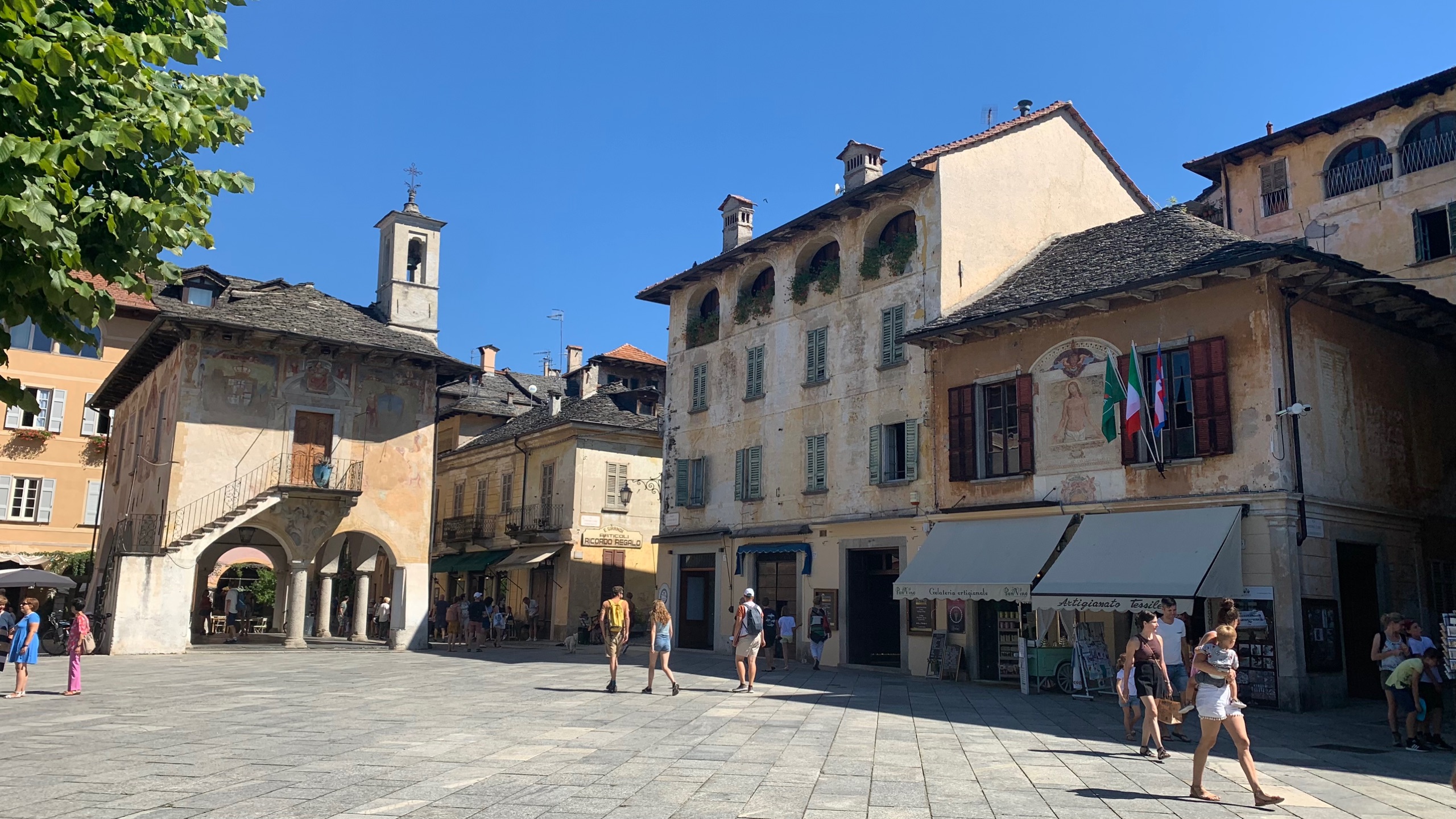 Als we het bekeken hebben stappen we op de boot naar Orta. Precies aan de overkant van het meer. Een gezellig plaatsje met heel smalle straatjes en leuke terrasjes en winkeltjes. Als we uitgekeken zijn stappen we weer op de boot naar ons beginpunt. San Filiberto. Hier staan we vlakbij met de camper. Het mooie heldere water van het meer lokt. Dus ook nog even een frisse duik.