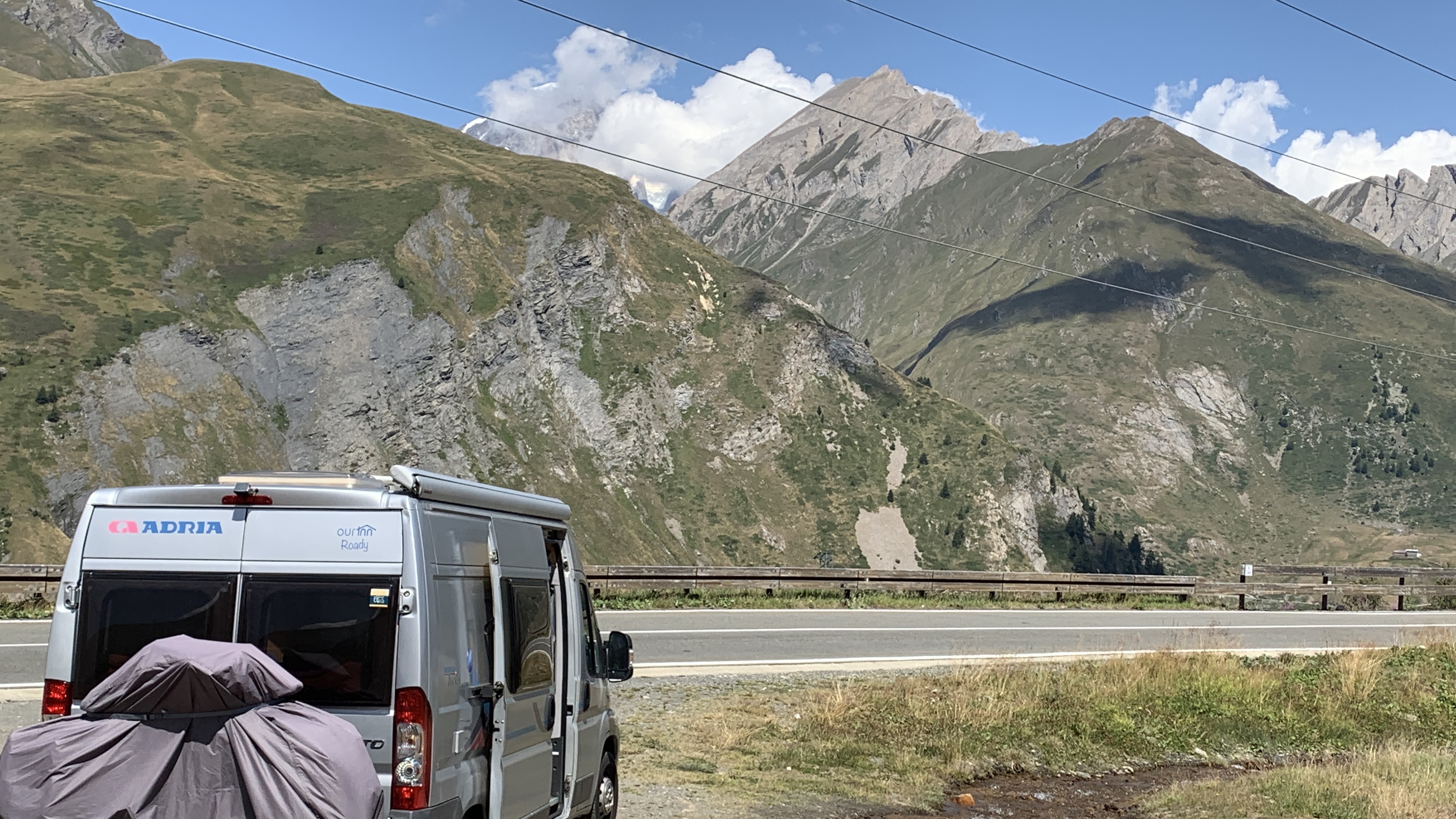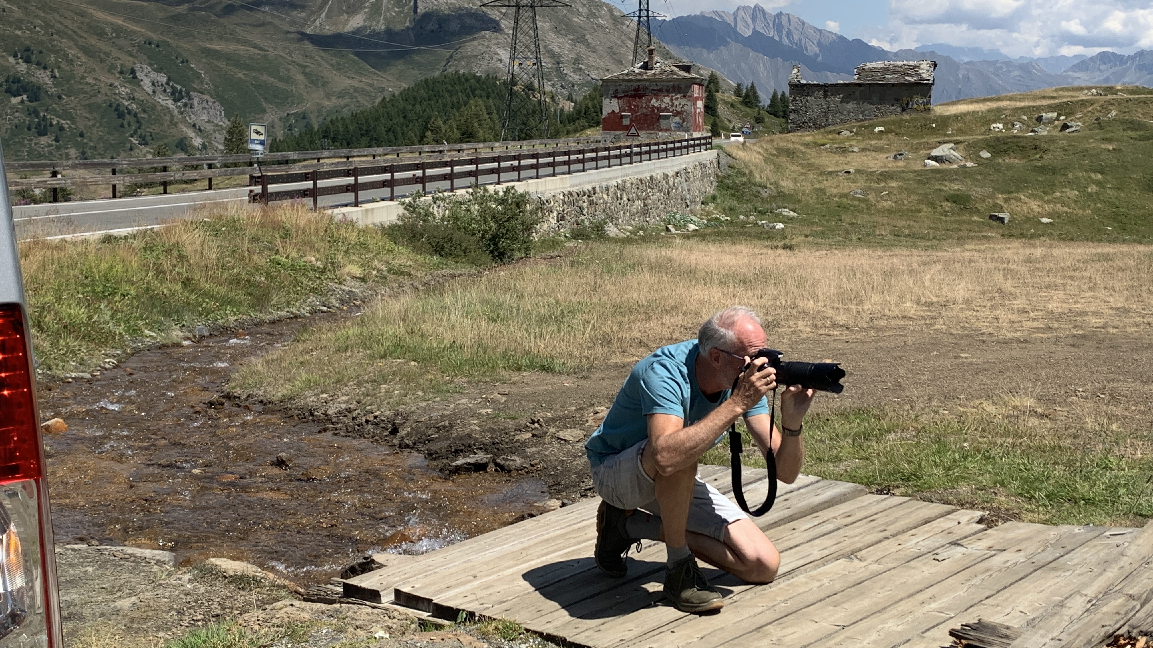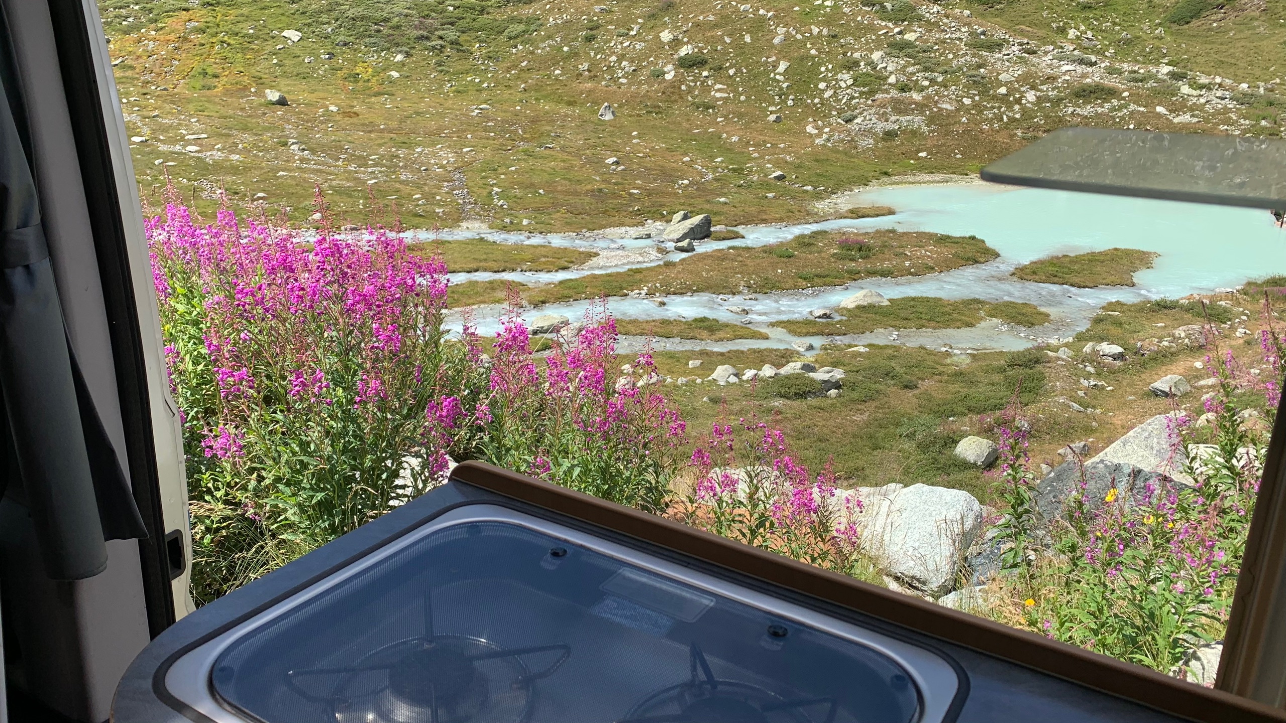 We hebben een wat onrustige nacht gehad. Het is niet anders. We rijden naar de kleine St. Bernhard pas. We dachten die al eens gereden te hebben maar dat is toch niet zo. Dat is leuk! Het is een mooie route. Uitzicht op de sneeuw van de Mont Blanc. Prachtig, maar de sneeuw lijkt wel magertjes. We vinden een leuk plekje naast een stroompje. Heerlijk gezeten om te lunchen en lekker lang te lezen, met zo’n uitzicht!