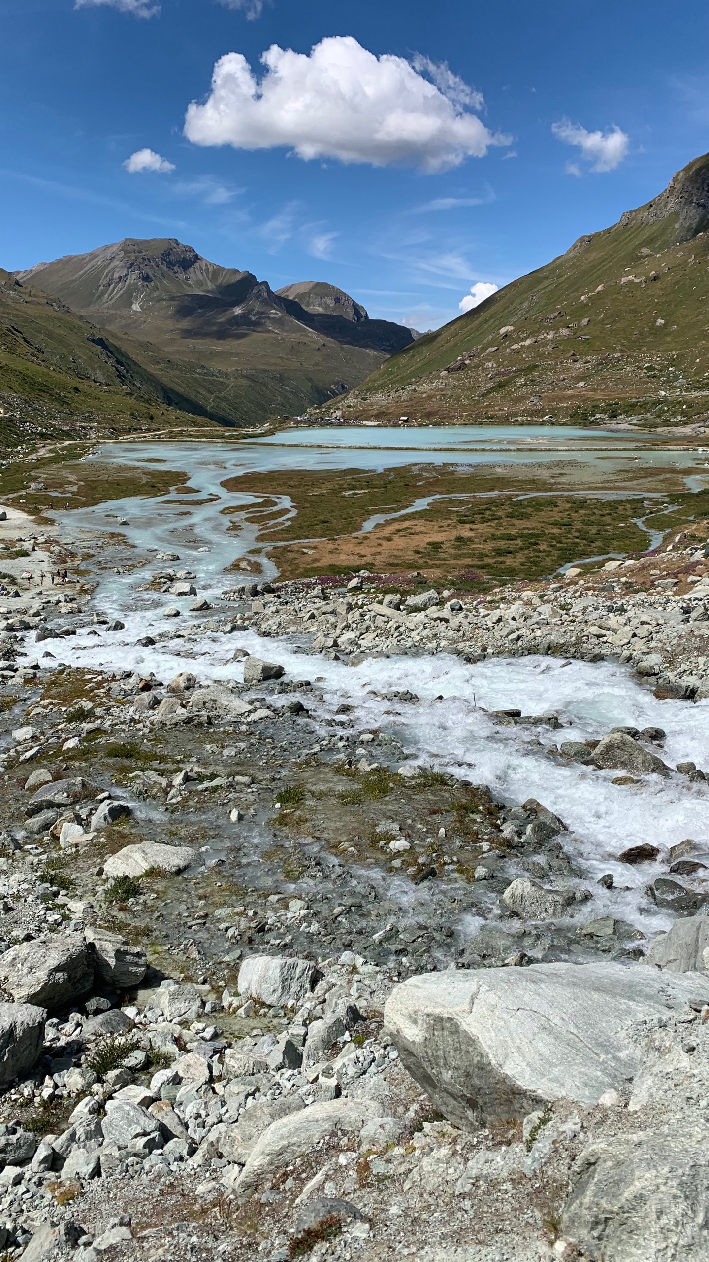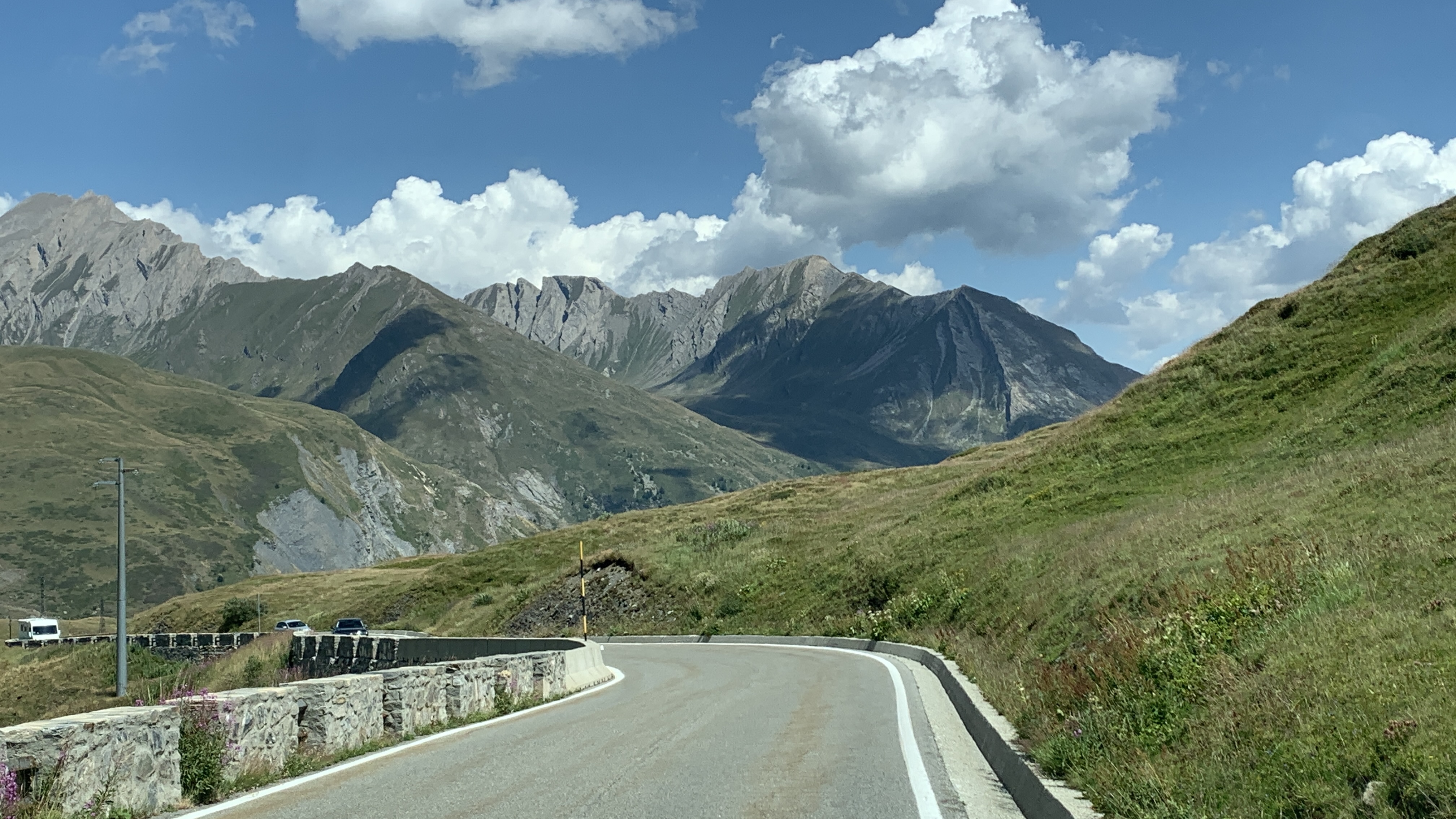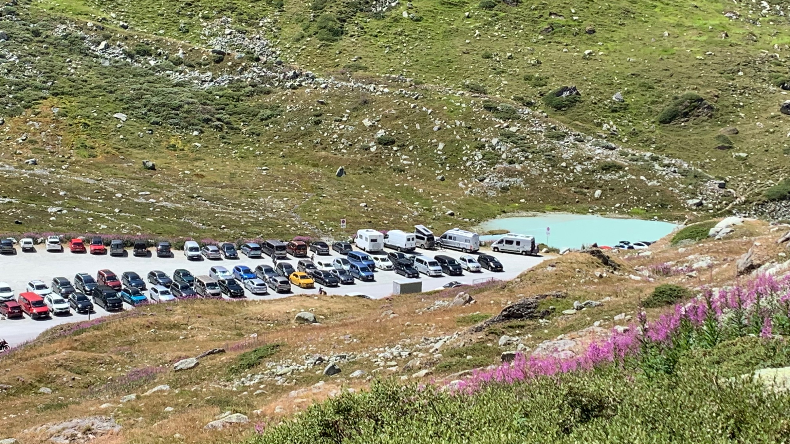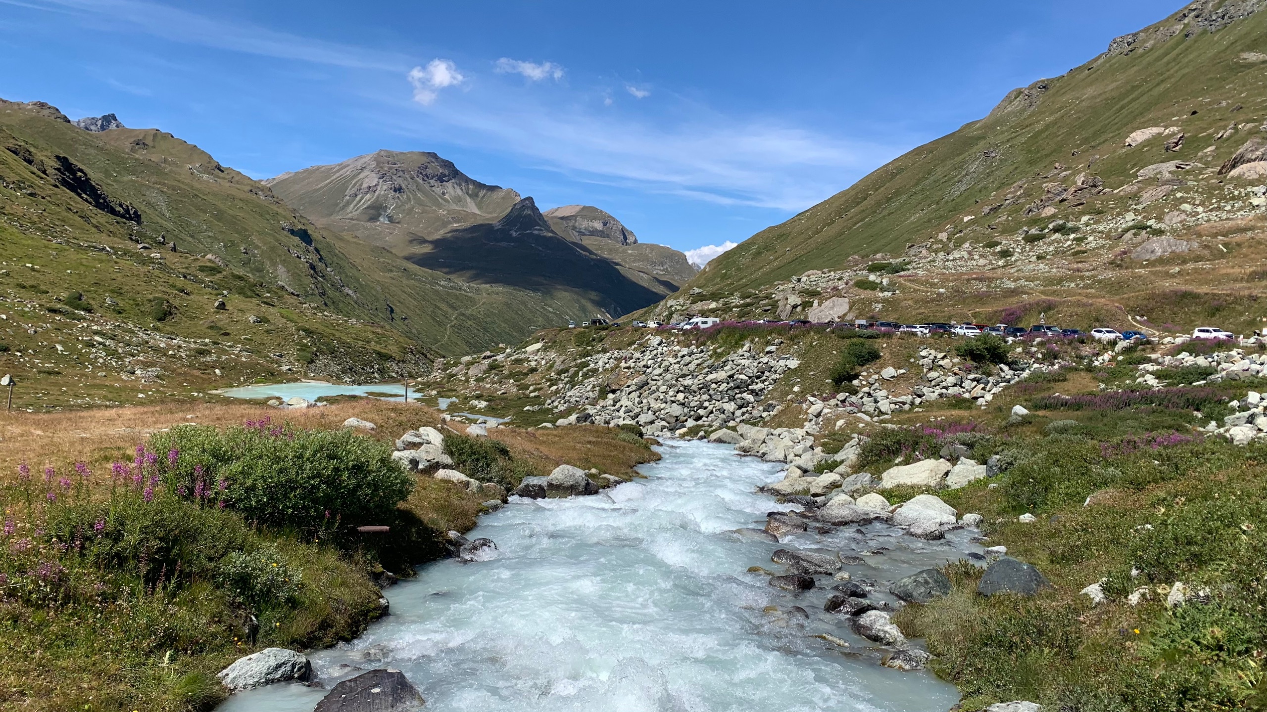 We hebben een wat onrustige nacht gehad. Het is niet anders. We rijden naar de kleine St. Bernhard pas. We dachten die al eens gereden te hebben maar dat is toch niet zo. Dat is leuk! Het is een mooie route. Uitzicht op de sneeuw van de Mont Blanc. Prachtig, maar de sneeuw lijkt wel magertjes. We vinden een leuk plekje naast een stroompje. Heerlijk gezeten om te lunchen en lekker lang te lezen, met zo’n uitzicht!