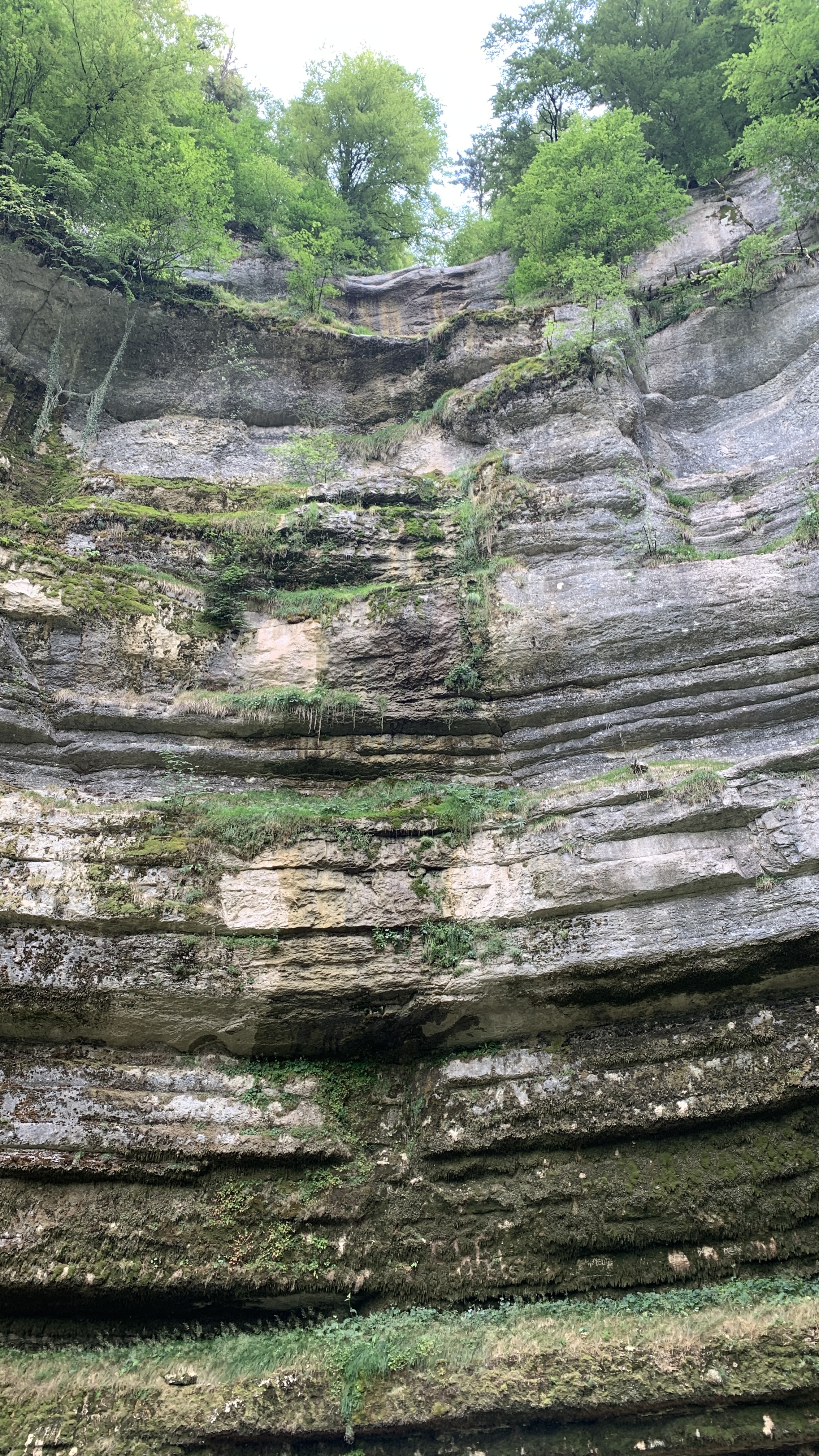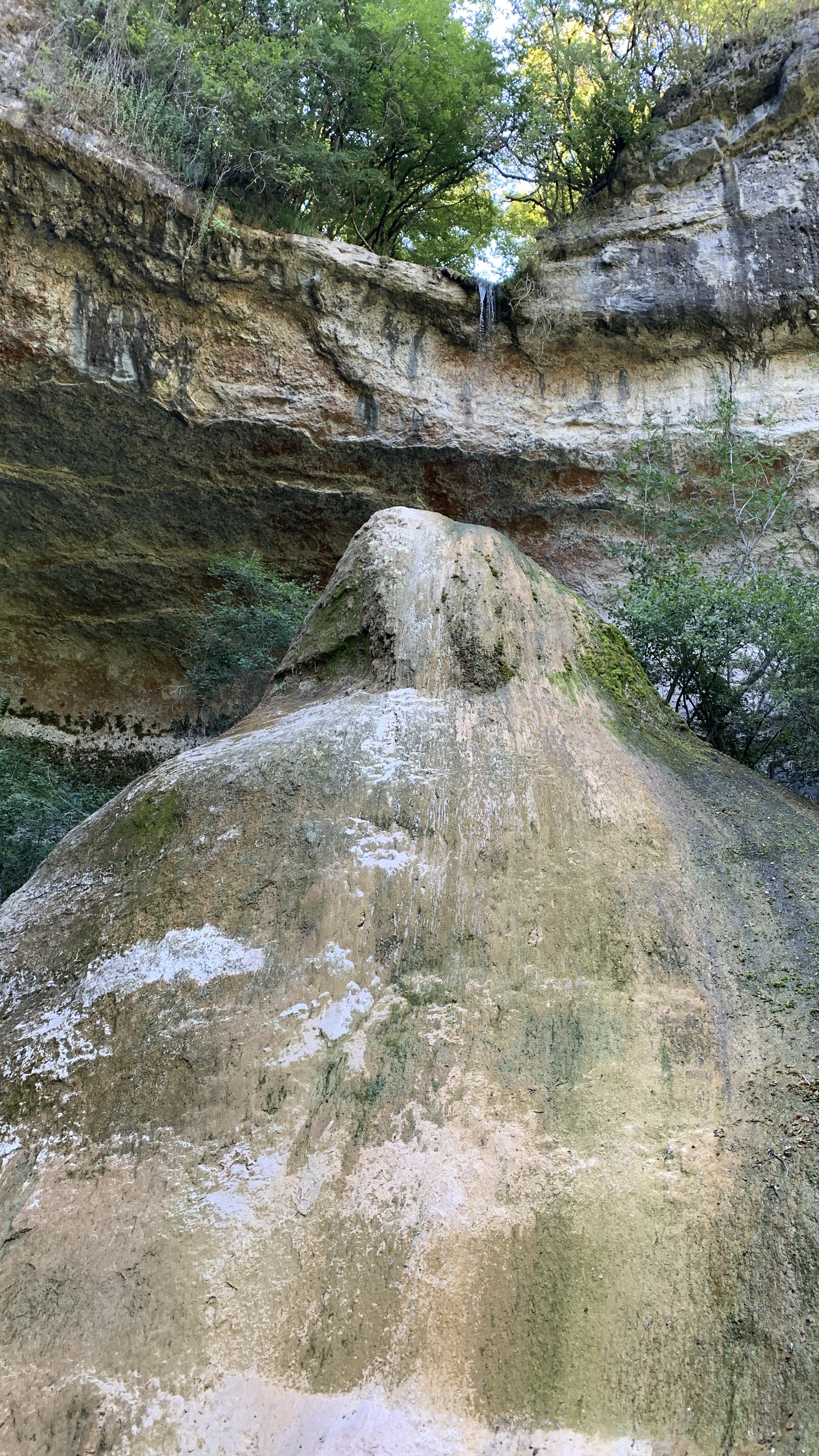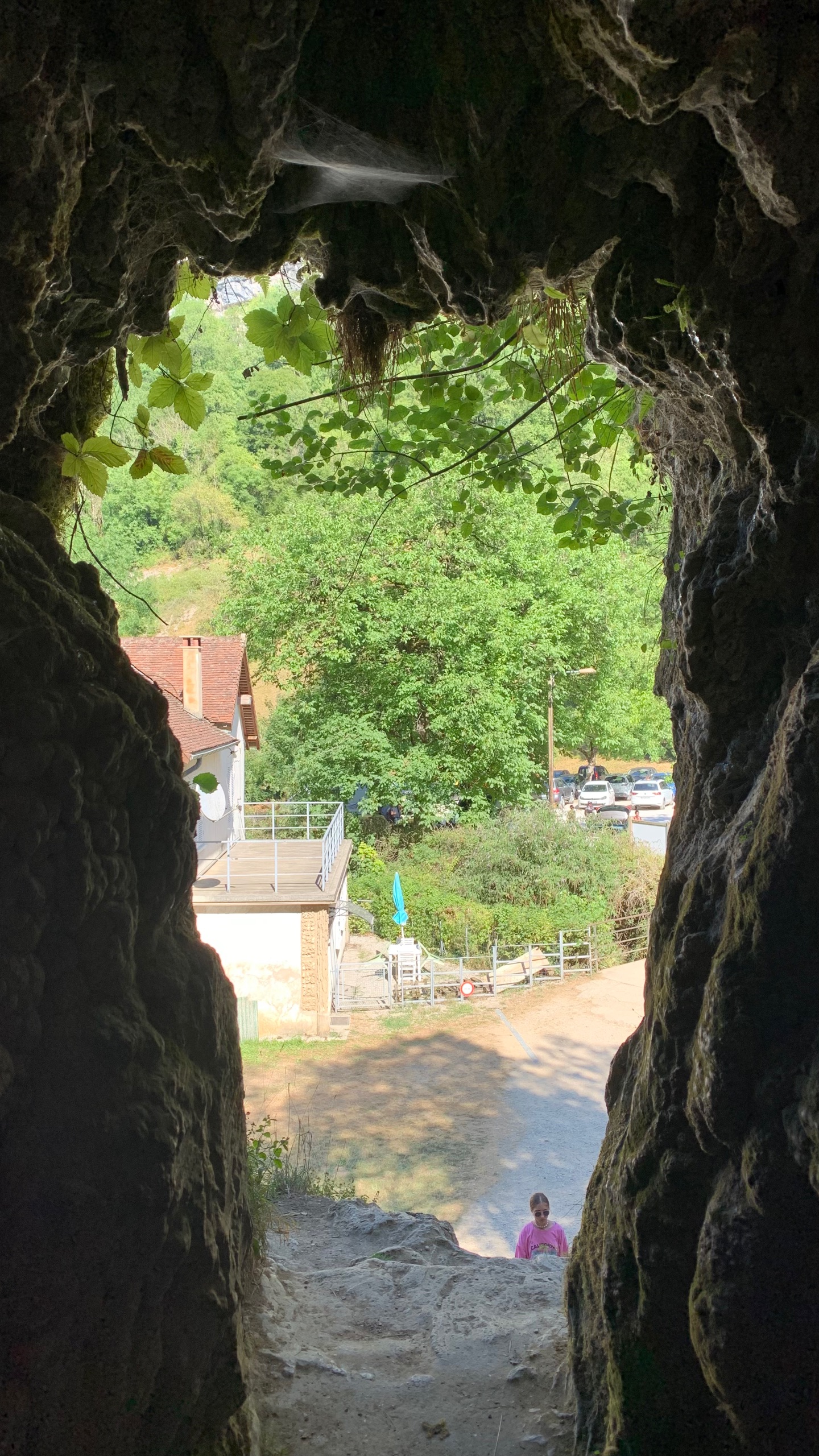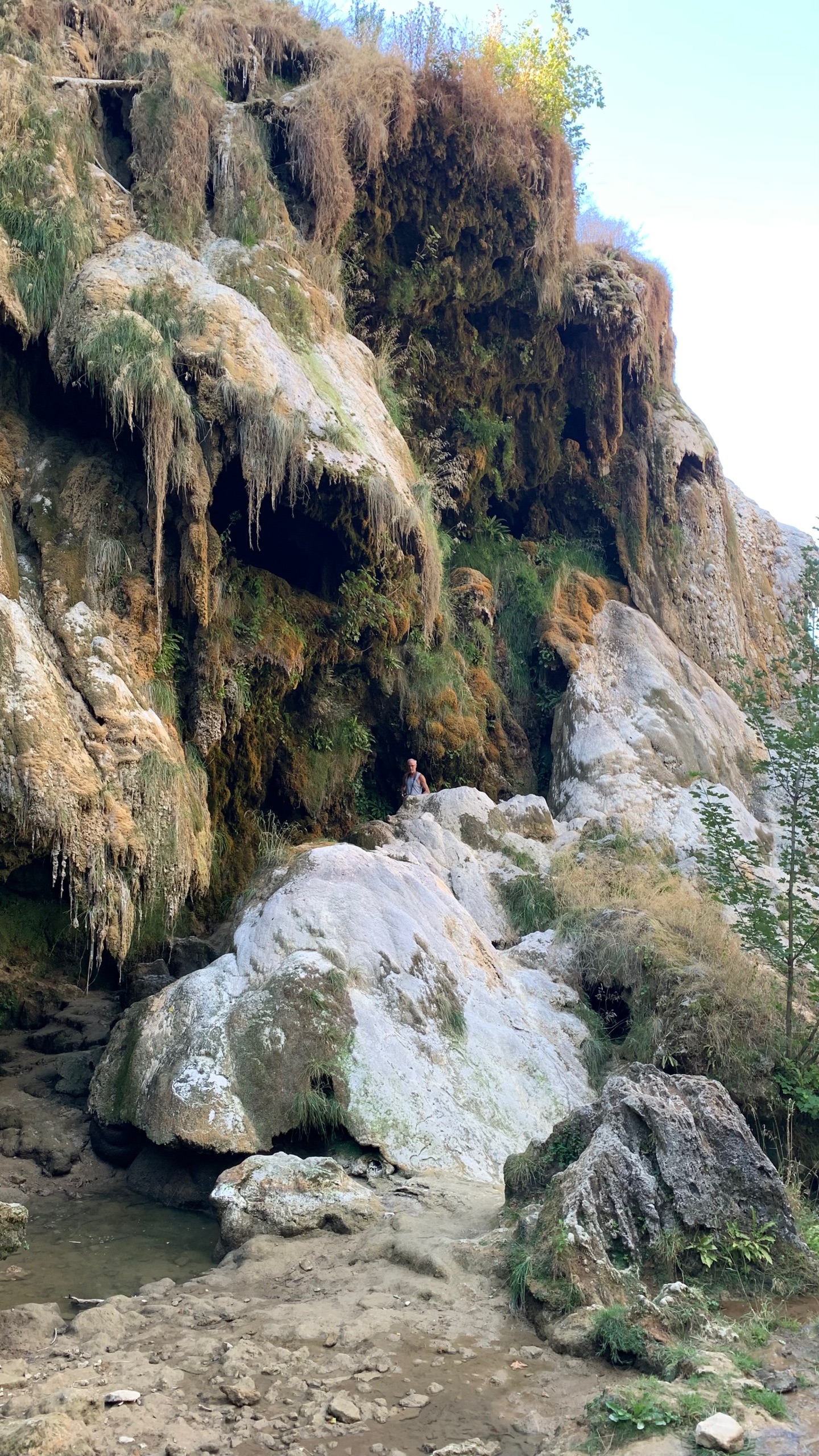 Dan rijden we naar een FP bij Baume les Messieurs. Daar eigenlijk hetzelfde als bij de wijnboer. We rijden door naar Baume zelf. Grotten en een waterval. De rivier die er vandaan komt is kurk en kurk droog. Van een waterval zal dus wel geen sprake zijn. En dat klopt. Maar bijzonder genoeg is de droge waterval prachtig. Omdat je gewoon over de bodem van de rivier kunt lopen kun je helemaal naar de rotsen waar anders het water af komt. Prachtig.