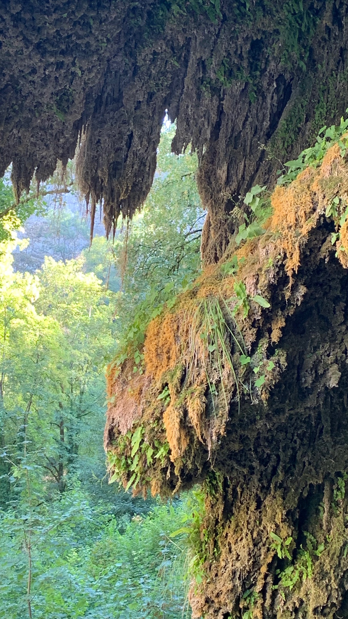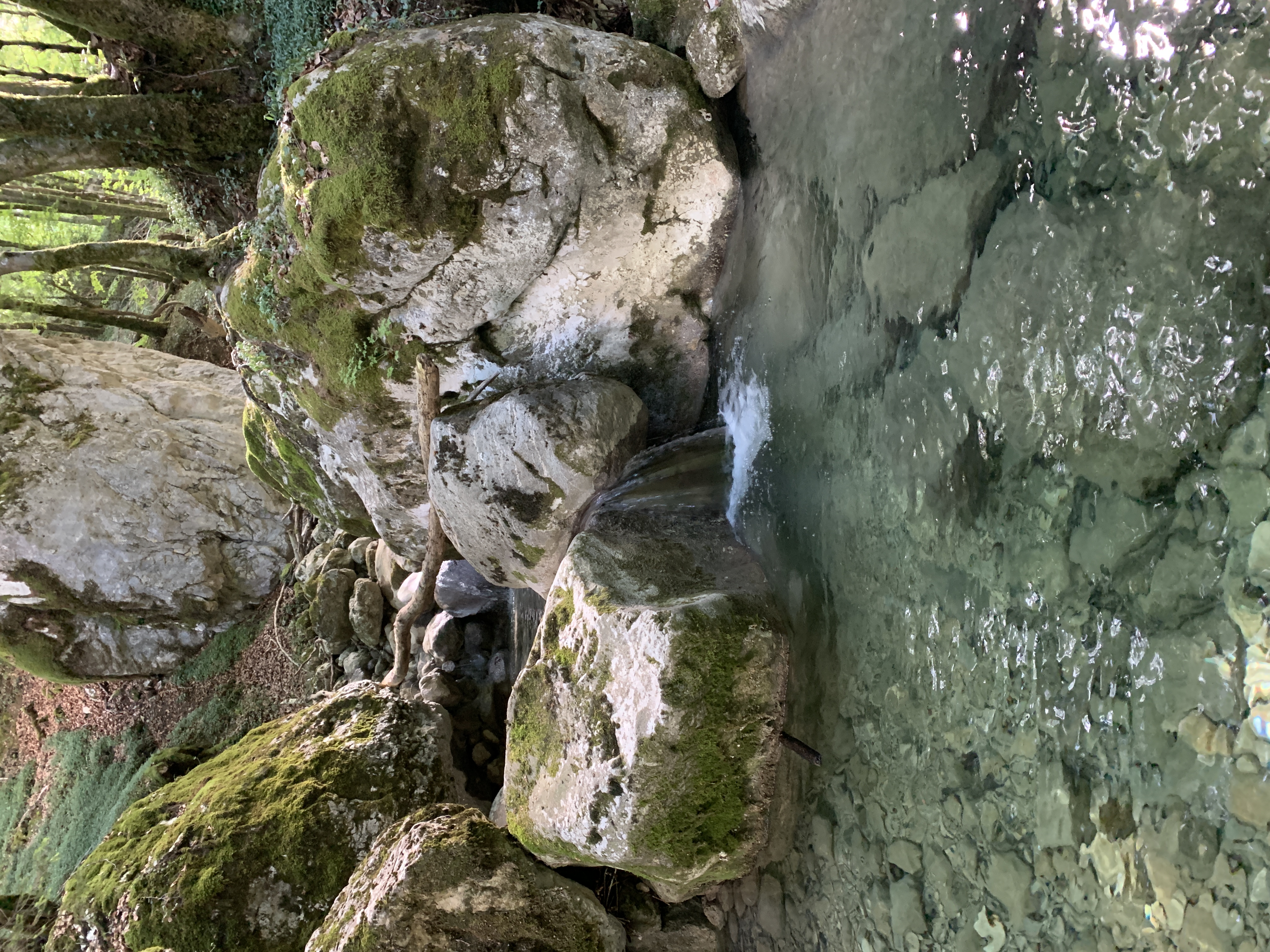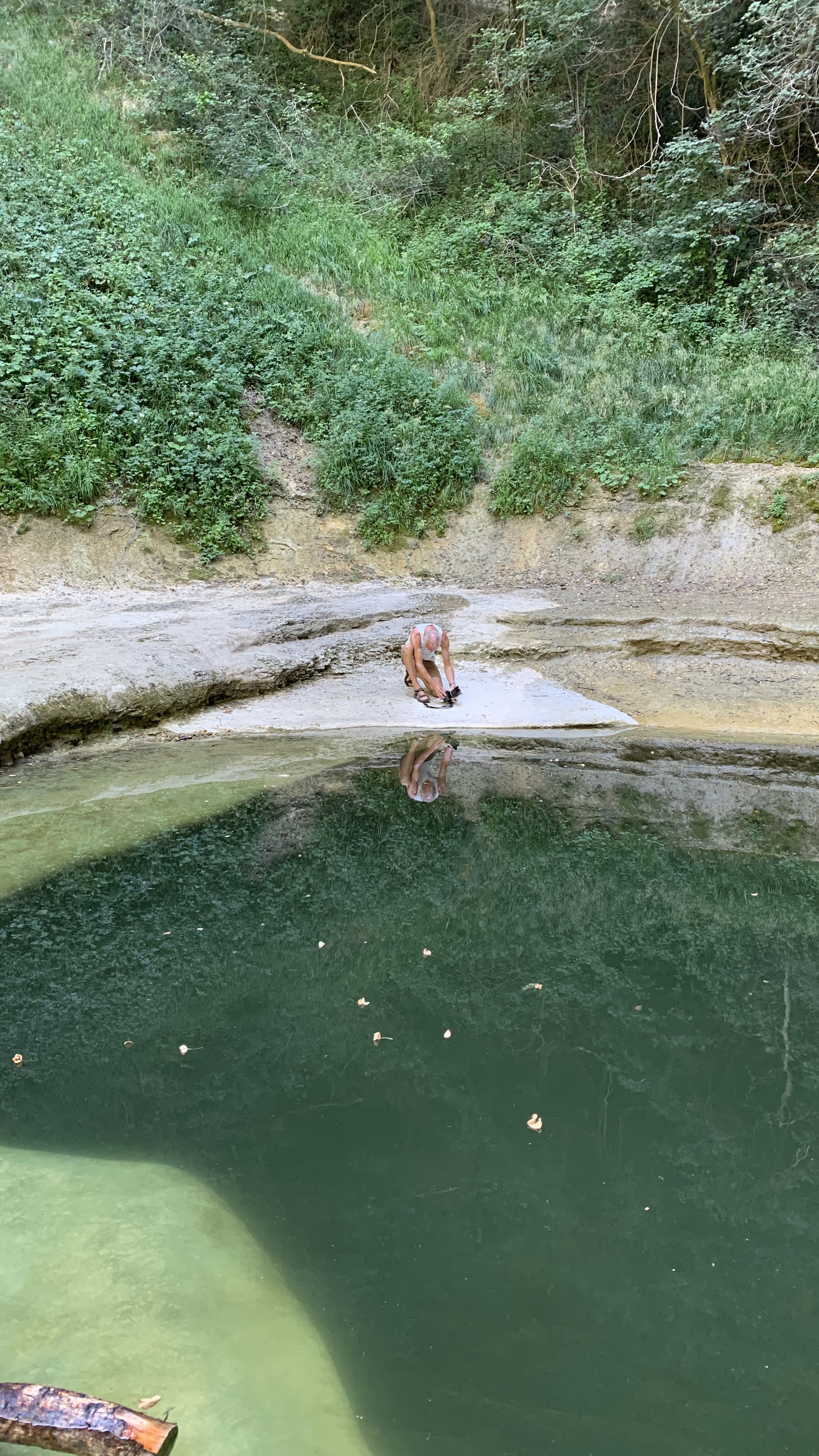 Dan rijden we naar een FP bij Baume les Messieurs. Daar eigenlijk hetzelfde als bij de wijnboer. We rijden door naar Baume zelf. Grotten en een waterval. De rivier die er vandaan komt is kurk en kurk droog. Van een waterval zal dus wel geen sprake zijn. En dat klopt. Maar bijzonder genoeg is de droge waterval prachtig. Omdat je gewoon over de bodem van de rivier kunt lopen kun je helemaal naar de rotsen waar anders het water af komt. Prachtig.