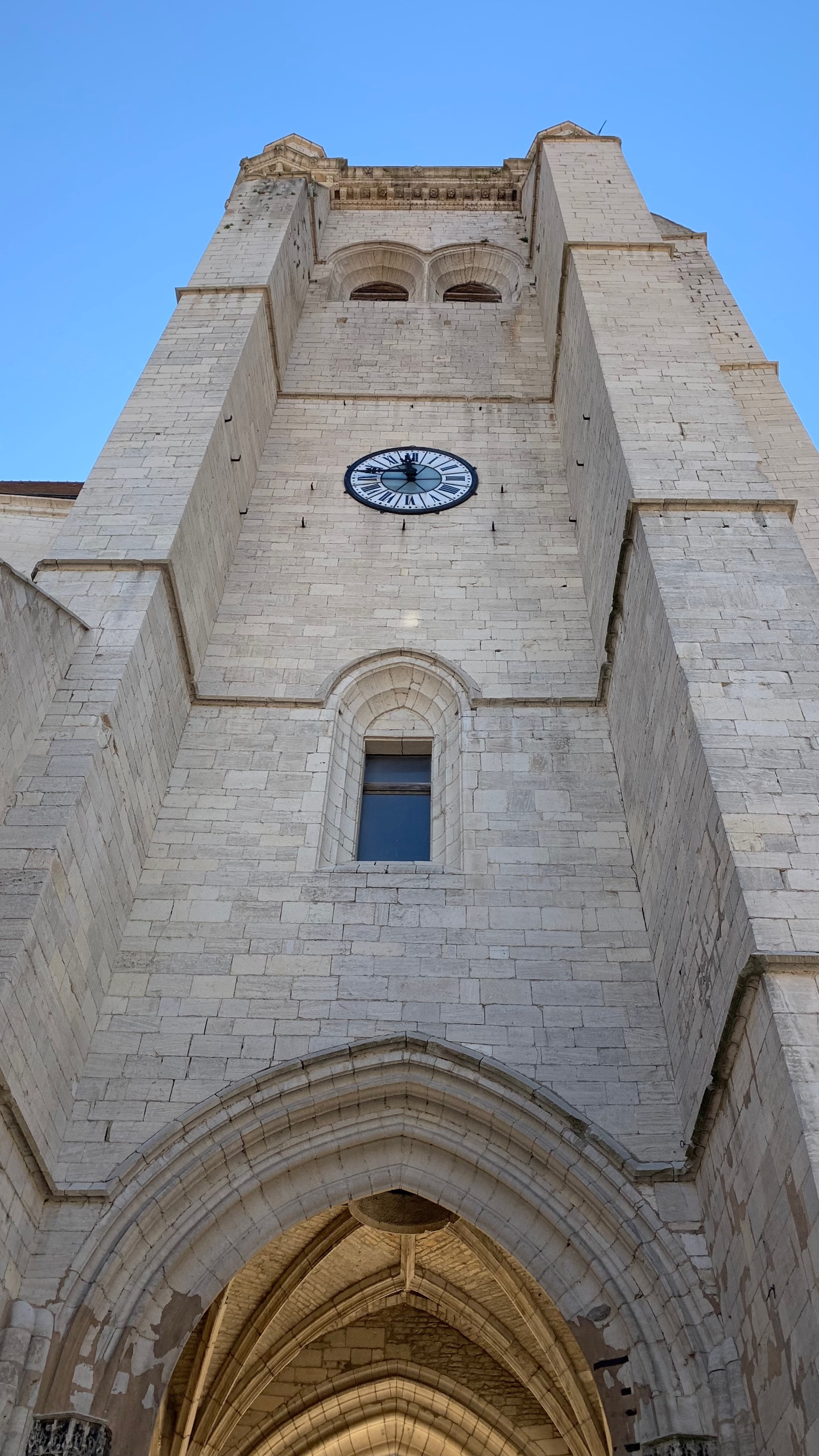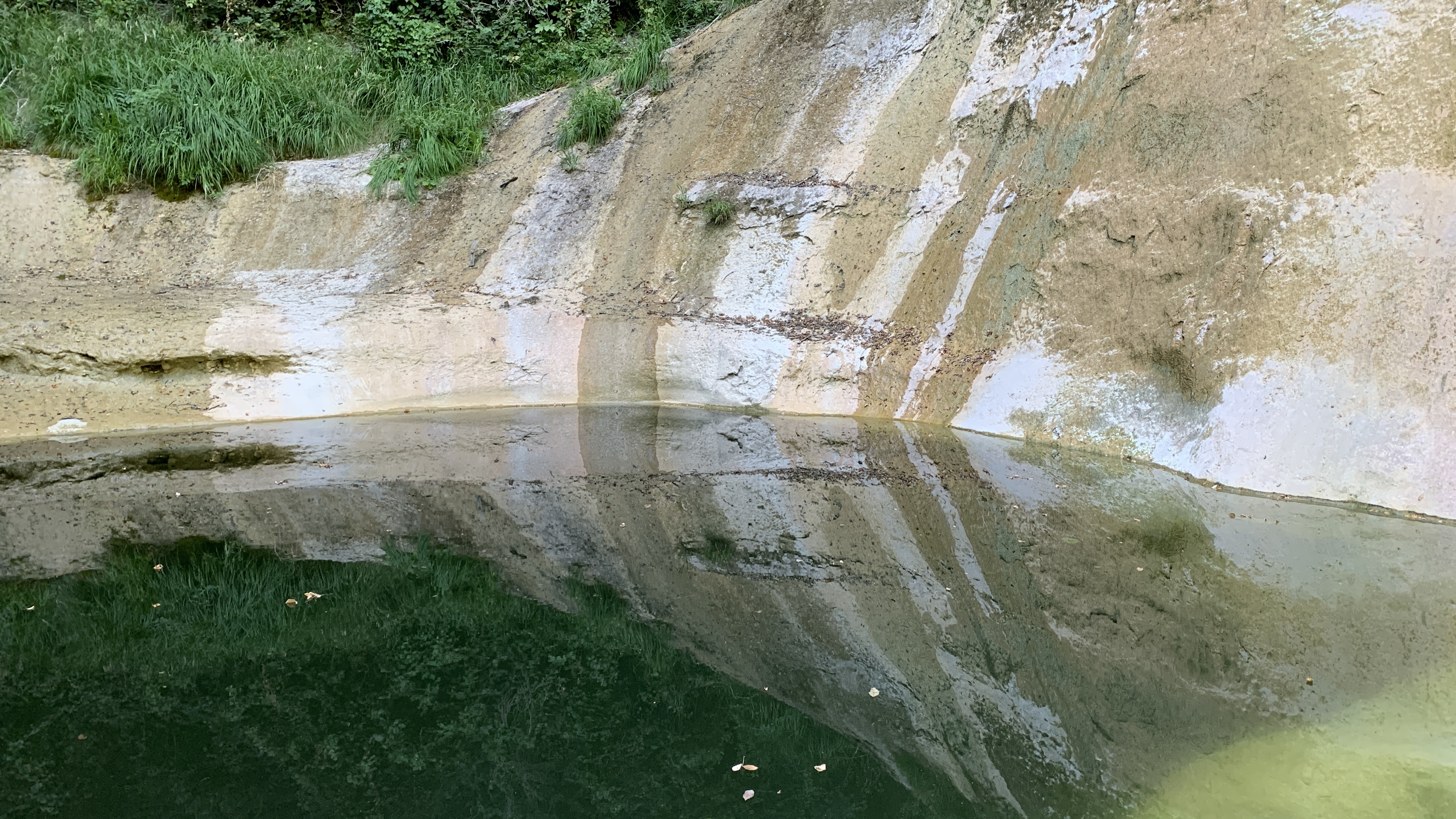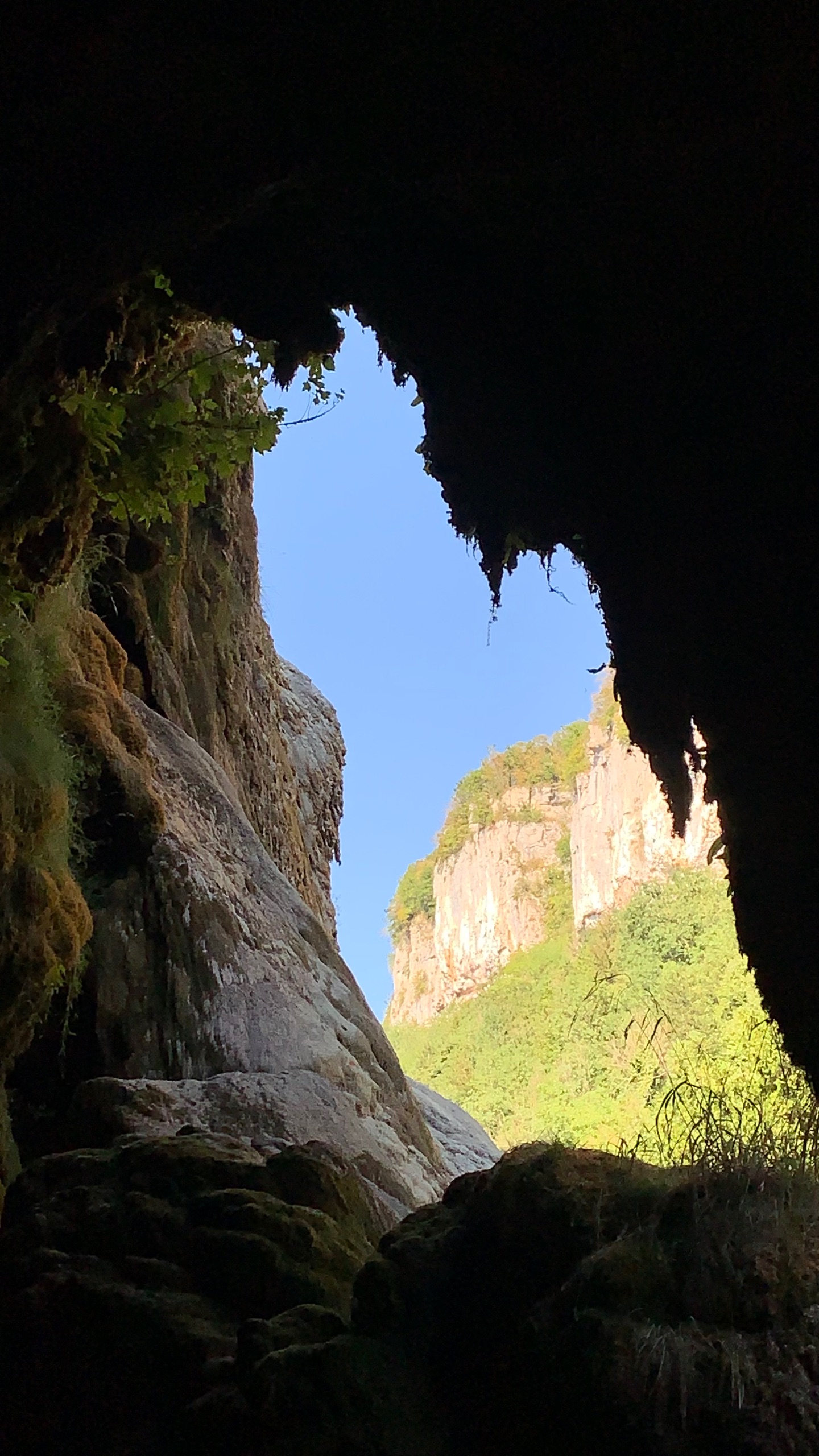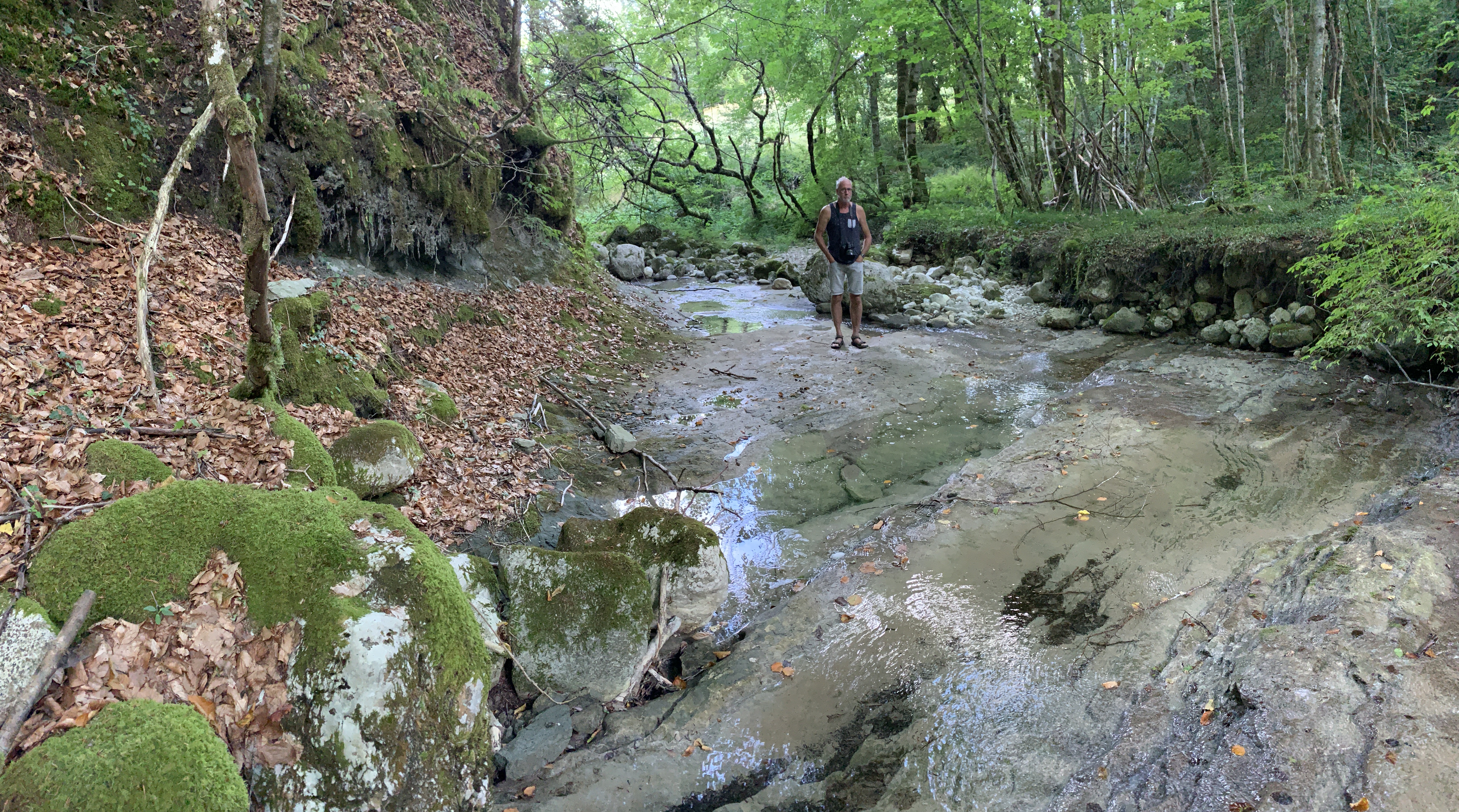 Dan rijden we naar een FP bij Baume les Messieurs. Daar eigenlijk hetzelfde als bij de wijnboer. We rijden door naar Baume zelf. Grotten en een waterval. De rivier die er vandaan komt is kurk en kurk droog. Van een waterval zal dus wel geen sprake zijn. En dat klopt. Maar bijzonder genoeg is de droge waterval prachtig. Omdat je gewoon over de bodem van de rivier kunt lopen kun je helemaal naar de rotsen waar anders het water af komt. Prachtig.