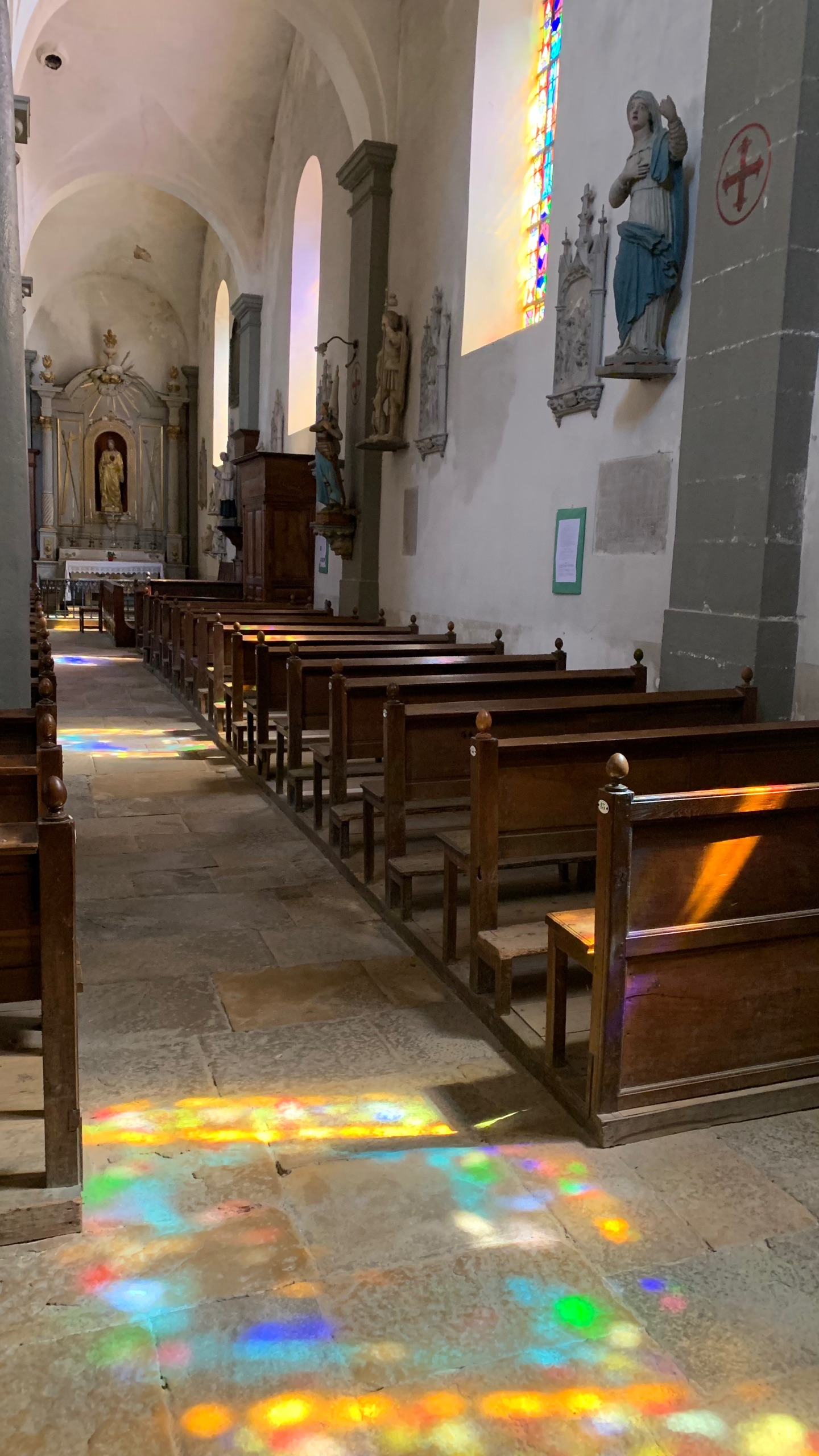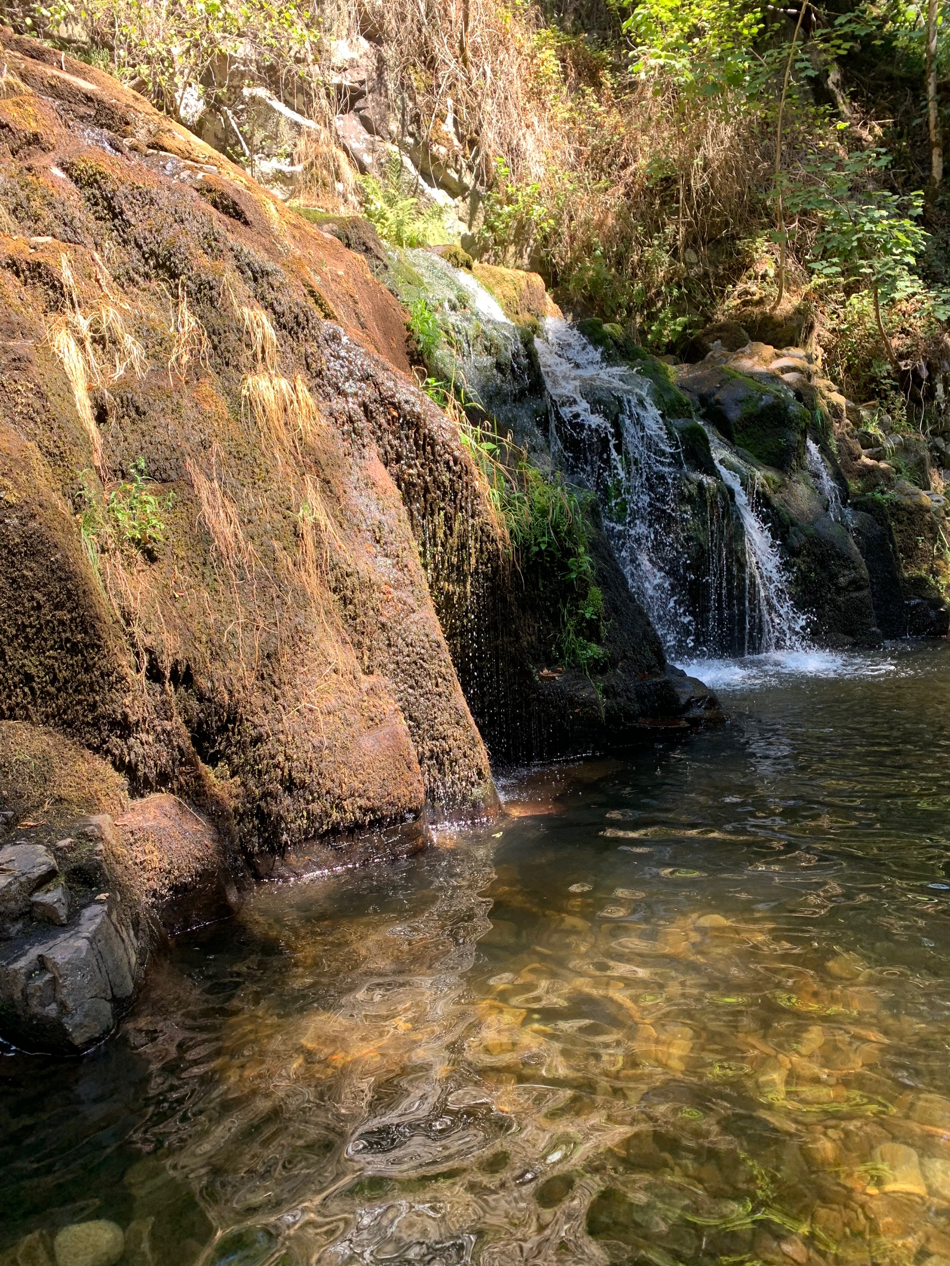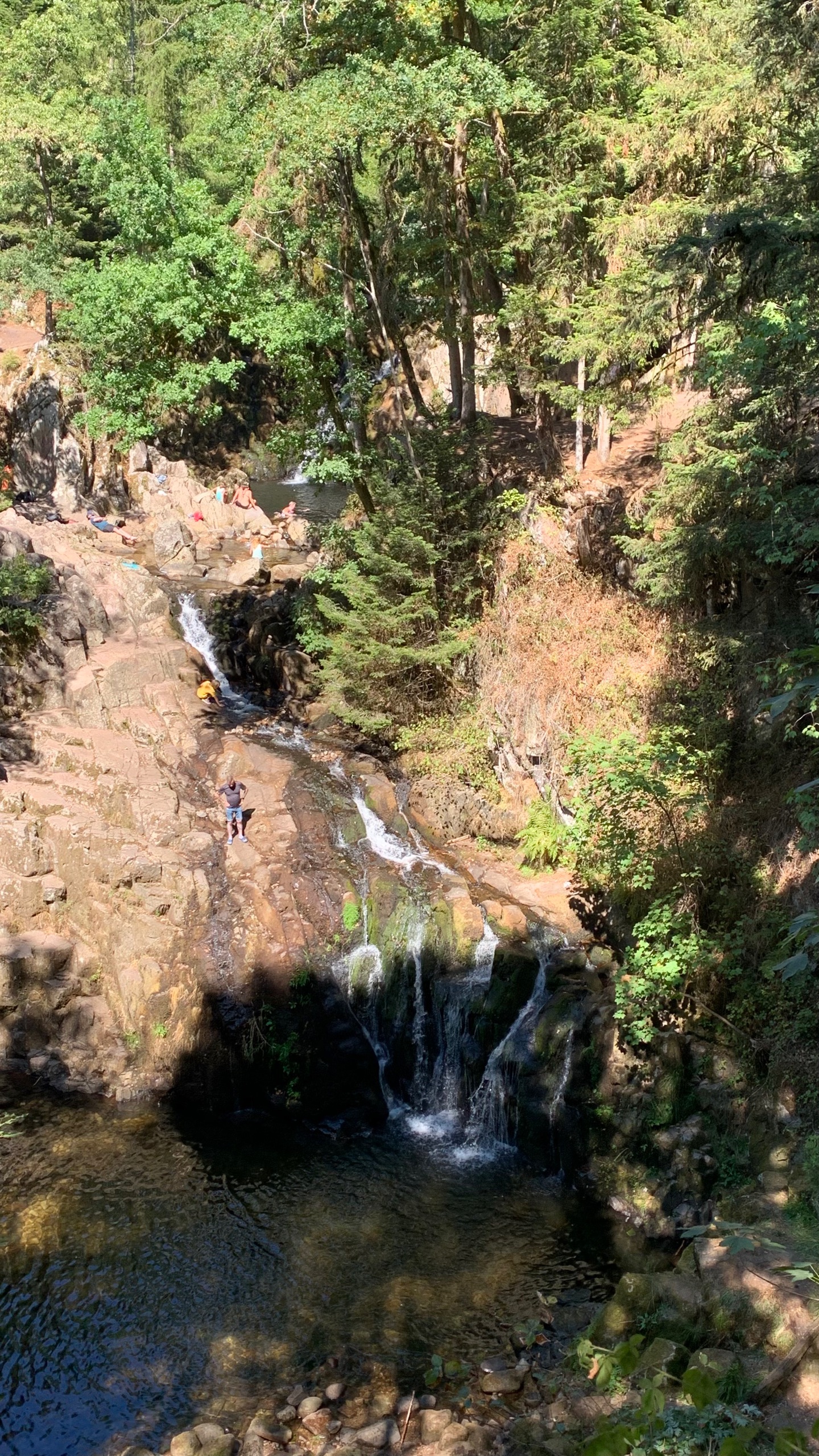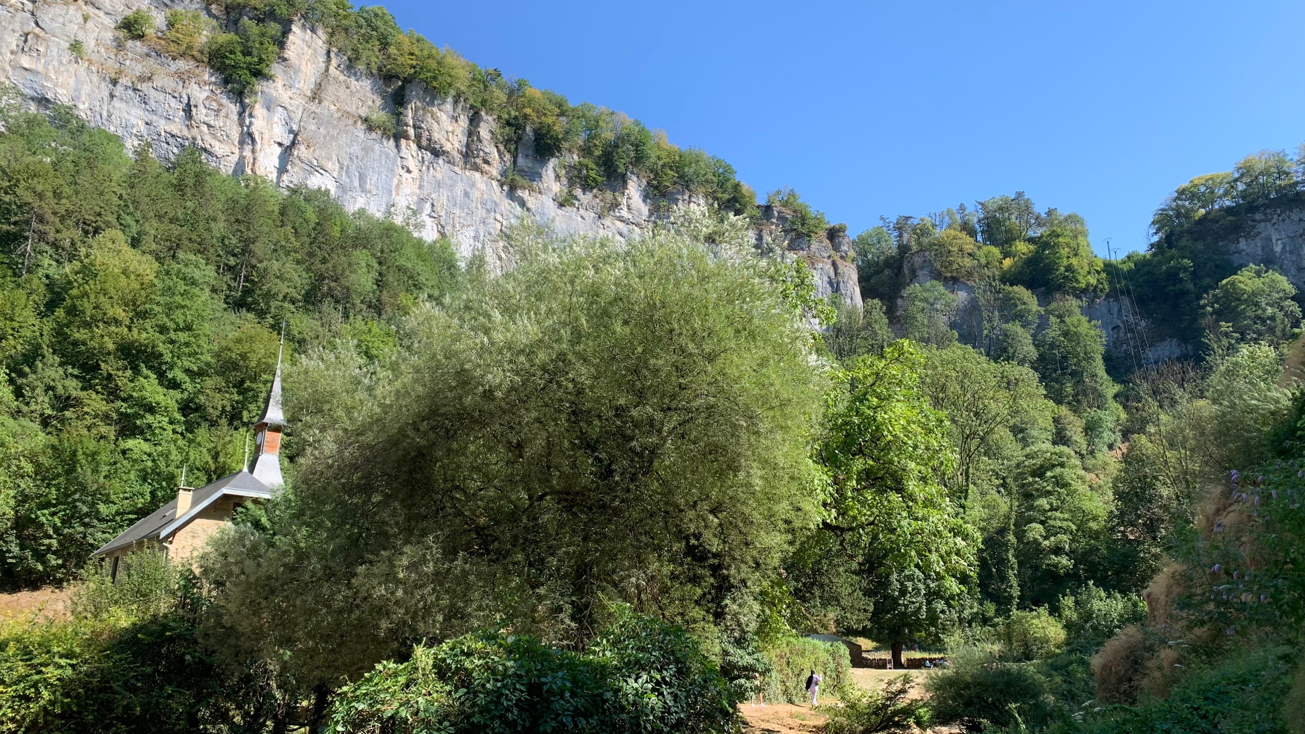 We stoppen voor de lunch in Notre-Dame-de-Consolation. Een stil plaatsje waar een klooster staat. Er is daar 👉 een kleine en een grote waterval. Schoenen aan en lopen. Omdat de zon niet zo fel schijnt en het een schaduwrijke route is, is het prima te doen. Maar…wat we wel een beetje verwachten, de groter waterval is , cascade du Lançot, helemaal droog, nou ja op een klein druppeltje na dan.