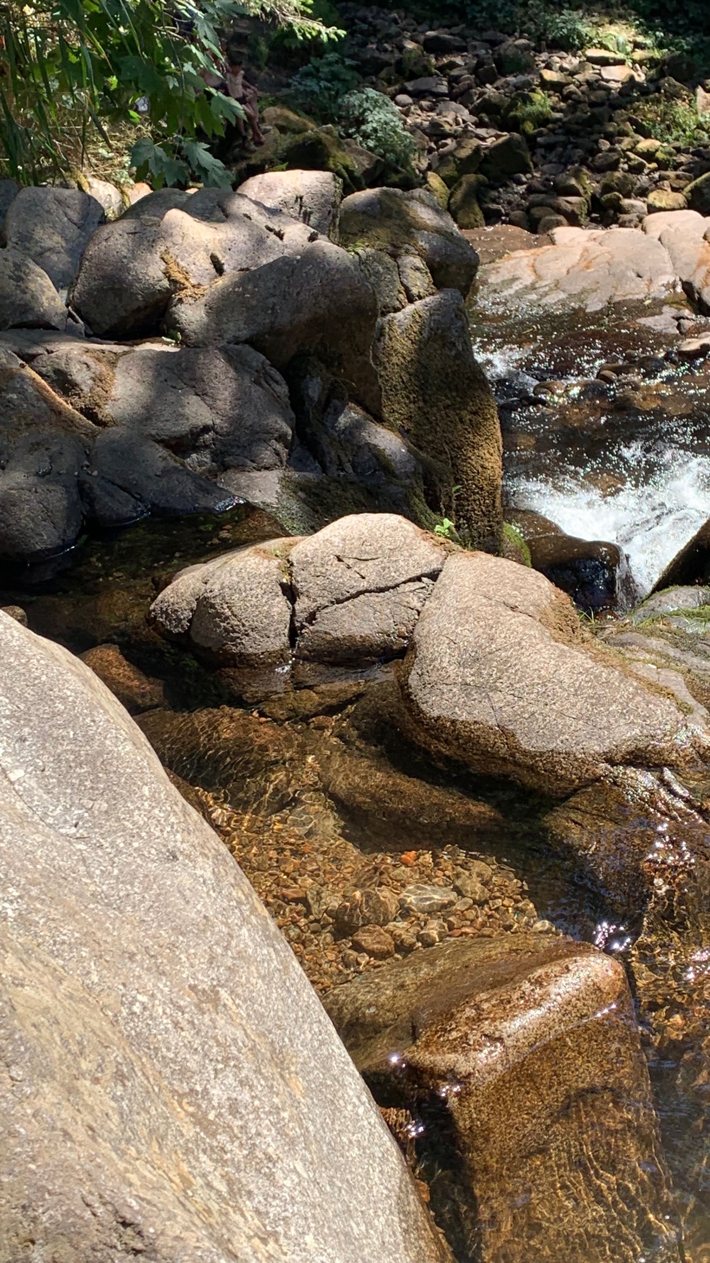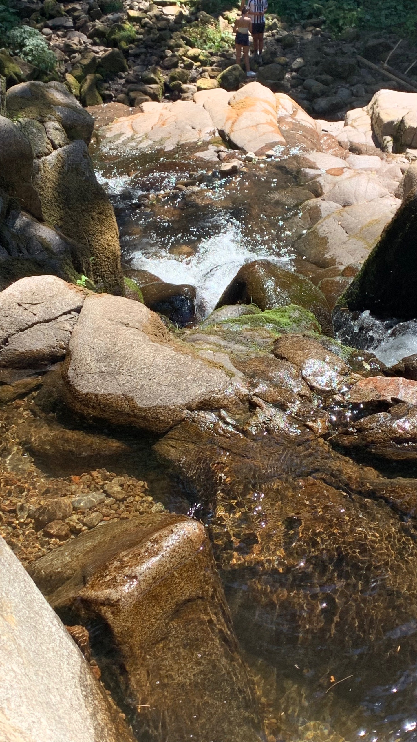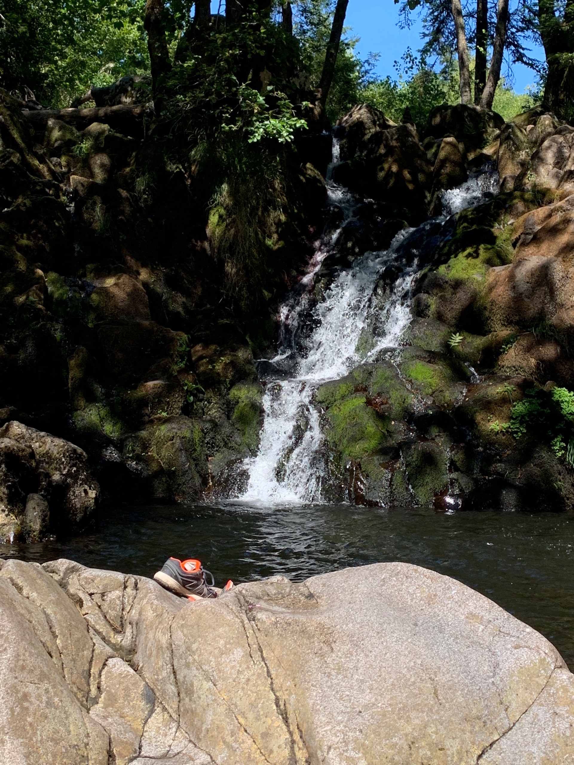 De volgende waterval is Saut du Bouchot. Hier komt genoeg water naar beneden en er zijn ook veel mensen die daarvan genieten. Je kan helemaal naar boven klimmen en als je wilt lekker zwemmen. Wij houden het deze keer bij pootje baden.