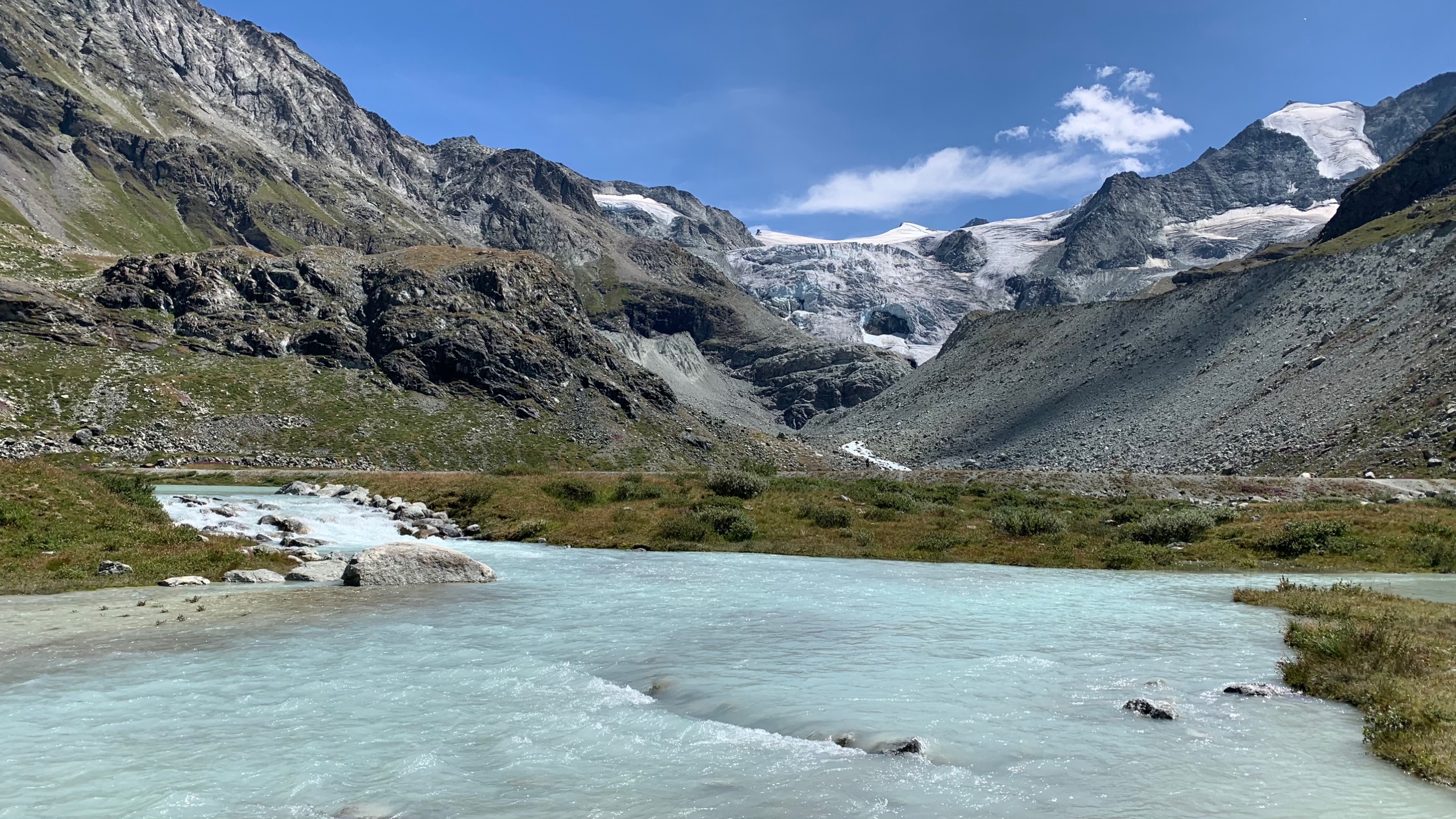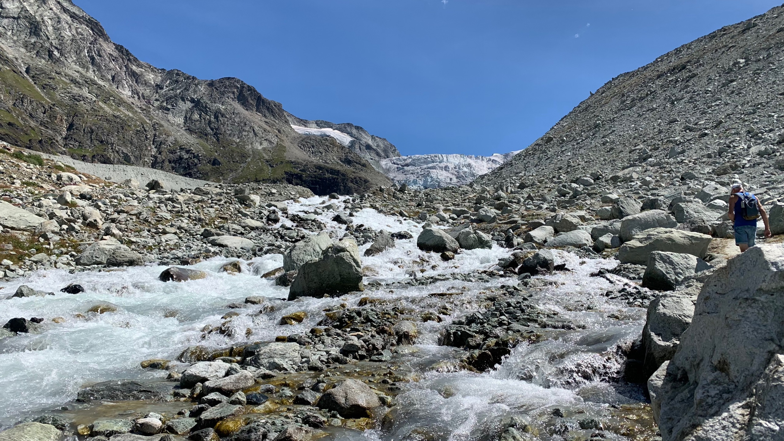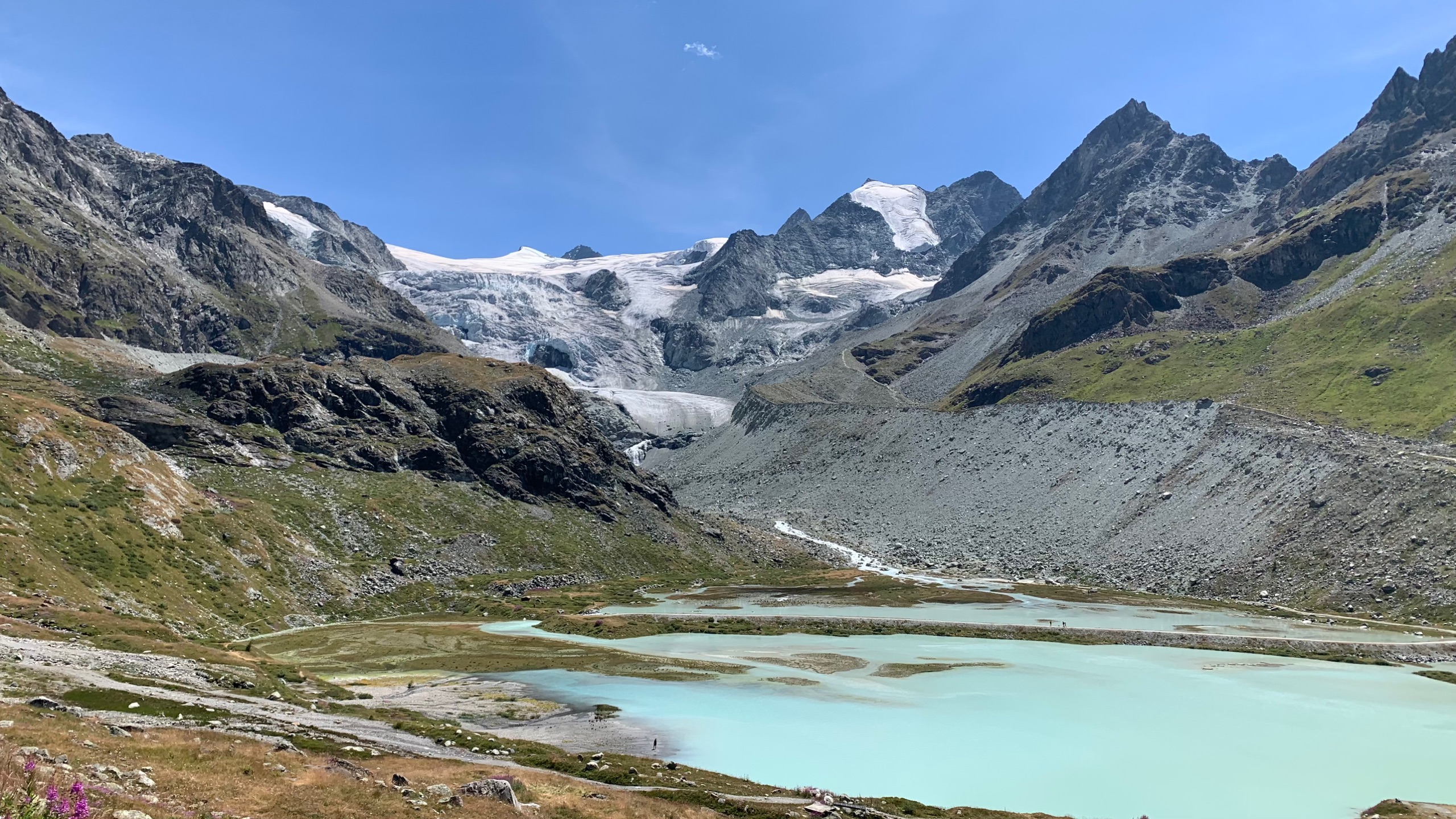 We rijden door de stralende zon door de bergen naar Grimentz. Het is een prachtige route. Vooral het laatste suk in val d’Anniviers. We vinden helemaal bij de glacier Moiry een mooi plekje voor onze camper met schitterend uitzicht.