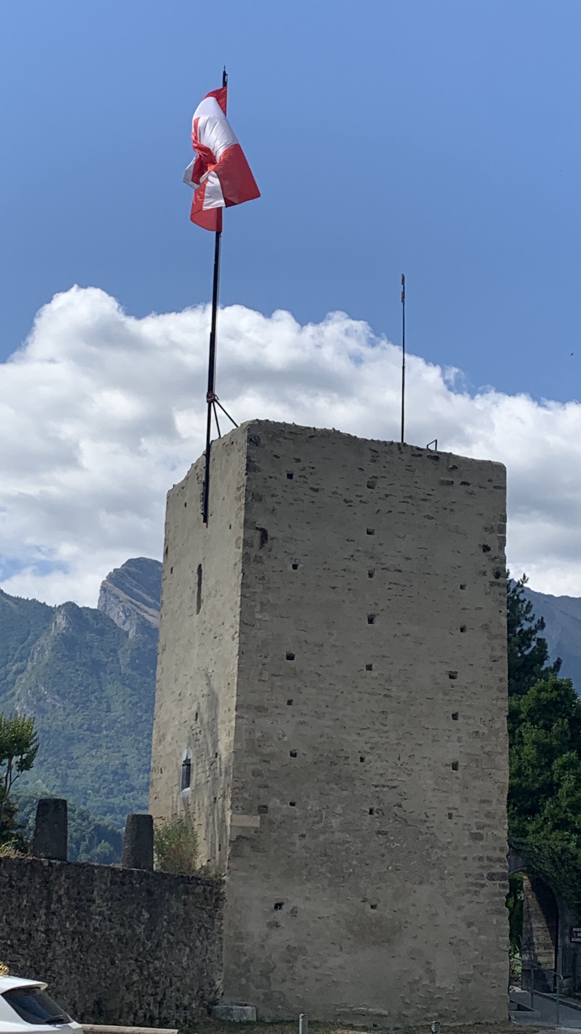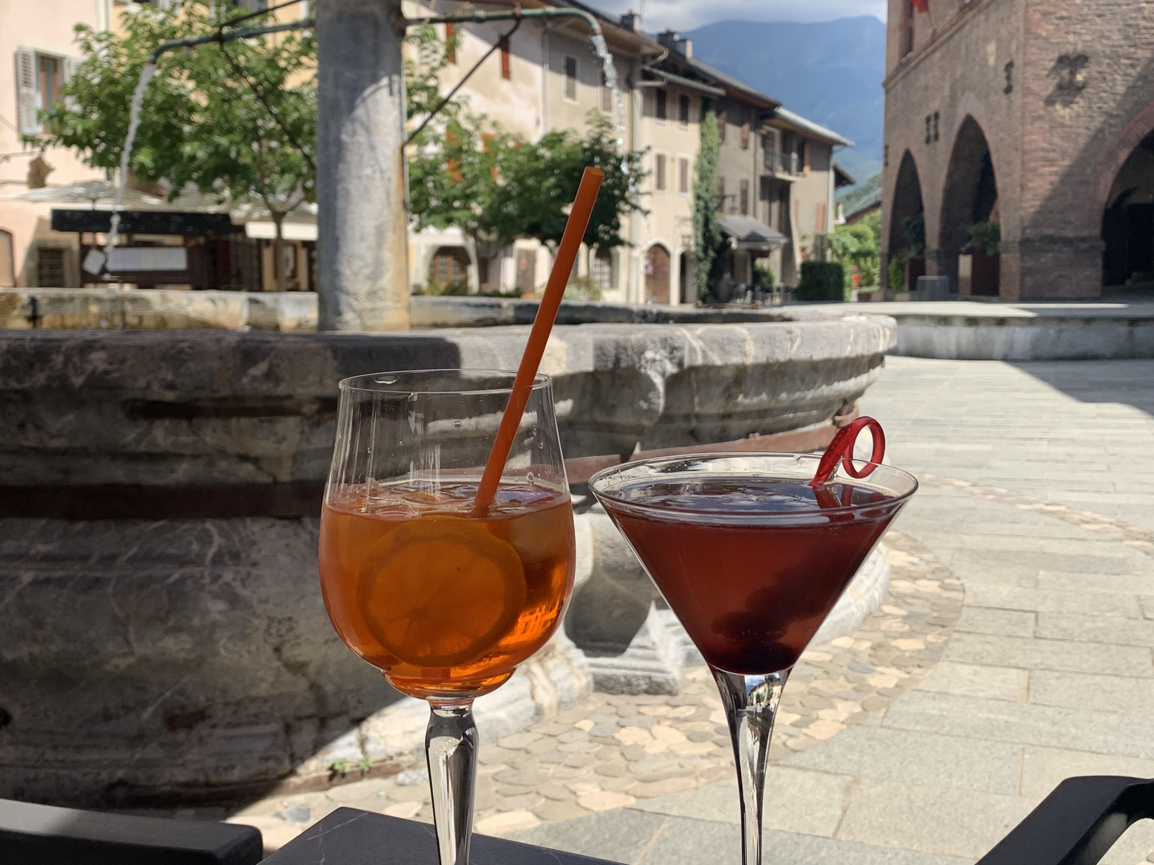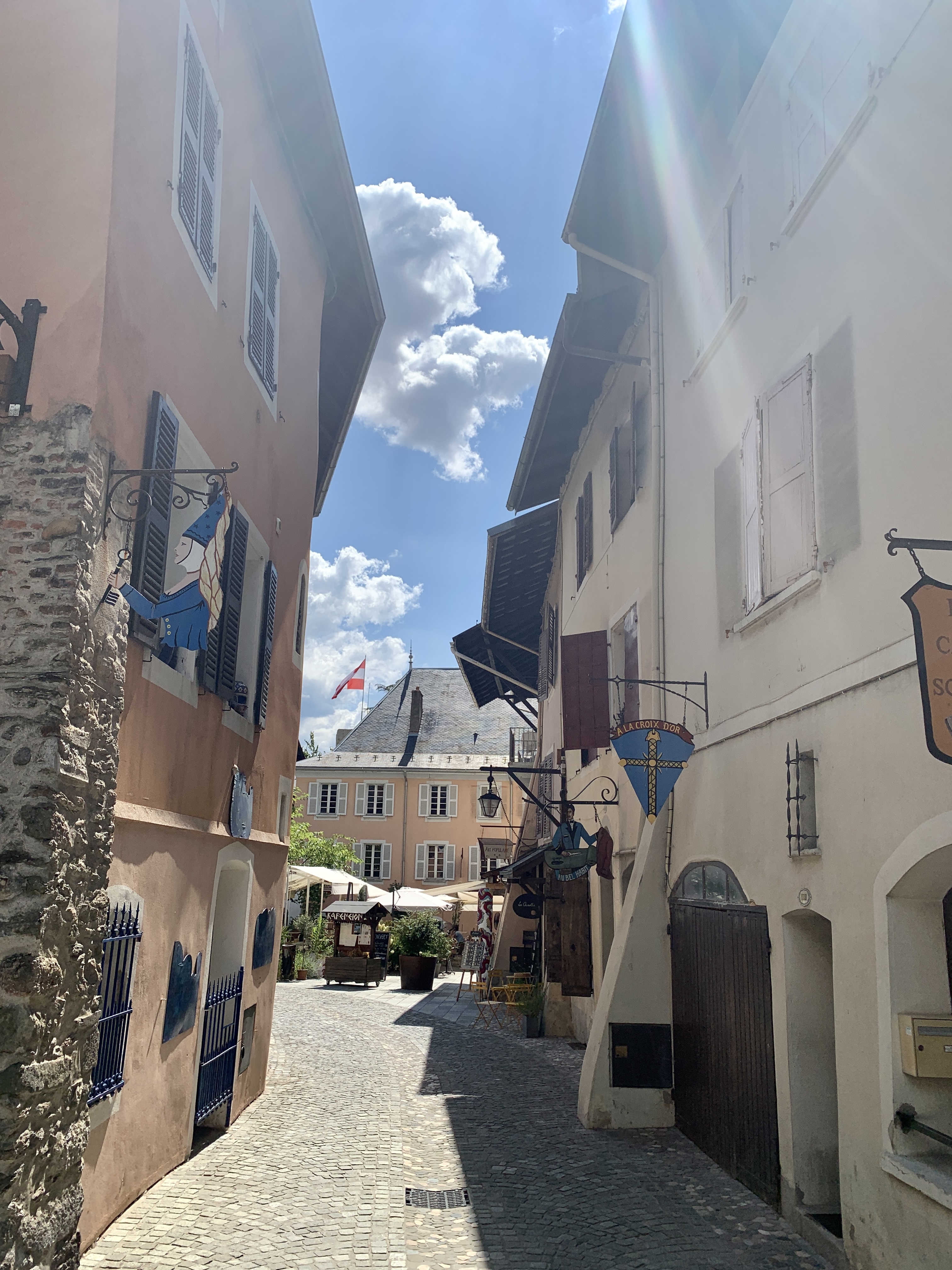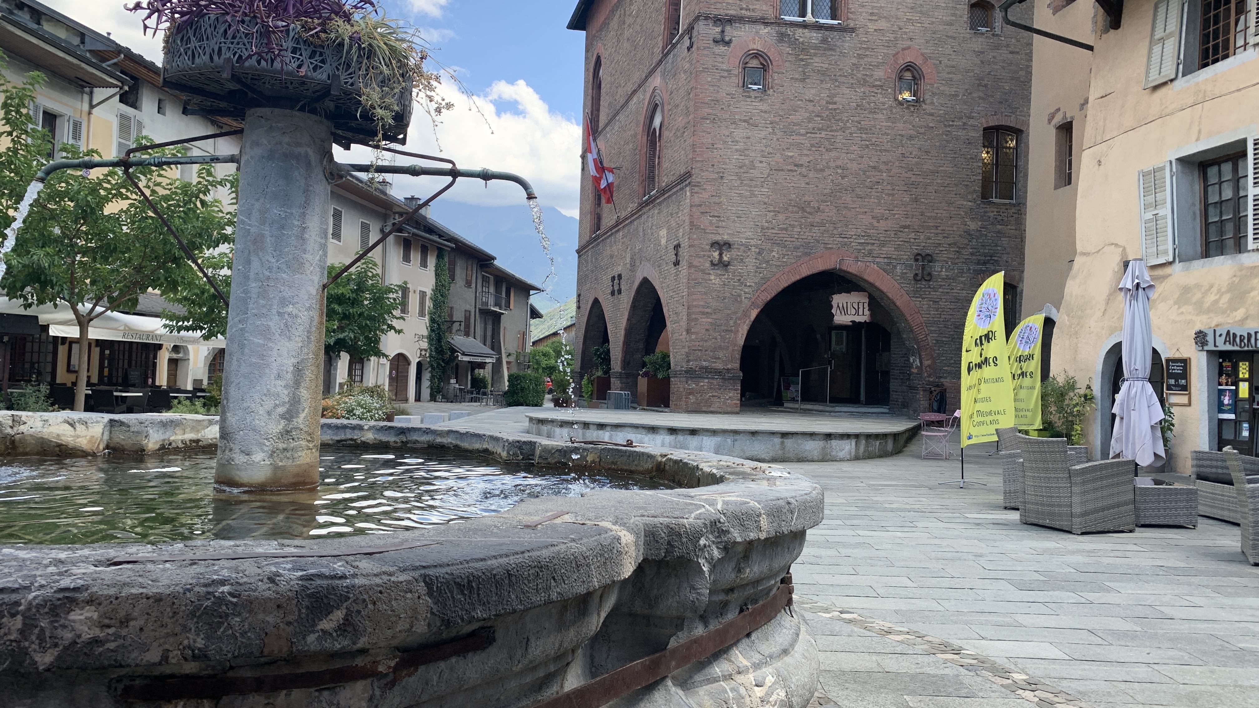 Dan gaat onze tocht naar een camperplaats bij Conflans. Een middeleeuws stadje vlak naast Albertville. Het is eigelijk een groot parkeerterrein waar je gratis kunt staan en we kunnen er lekker onder de bomen zitten. Er staat wat wind en dat is prettig. We wandelen naar het plaatsje. Erg leuk. We genieten van een cocktail op een terrasje en wandelen op ons gemak weer terug.