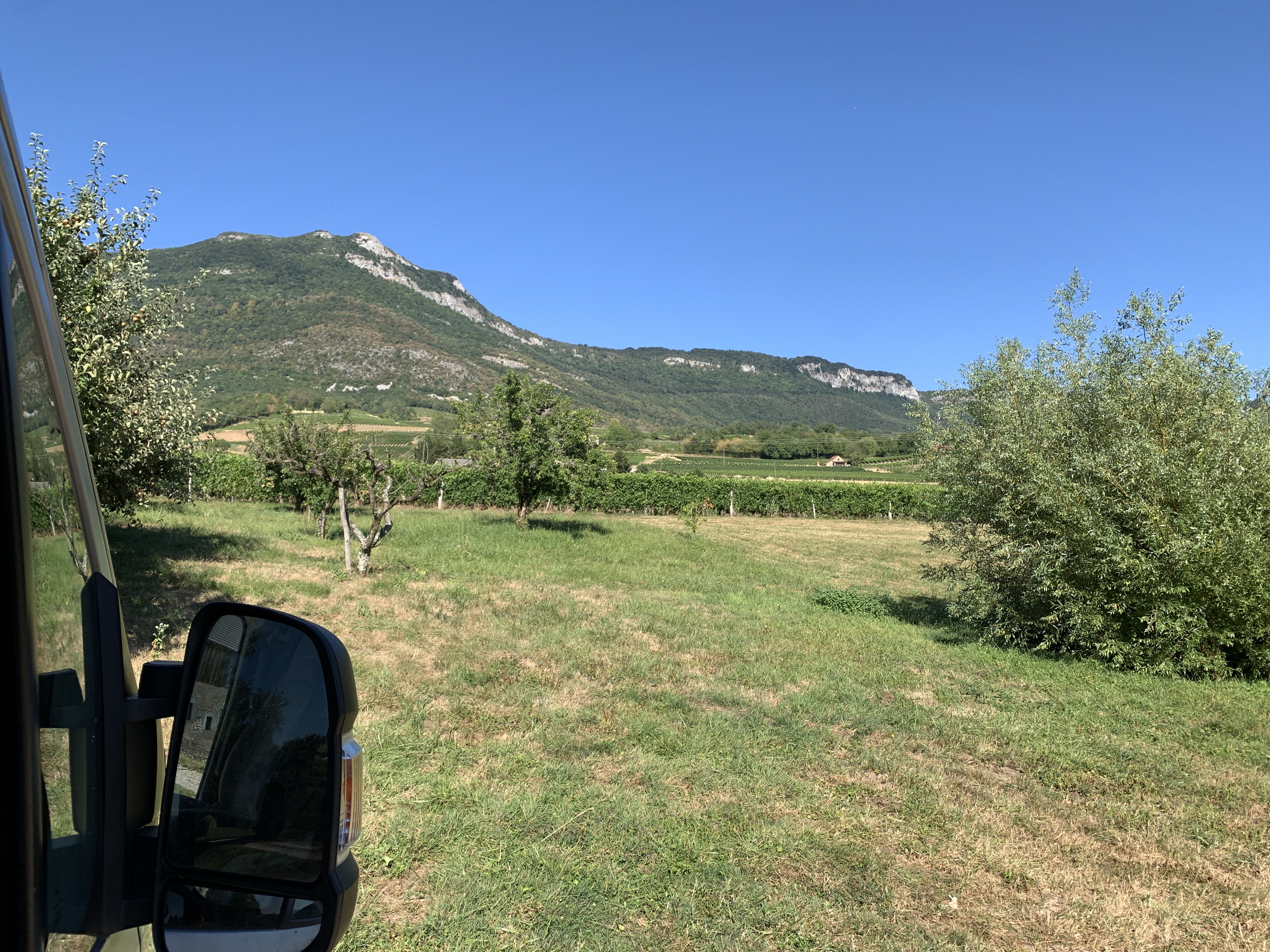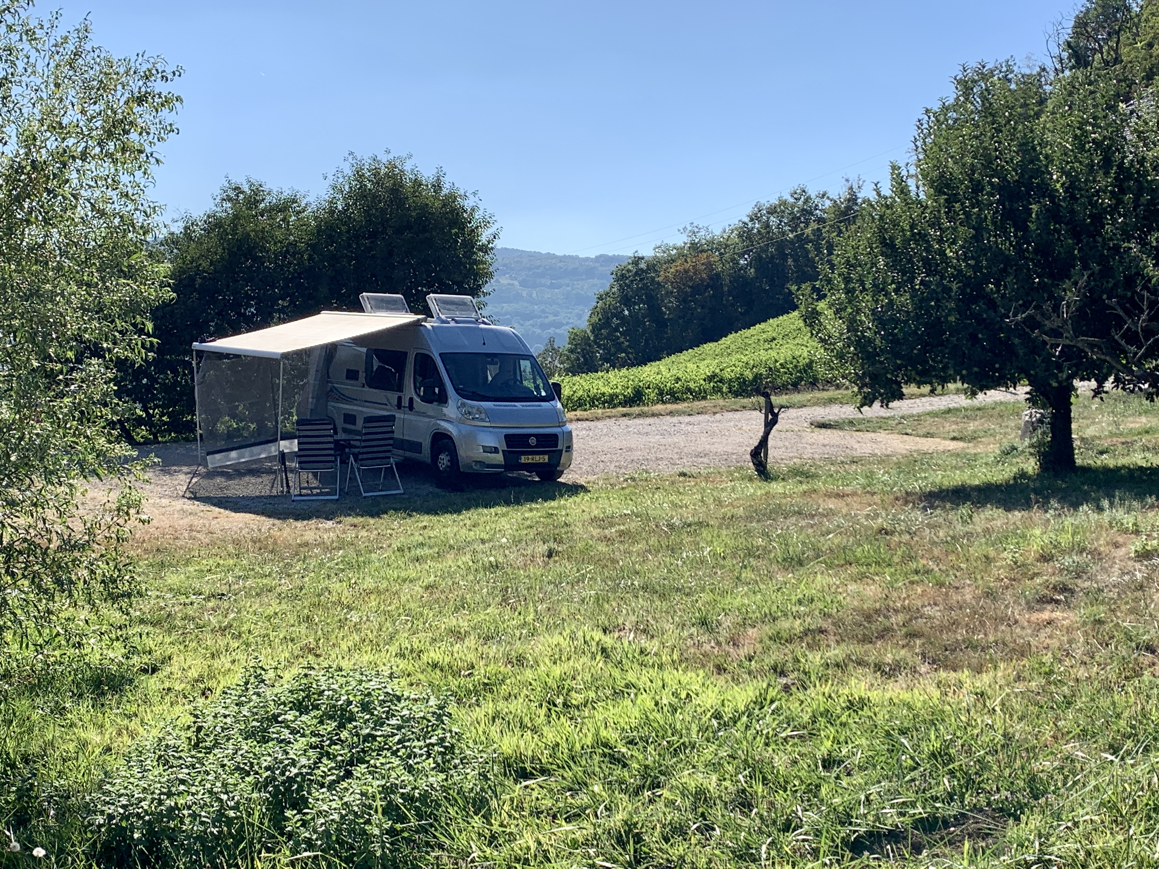 We komen aan op onze overnachtingsplek in Jongieux. Bij een wijnboer van France Passion. Een plek met prachtig uitzicht en lekkere wijn.