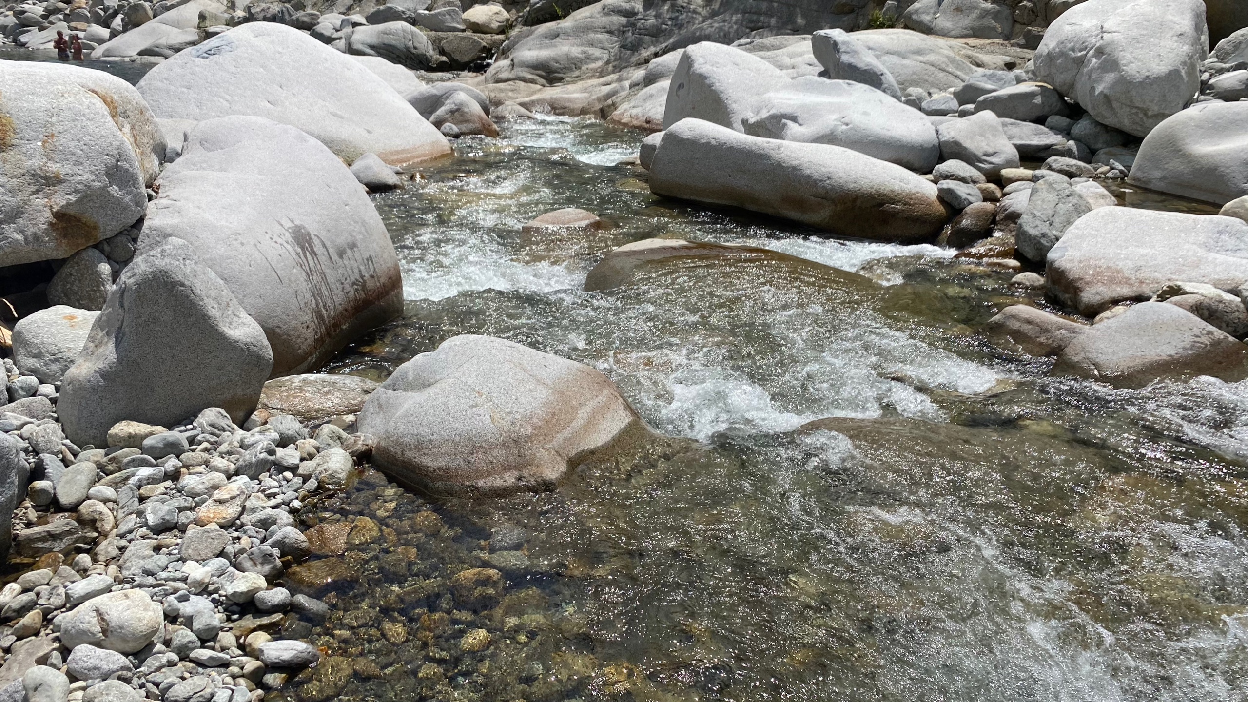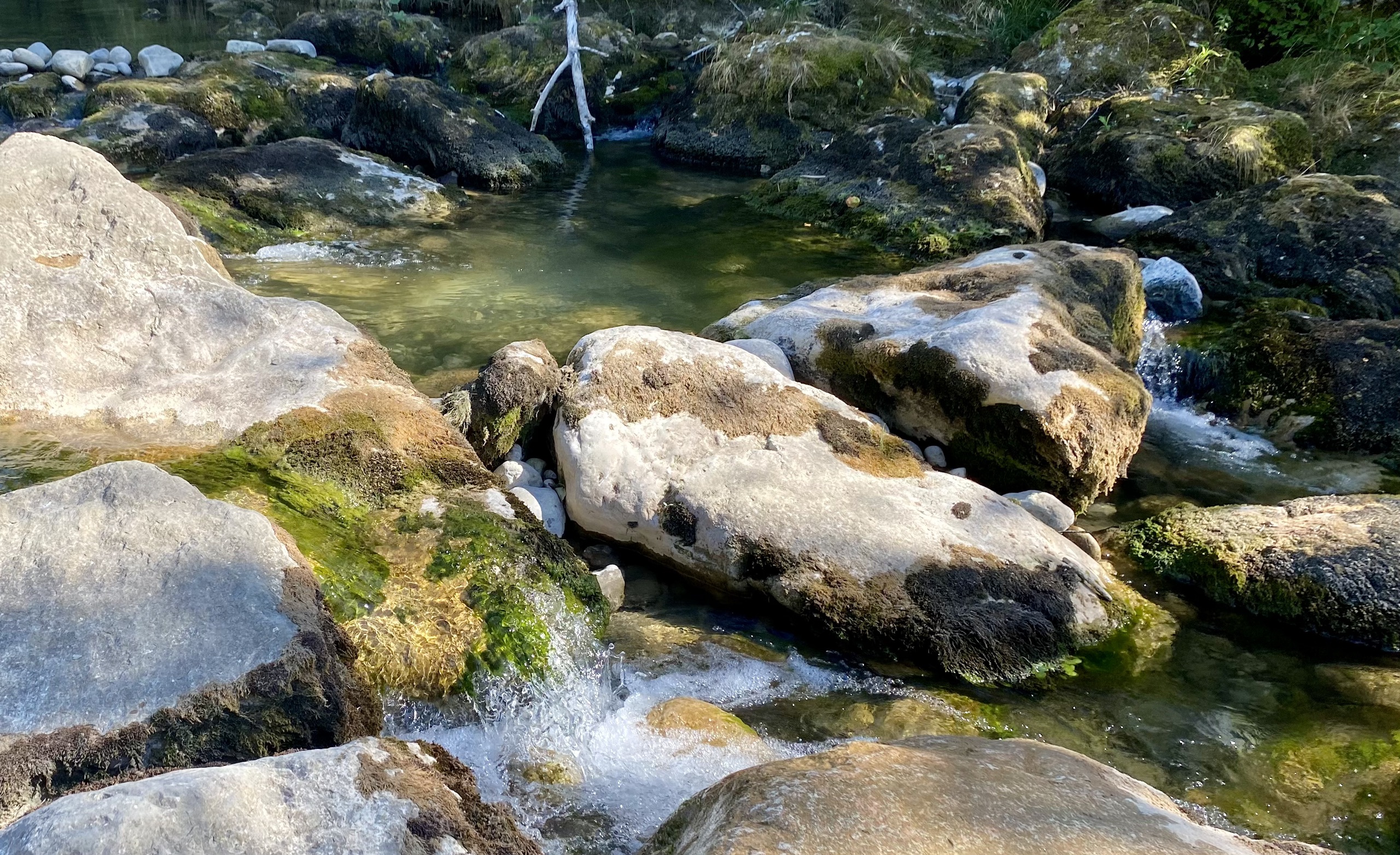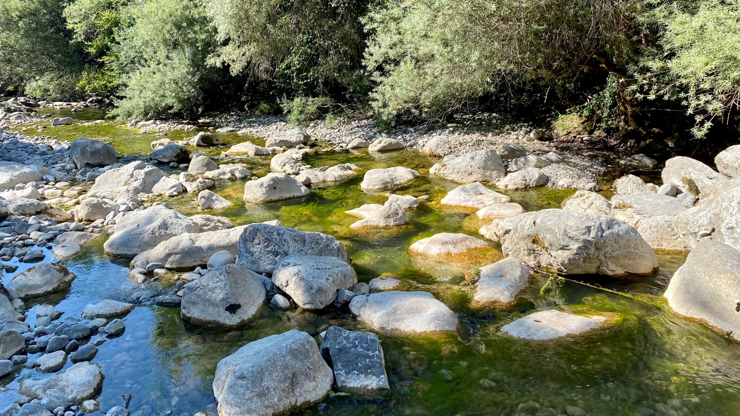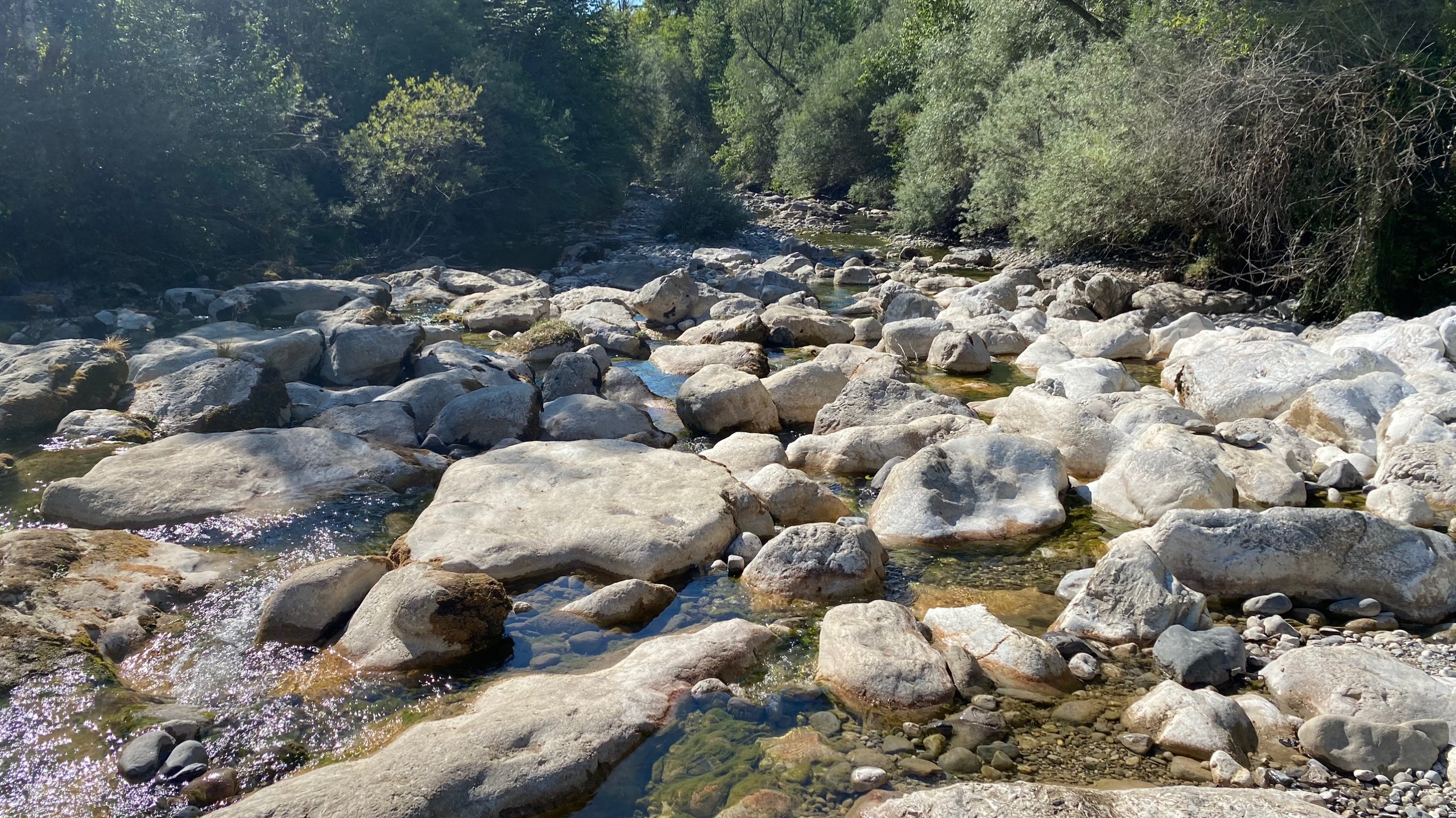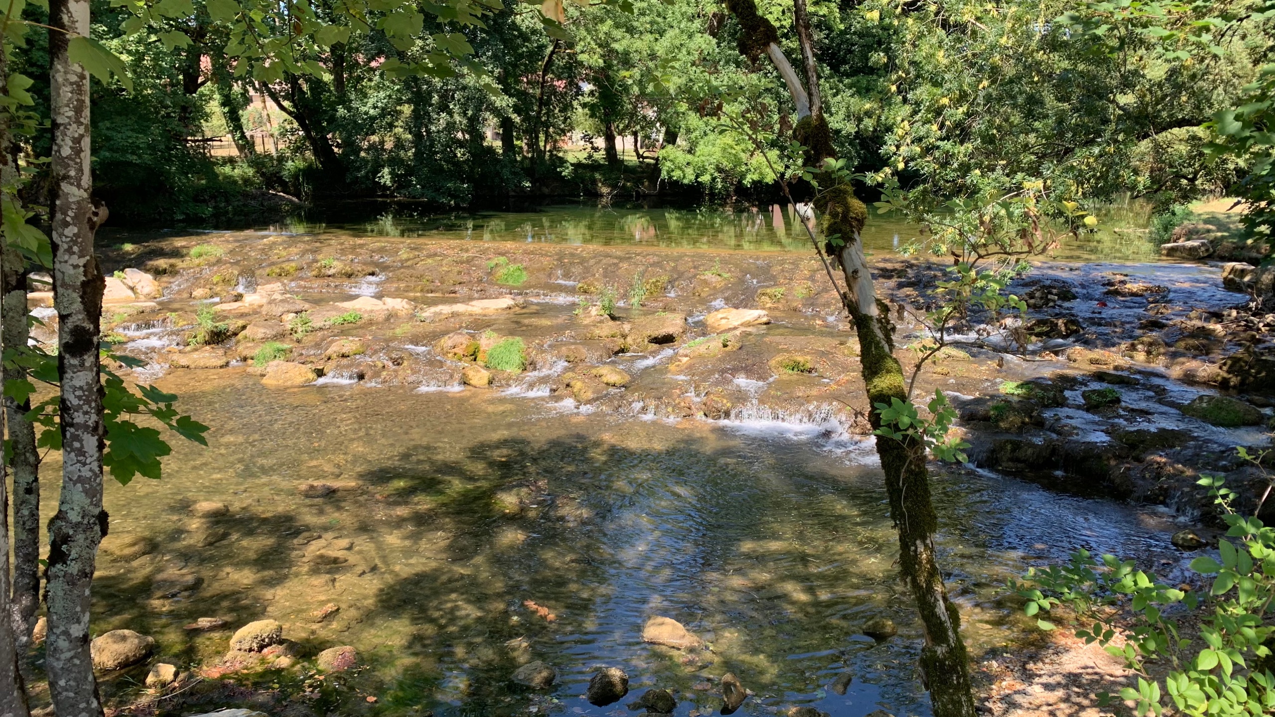 Vanmorgen is het een stuk koeler dan gister. We maken er dankbaar gebruik van en maken een wandeling naar een riviertje in de buurt. De Sezzier. Het is er mooi. Het riviertje kabbelt rustig over de rotsen. Je kunt er heerlijk pootje baden. Er zijn stroomversnellingen en verderop grote gladde rotsen waar in je verbeelding heel veel water tussendoor kan stromen.