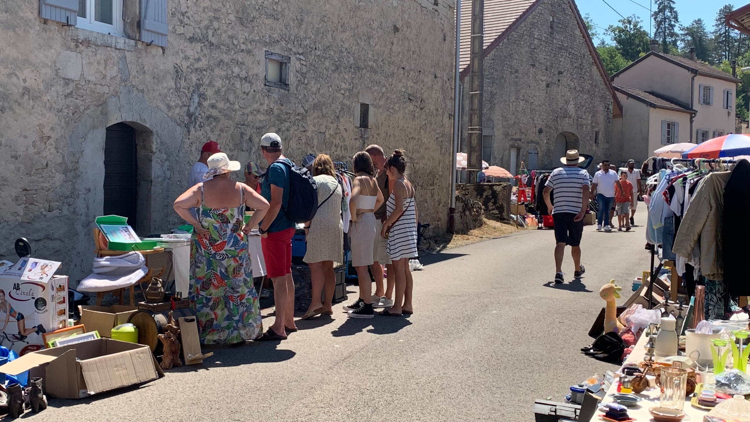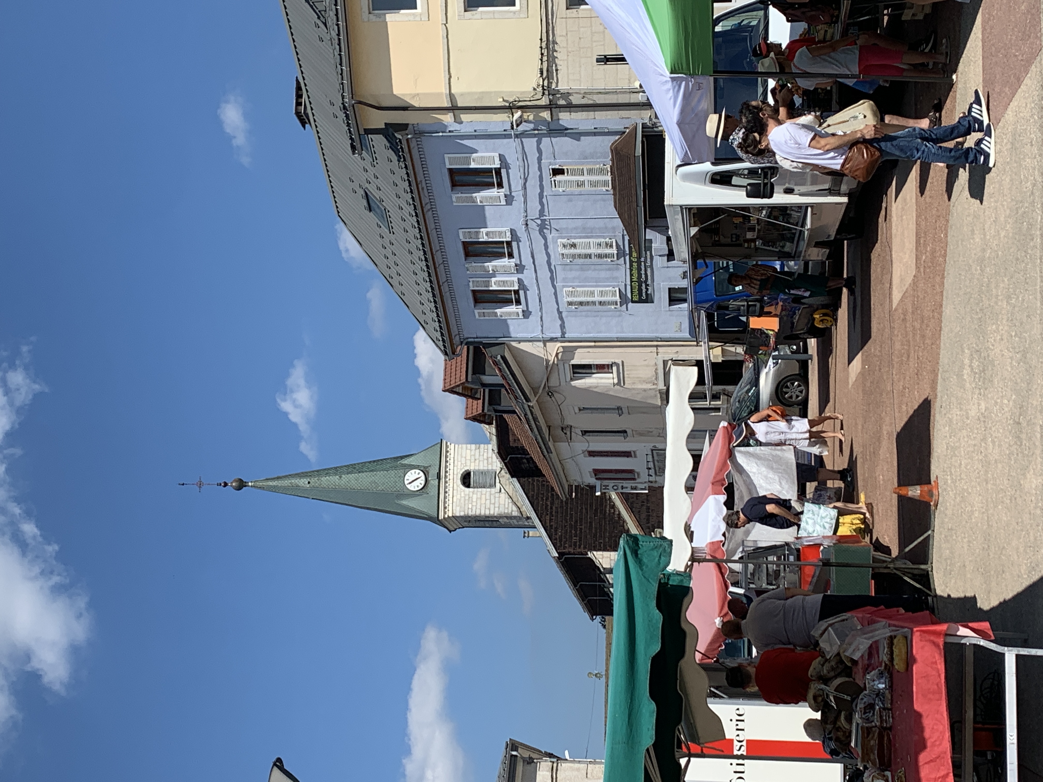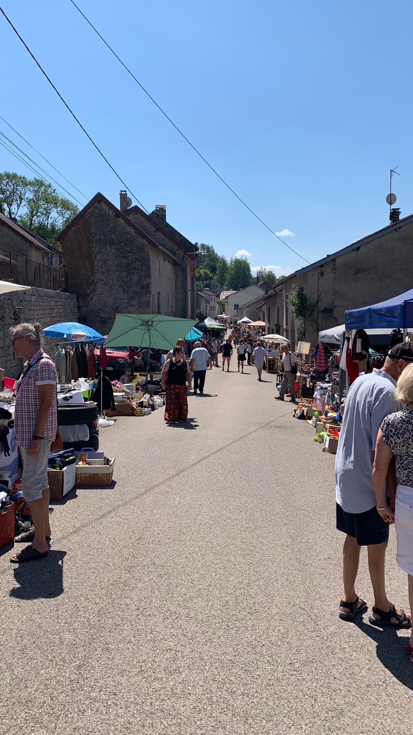 We gaan weer verder met onze route. We rijden door prachtige glooiende velden. Later langs een riviertje tussen de rotsen. Ook hier weinig water. Weer verderop komen we in Saint-Laurent-en-Grandvaux. Hier zien we een gezellig marktje waar we even heengaan. Dan weer verder door de heuvels.