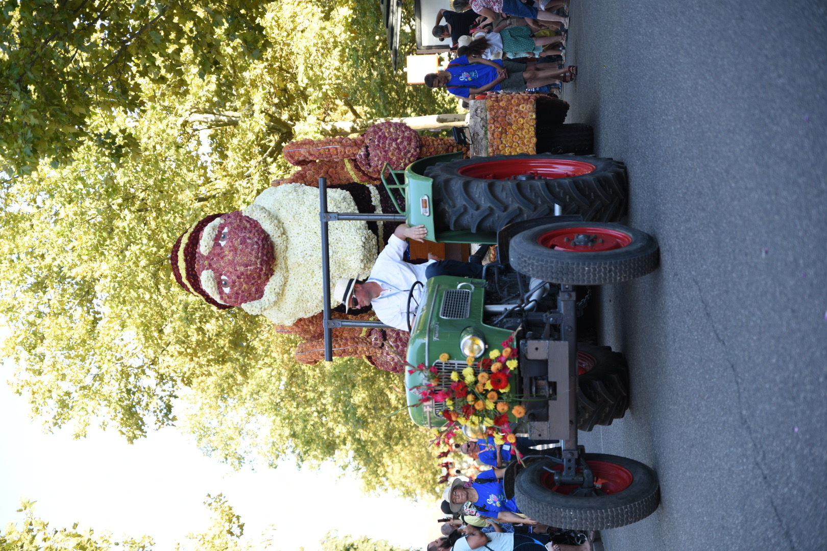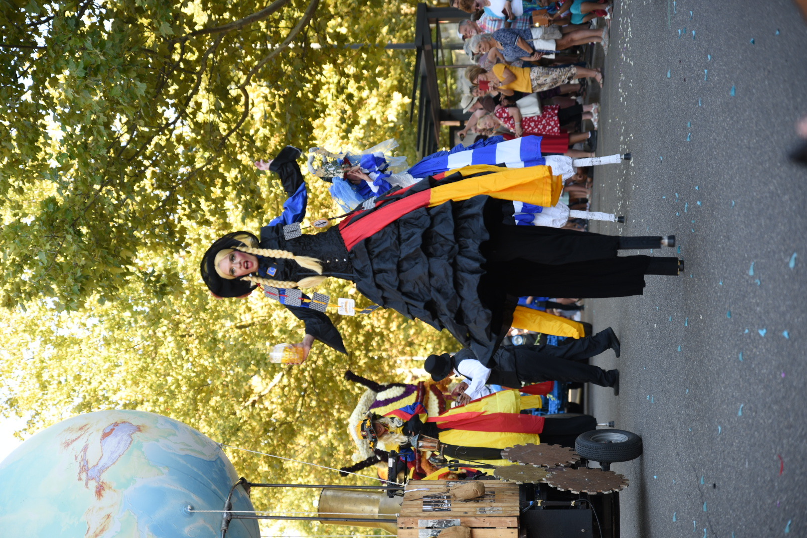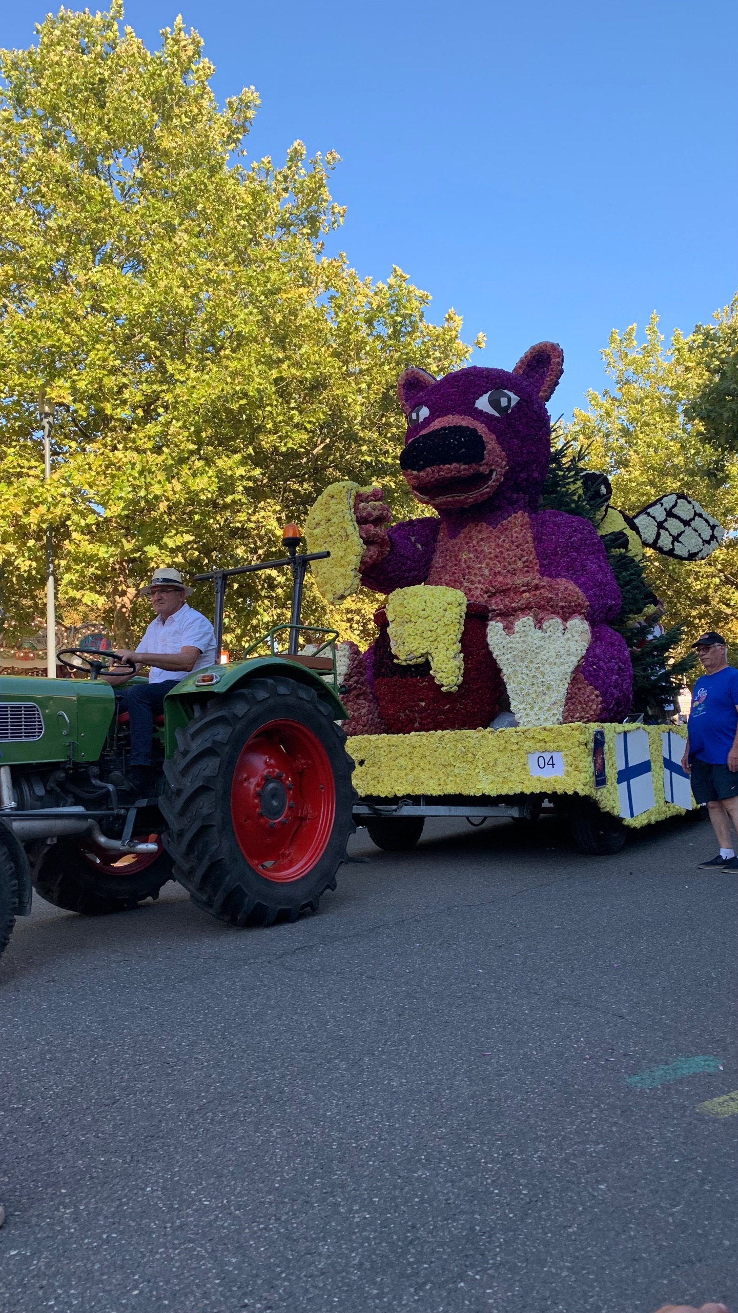 We rijden naar de camperplaats daar die met een flink parkeerterrein lijkt vergroot. Wij gaan er maar bij staan. Het is vlakbij het centrum. We wandelen daarheen en worden getrakteerd op muziek. We zoeken een terrasje op en daar wachten we op de optocht. Eerst oude auto’s en dan het corso.