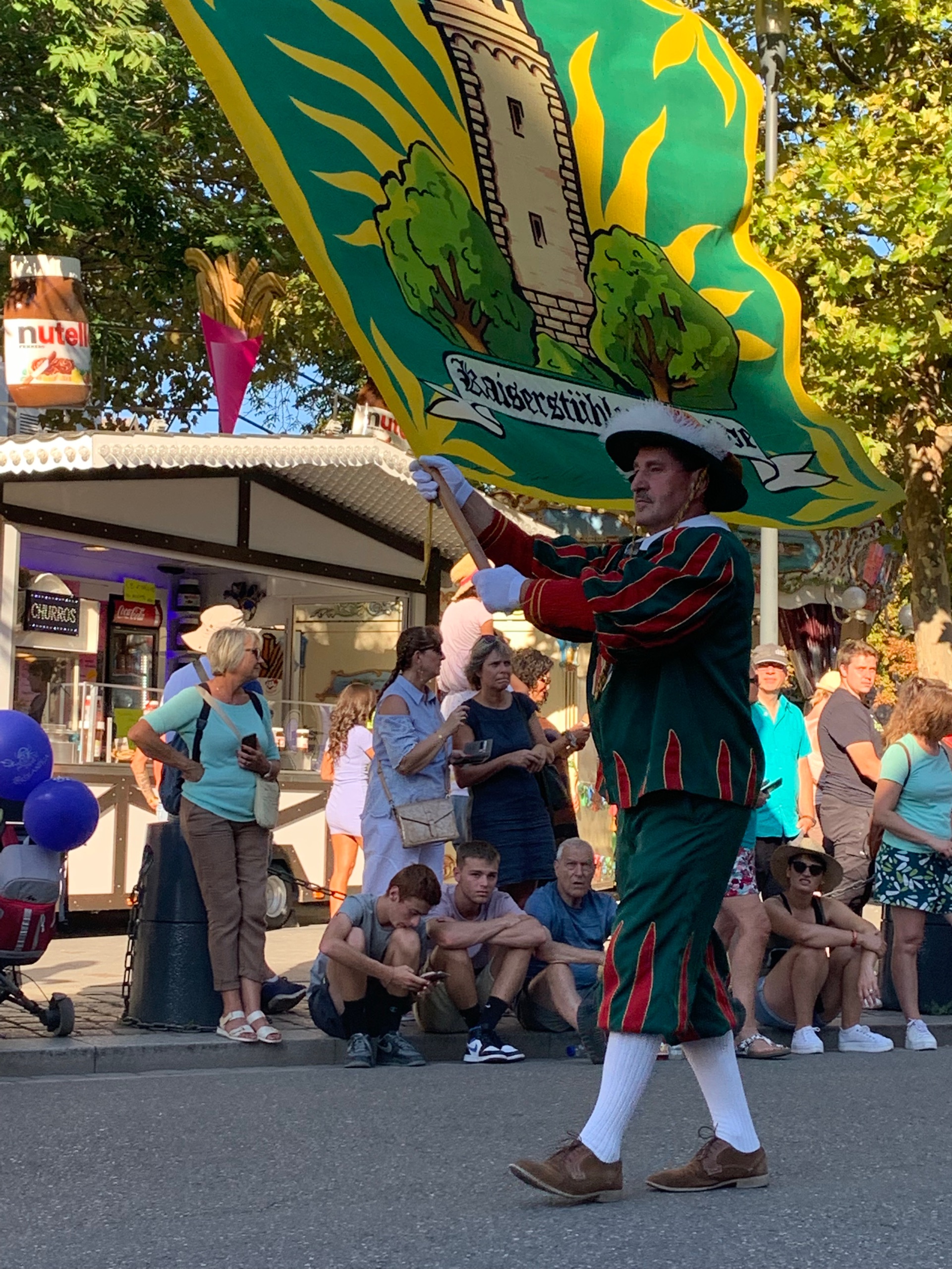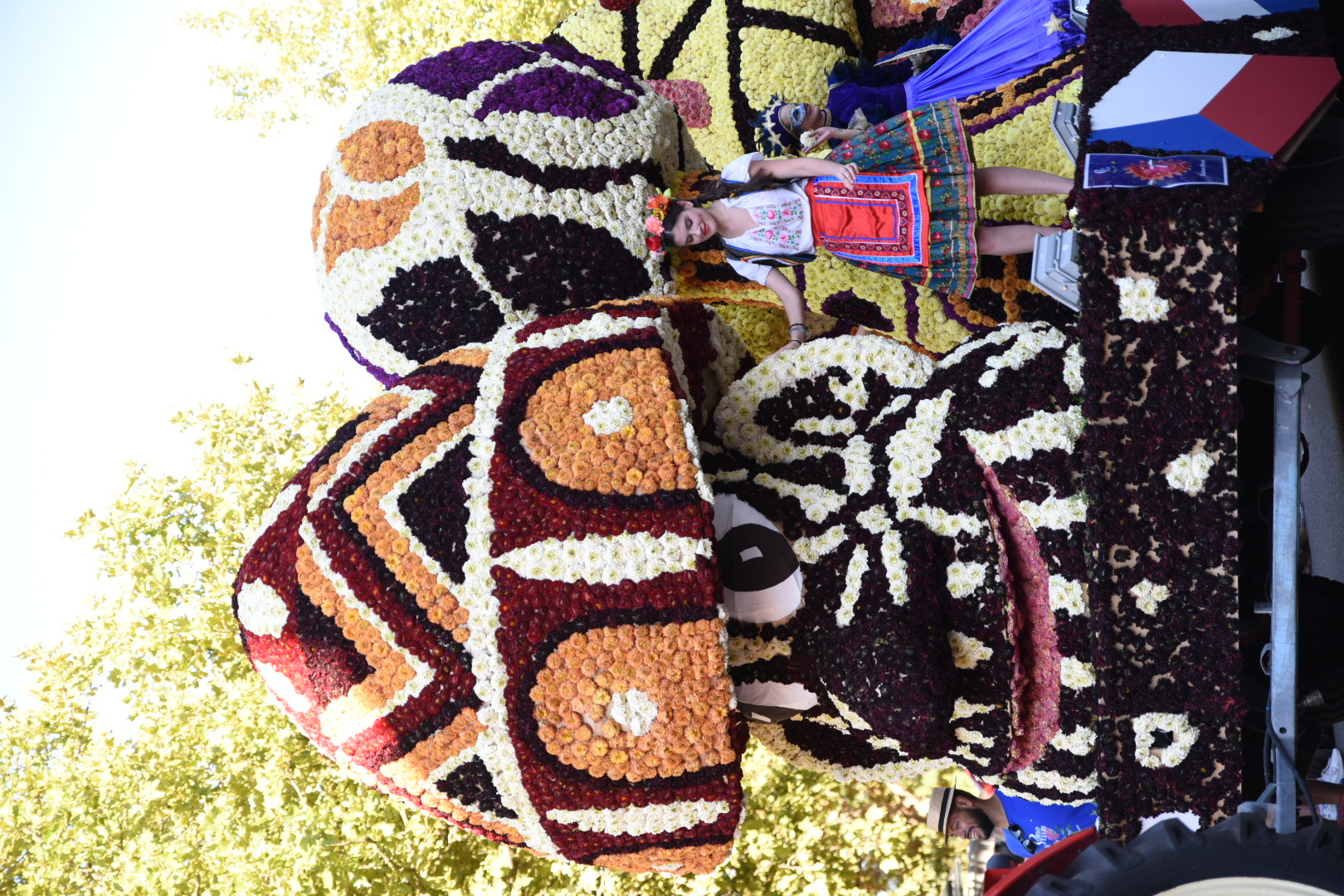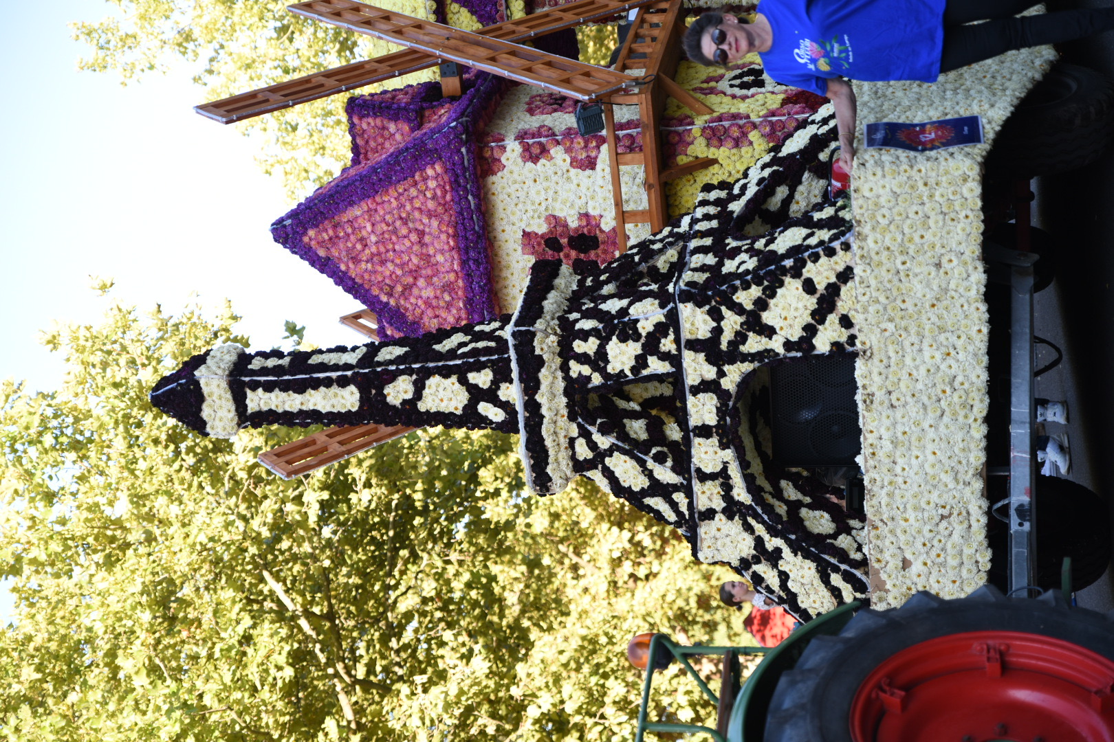 We rijden naar de camperplaats daar die met een flink parkeerterrein lijkt vergroot. Wij gaan er maar bij staan. Het is vlakbij het centrum. We wandelen daarheen en worden getrakteerd op muziek. We zoeken een terrasje op en daar wachten we op de optocht. Eerst oude auto’s en dan het corso.