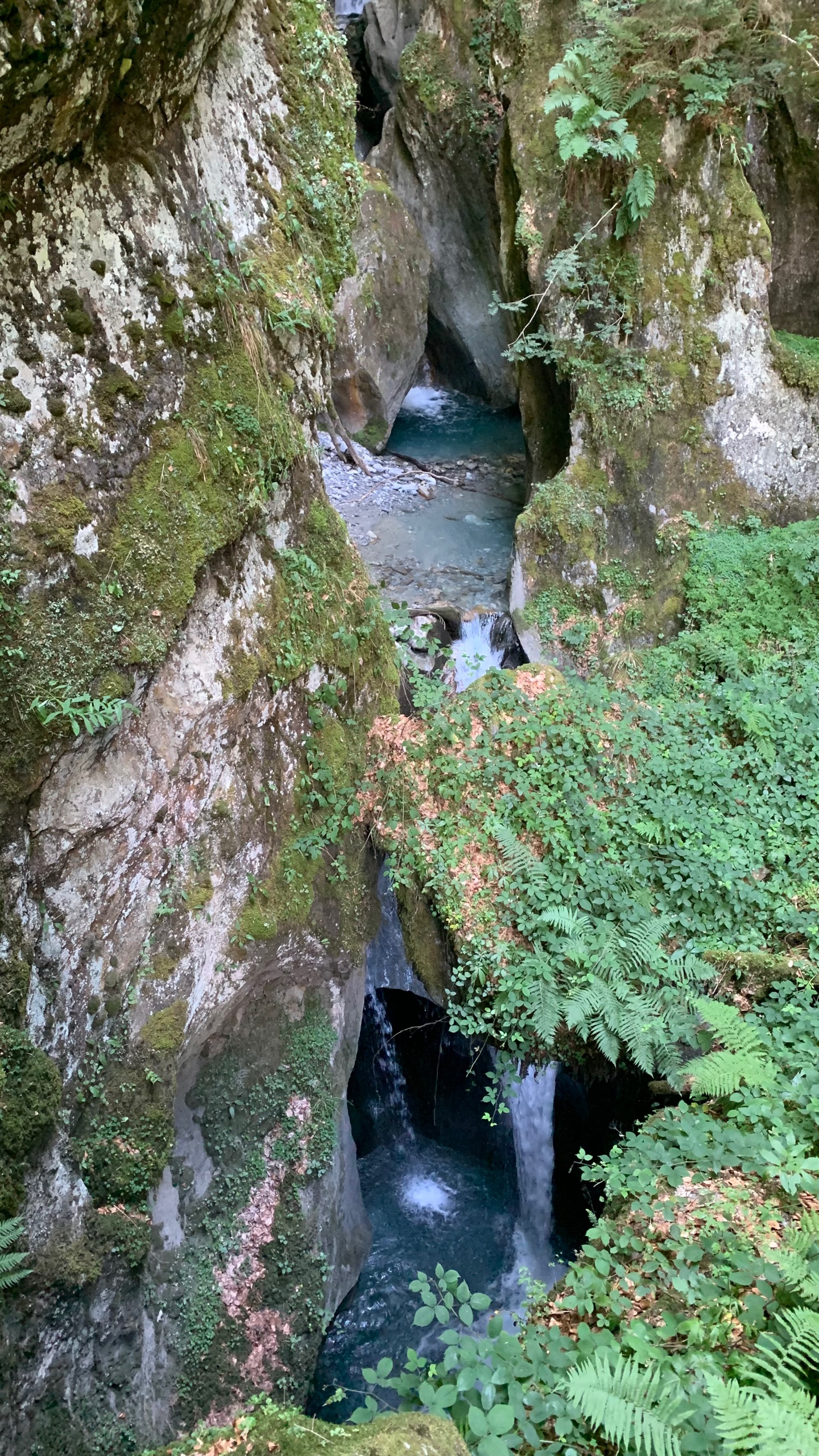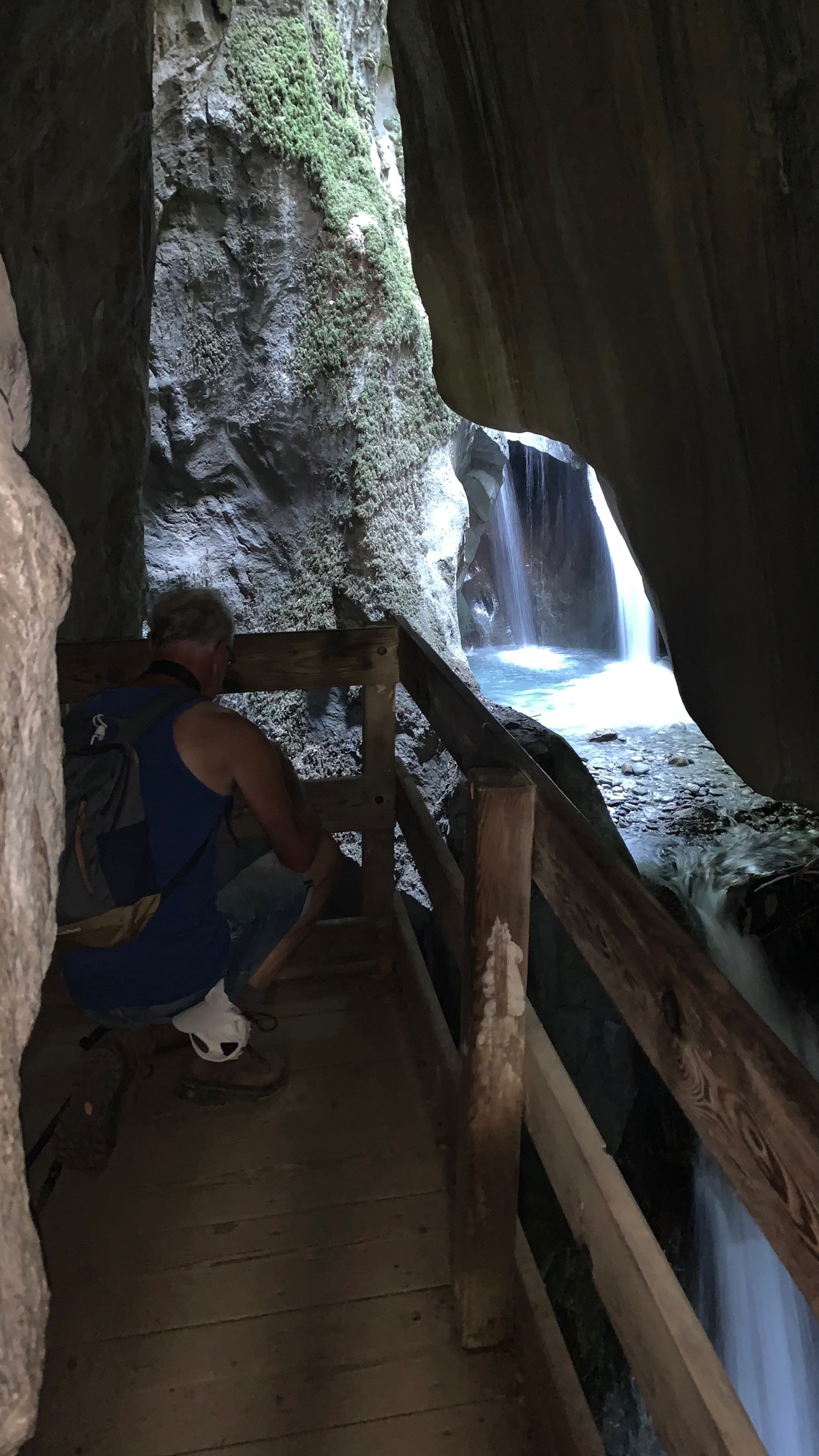 We rijden weer naar de Franse grens over de col de la Farclaz. We stoppen bij Trient, bij de gorges de Tete noir. We maken daar een wandeling flink steil naar beneden. Daar kun je een waterval door een nauwe kloof zien kolken. En dan weer naar boven, pffff 🥵 Maar we hebben het gehaald.