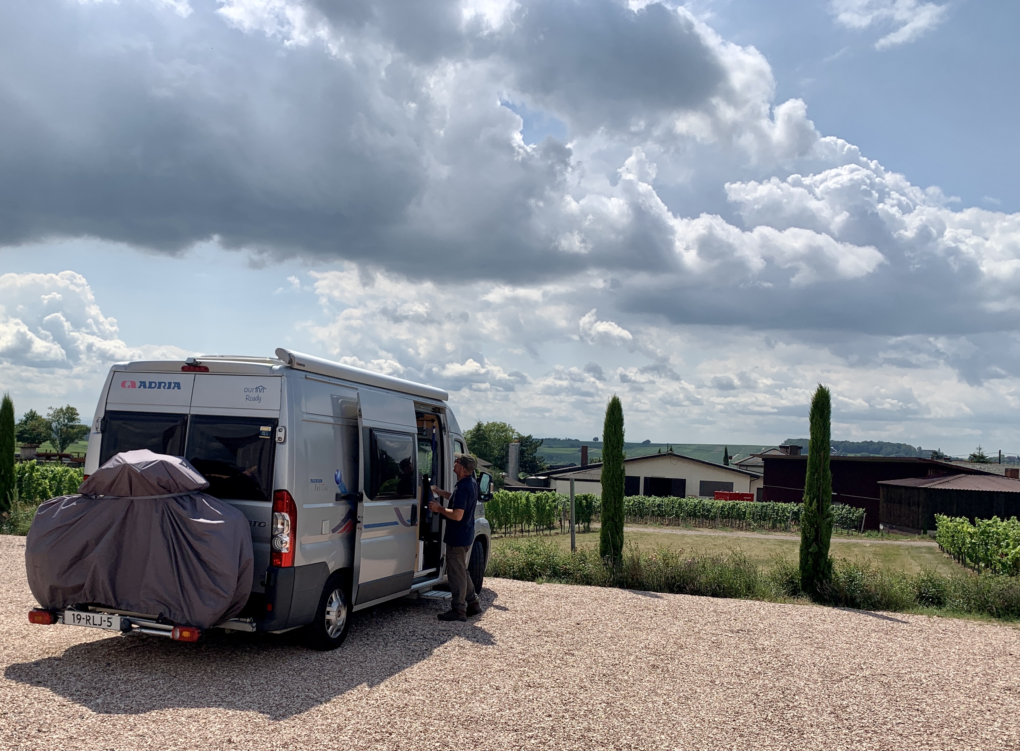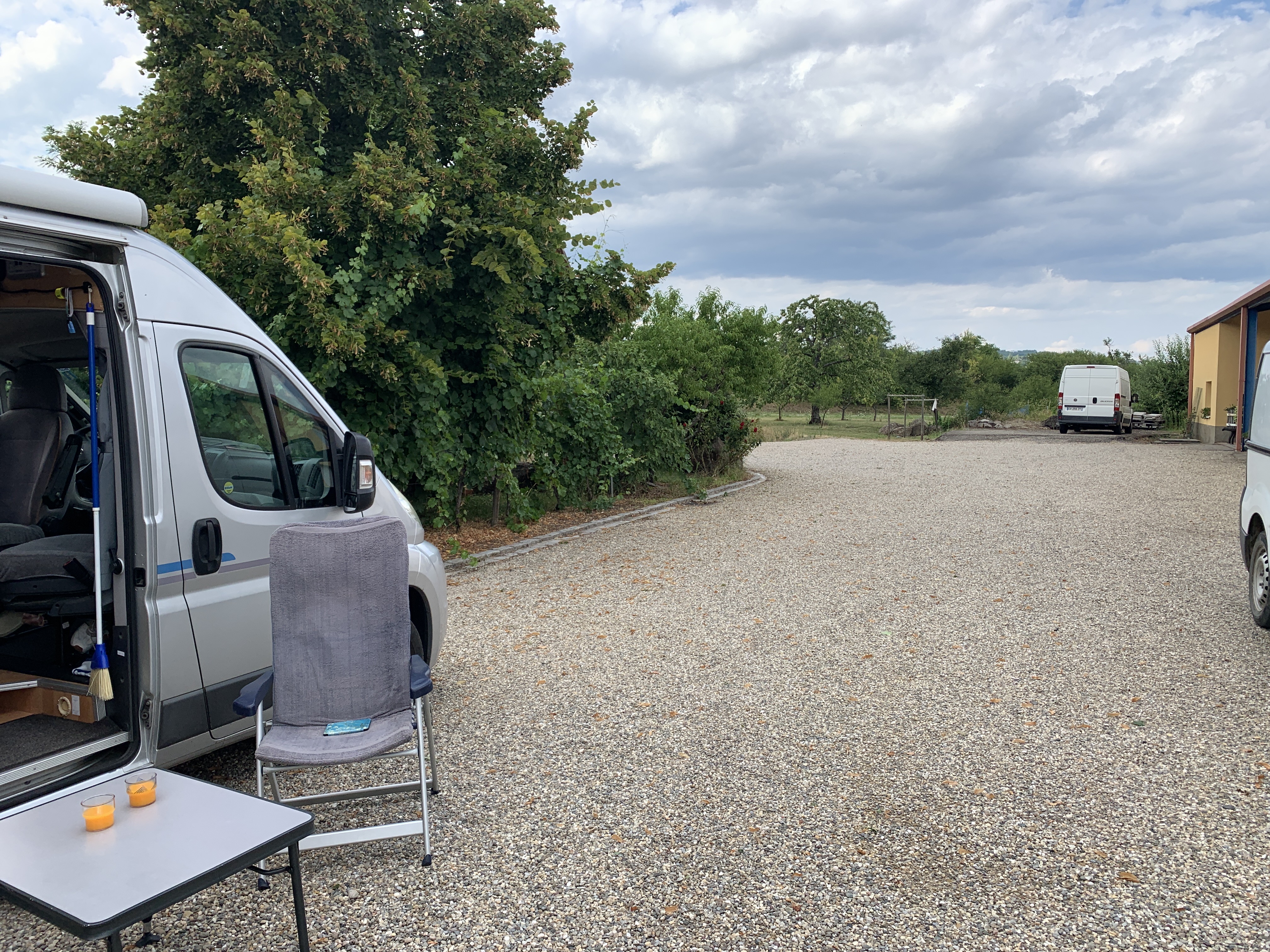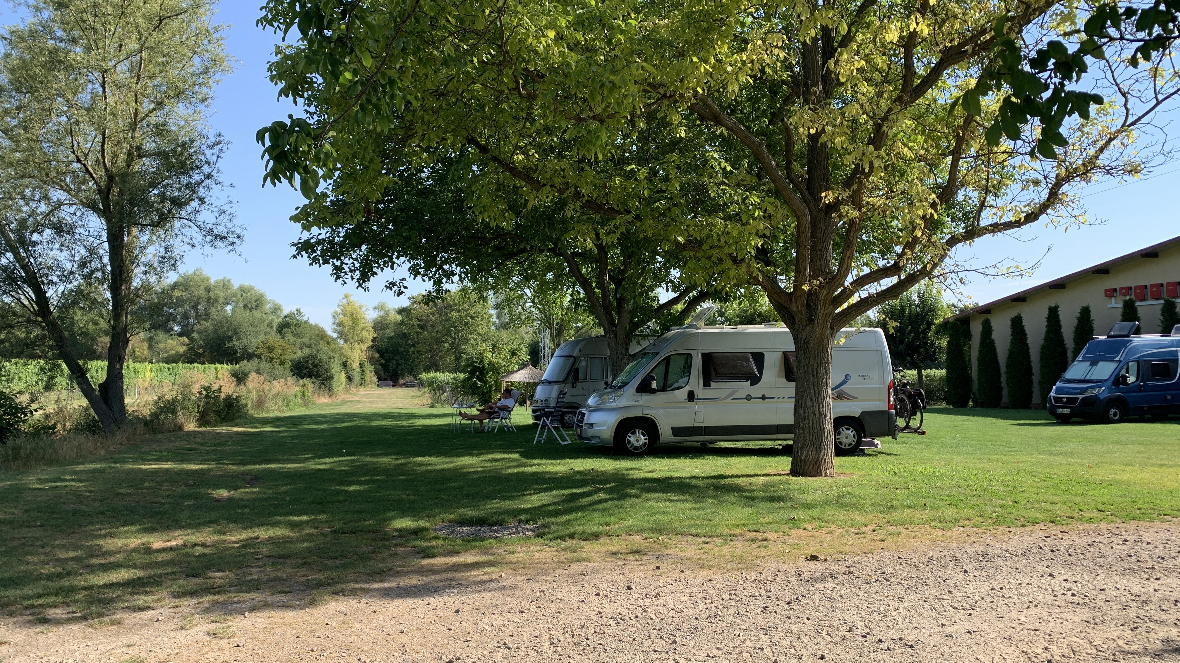 Uiteindelijk vinden we een overnachtingsplek bij een heel oud wijndomein. Oud qua gebouw dan. Een prima plekje met schaduw in Molamboz. Een France Passion plek.