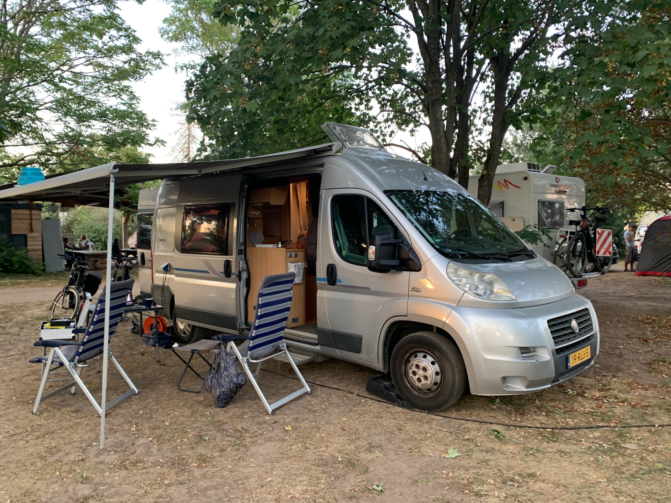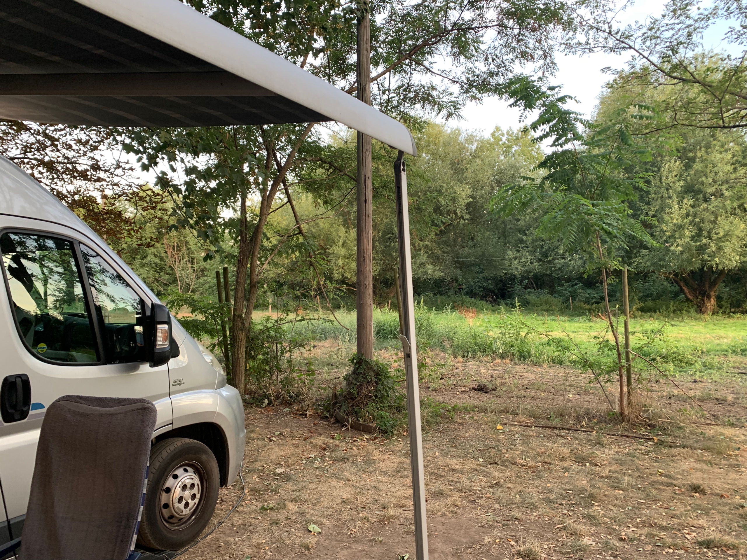 Gisterenavond en vannacht nog flink wat regen gevallen en wat onweer. Onze luifel ging omhoog. Snel opgerold. Bij onze overburen ging de partytent helemaal over de kop. Wel alles nog heel. We hebben ze maar even geholpen met de hele boel in te klappen.