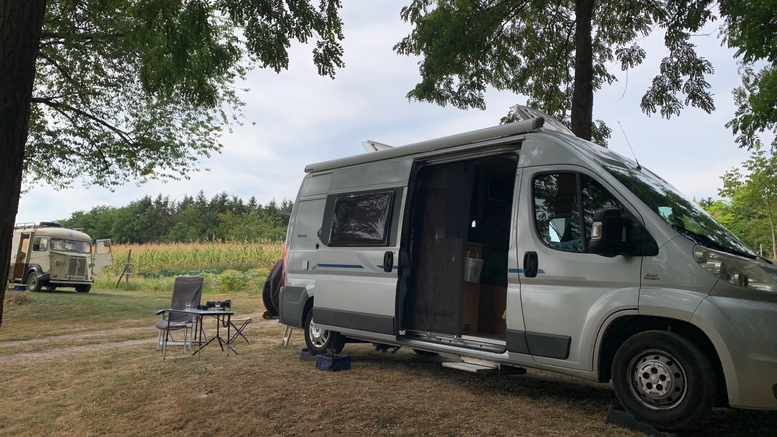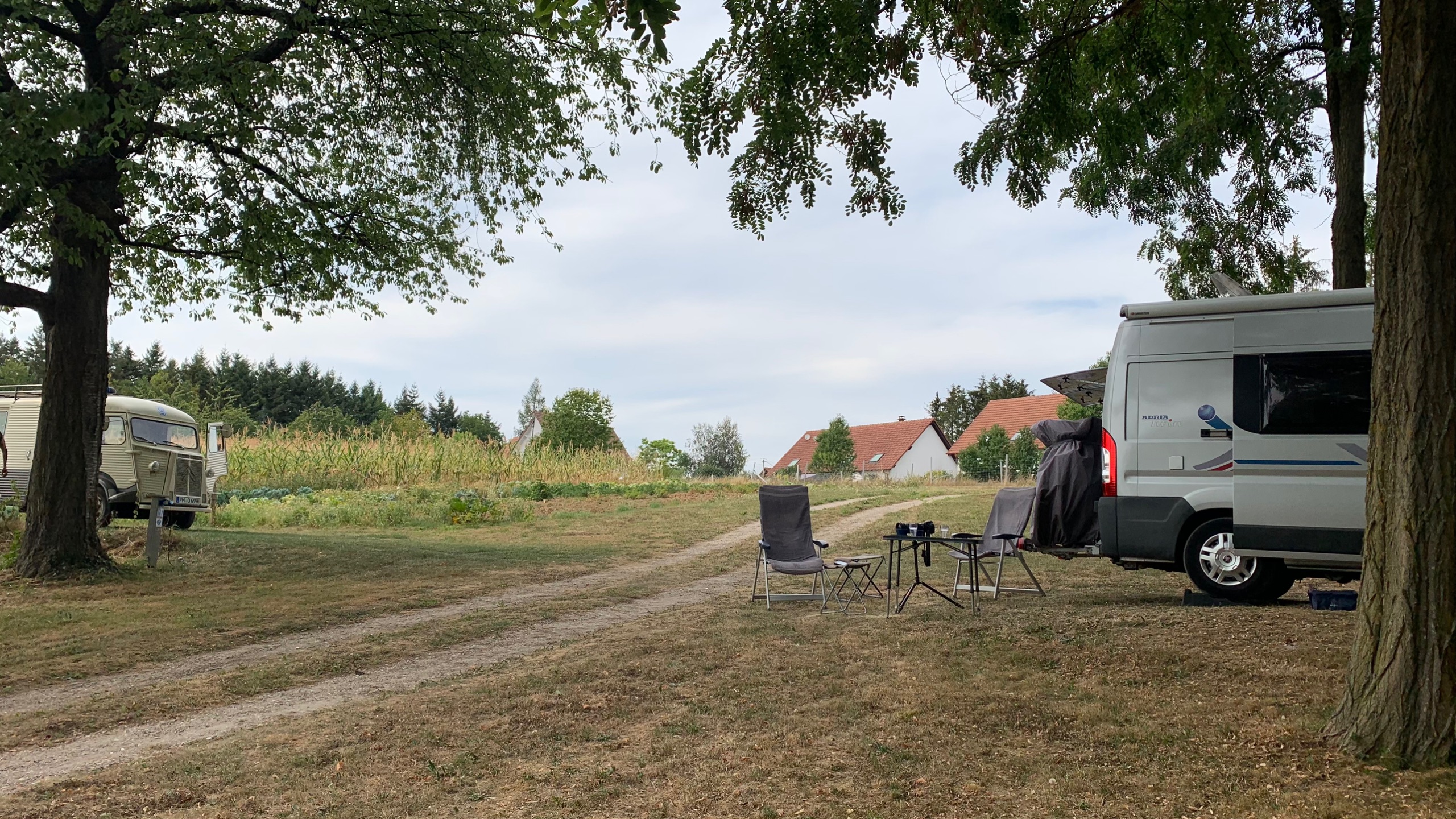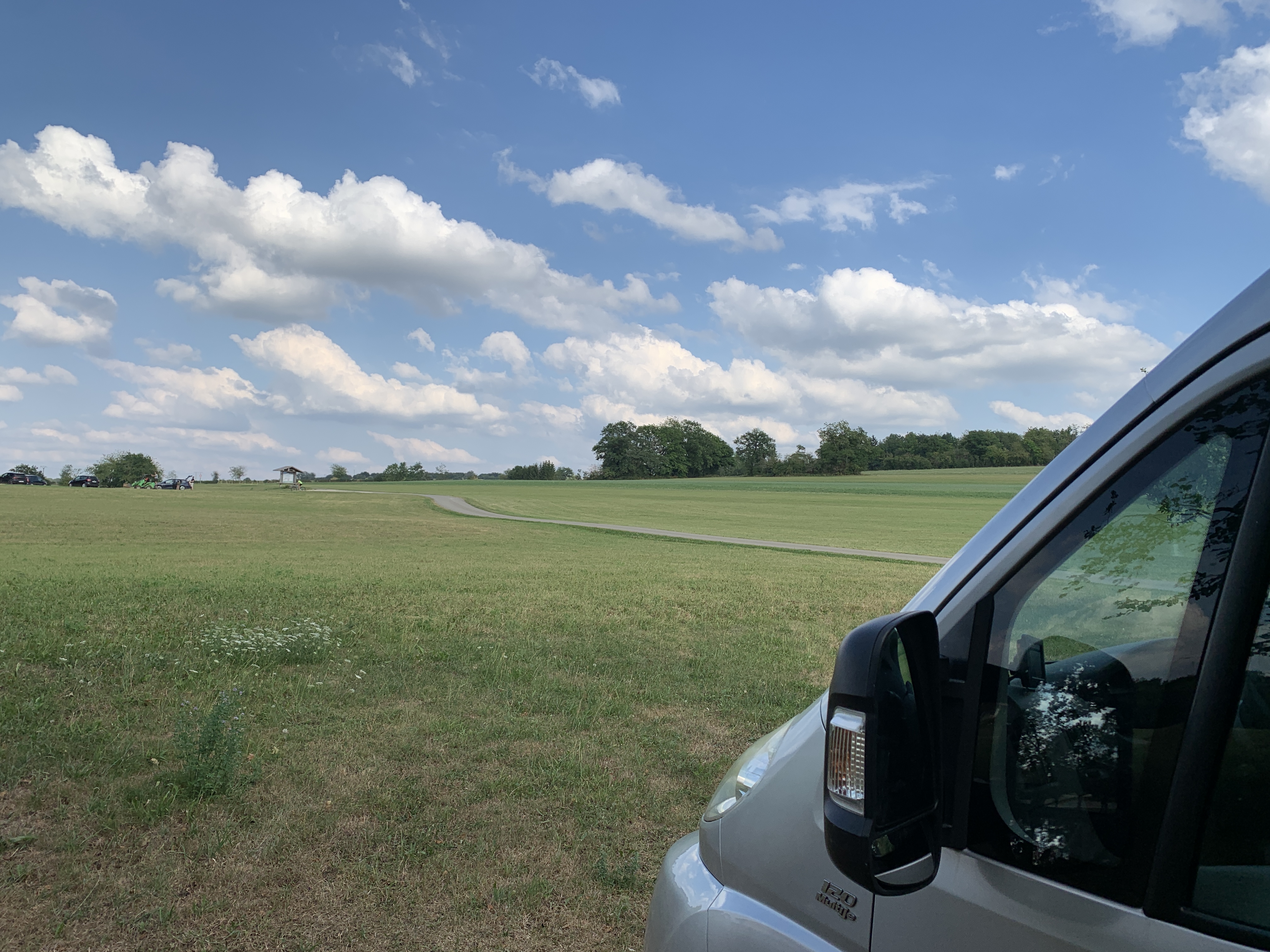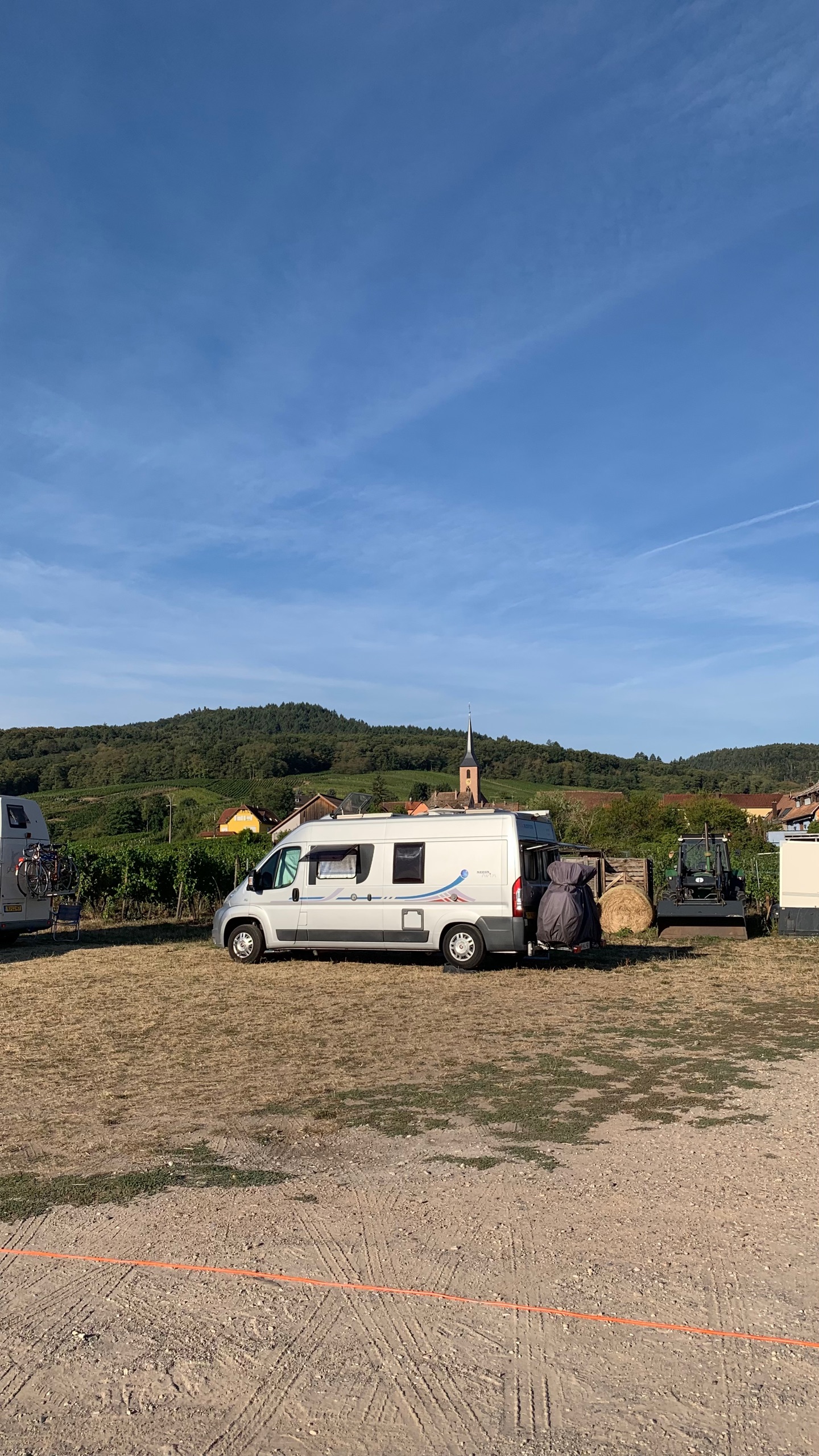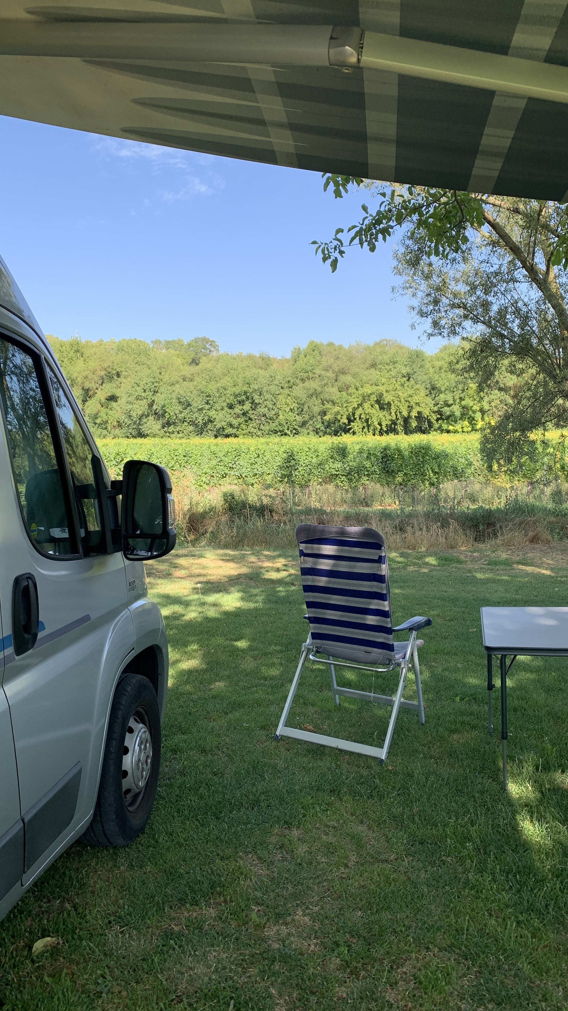 Dan vertrekken we naar een laatste plek in Frankrijk. We komen aan in Neewiller-prés-Lauterbourg. Een mooie plek met dito uitzicht. Vlakbij de Duitse grens. Voor het eerst zo ongeveer in deze vakantie, zien we dat er wolken in de lucht verschijnen. Het weer is aan het veranderen . Het levert wel wat plezierige verkoeling op.
