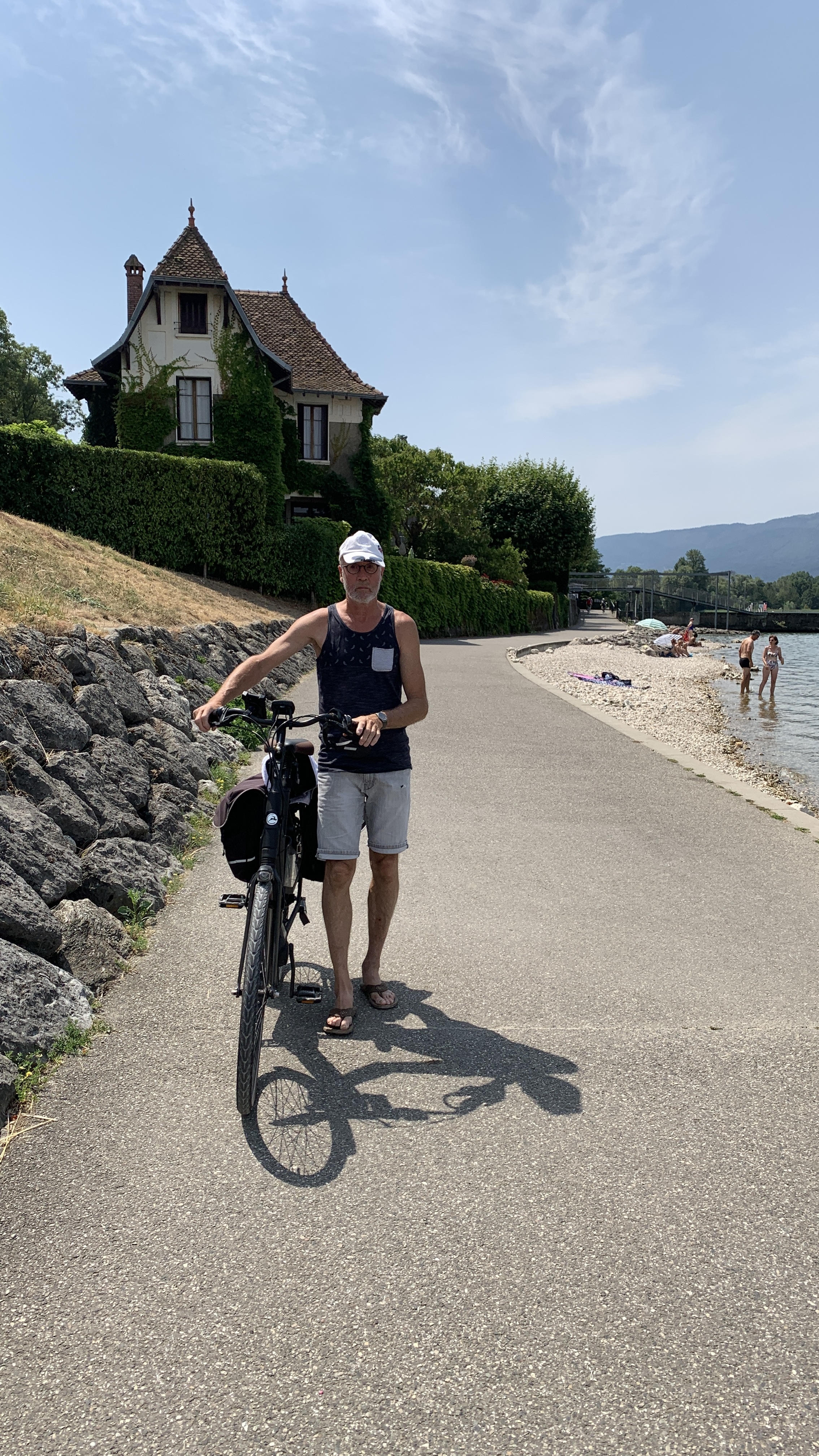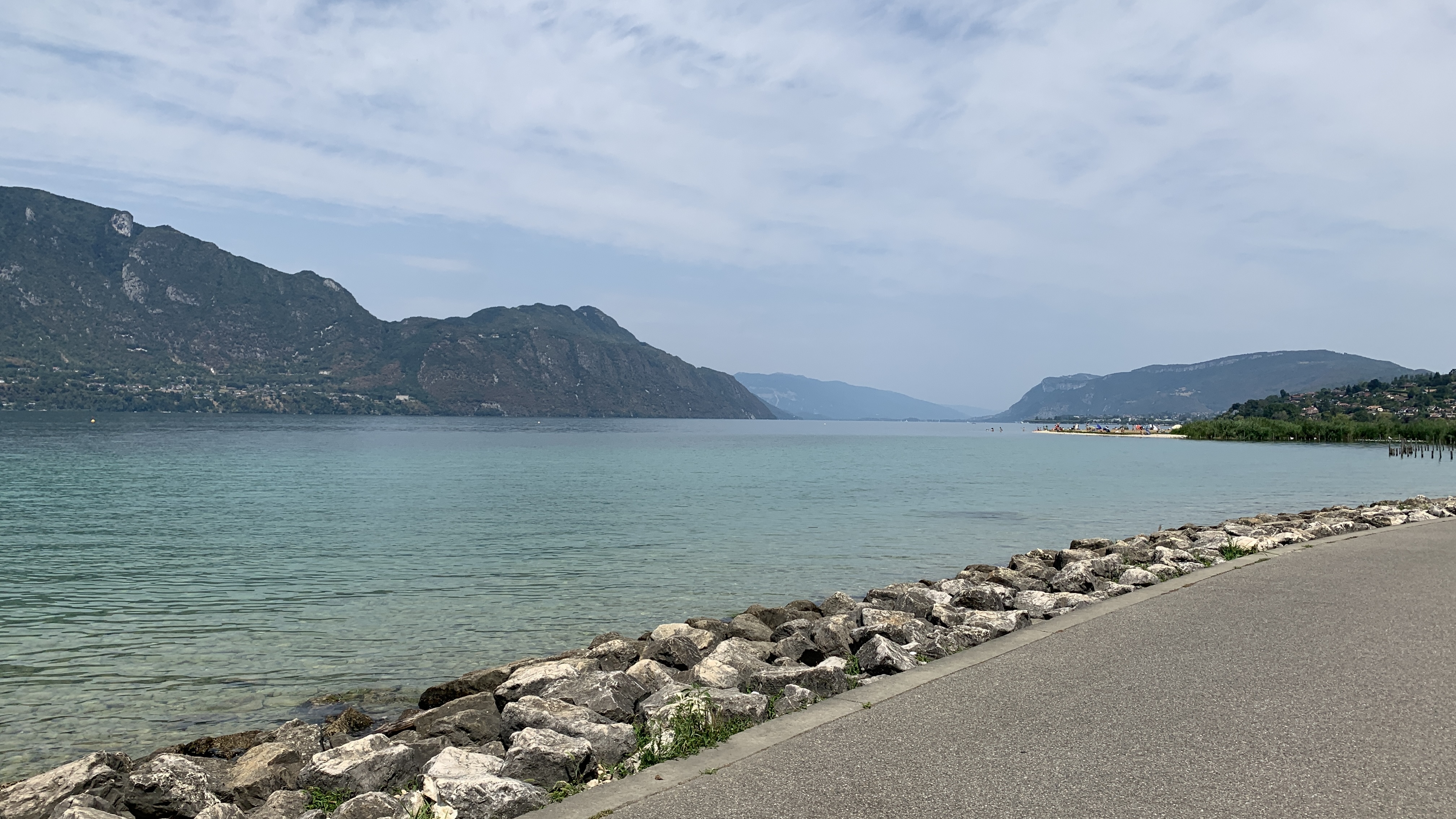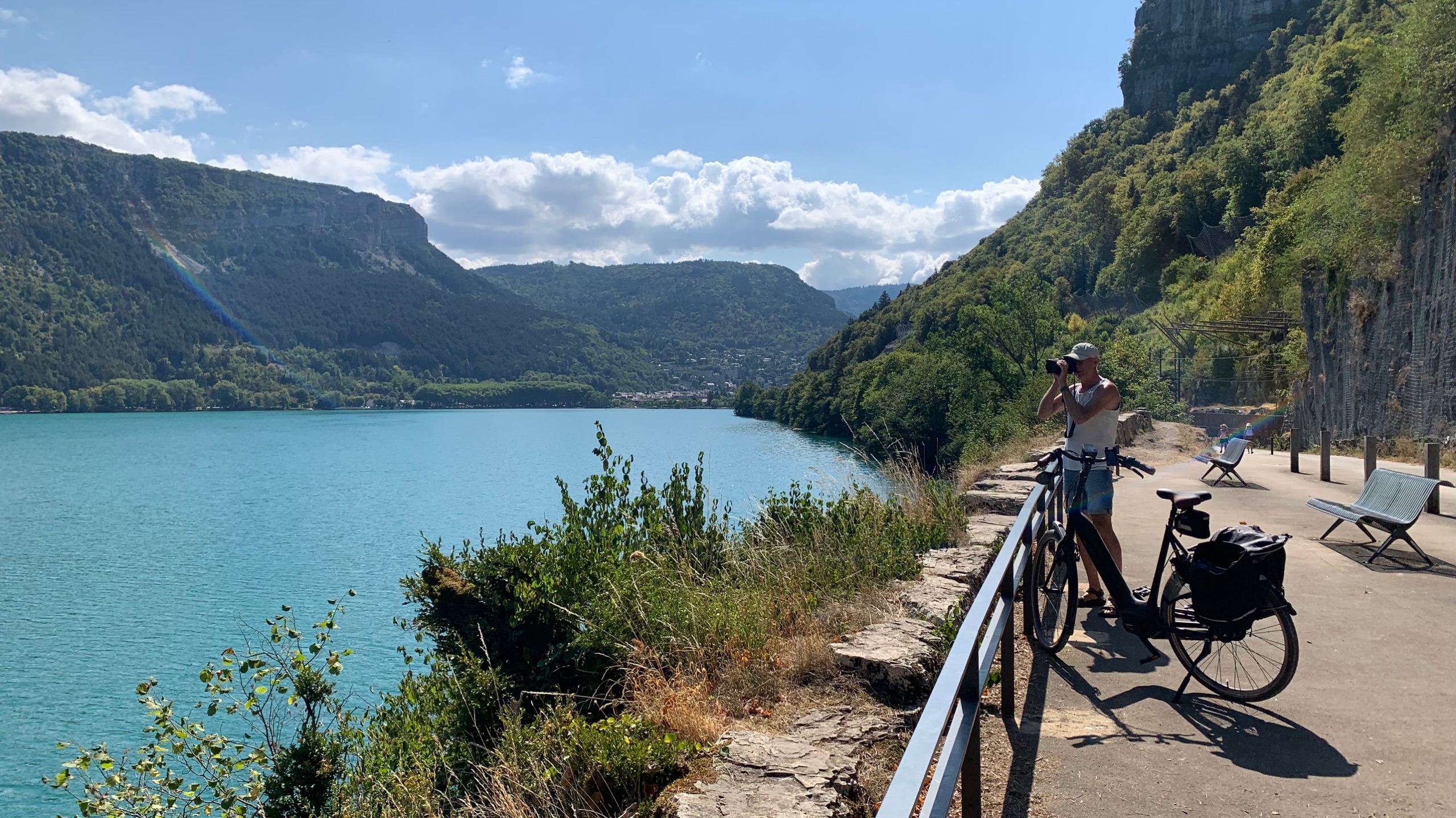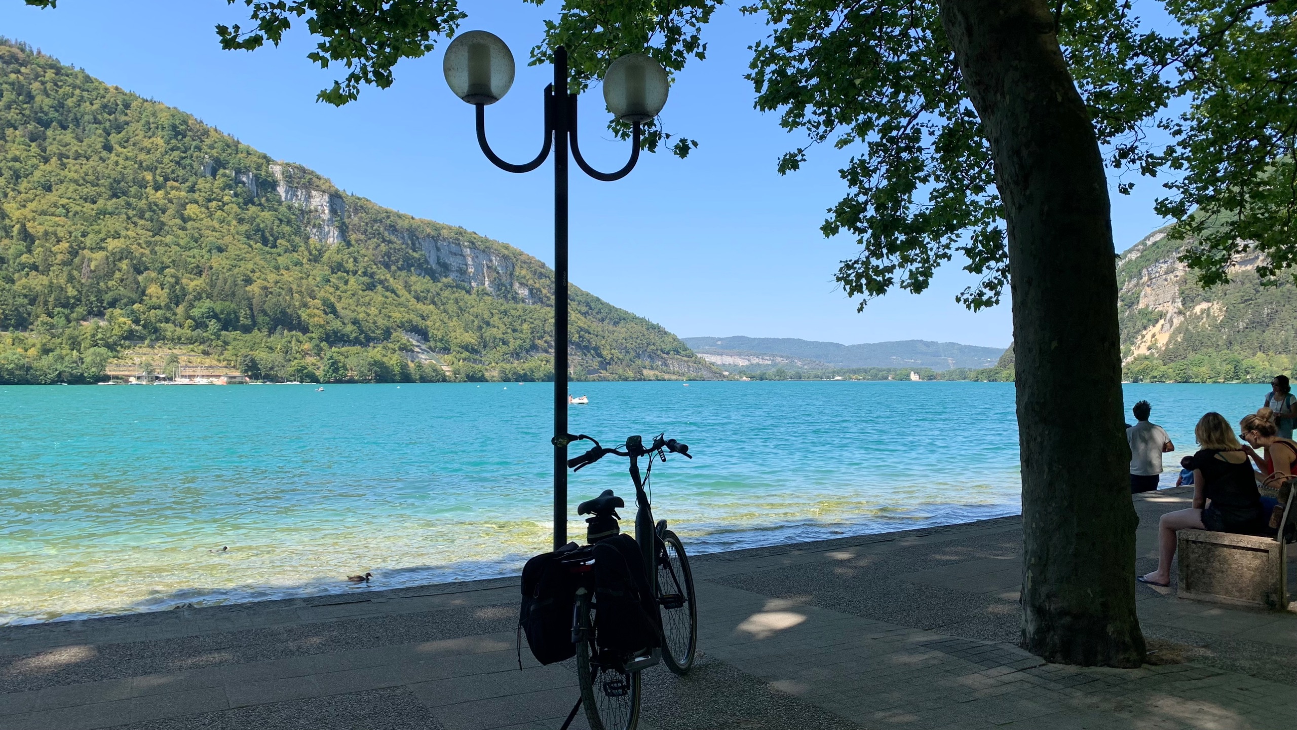 De zon doet zijn stralende best. We gaan watertappen en kunnen weer op weg. We rijden naar het Lac du Bourget en parkeren daar bij de Intermarche en halen een paar boodschappen. Onze fietsen van de camper af en we gaan een stuk langs het meer fietsen. Er is een heel lang fietspad op de plaats van een oude spoorlijn. Het is een prachtig meer. We gaan ook lekker even zwemmen. Prachtig helder water.
