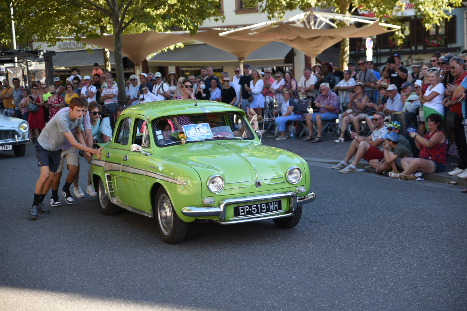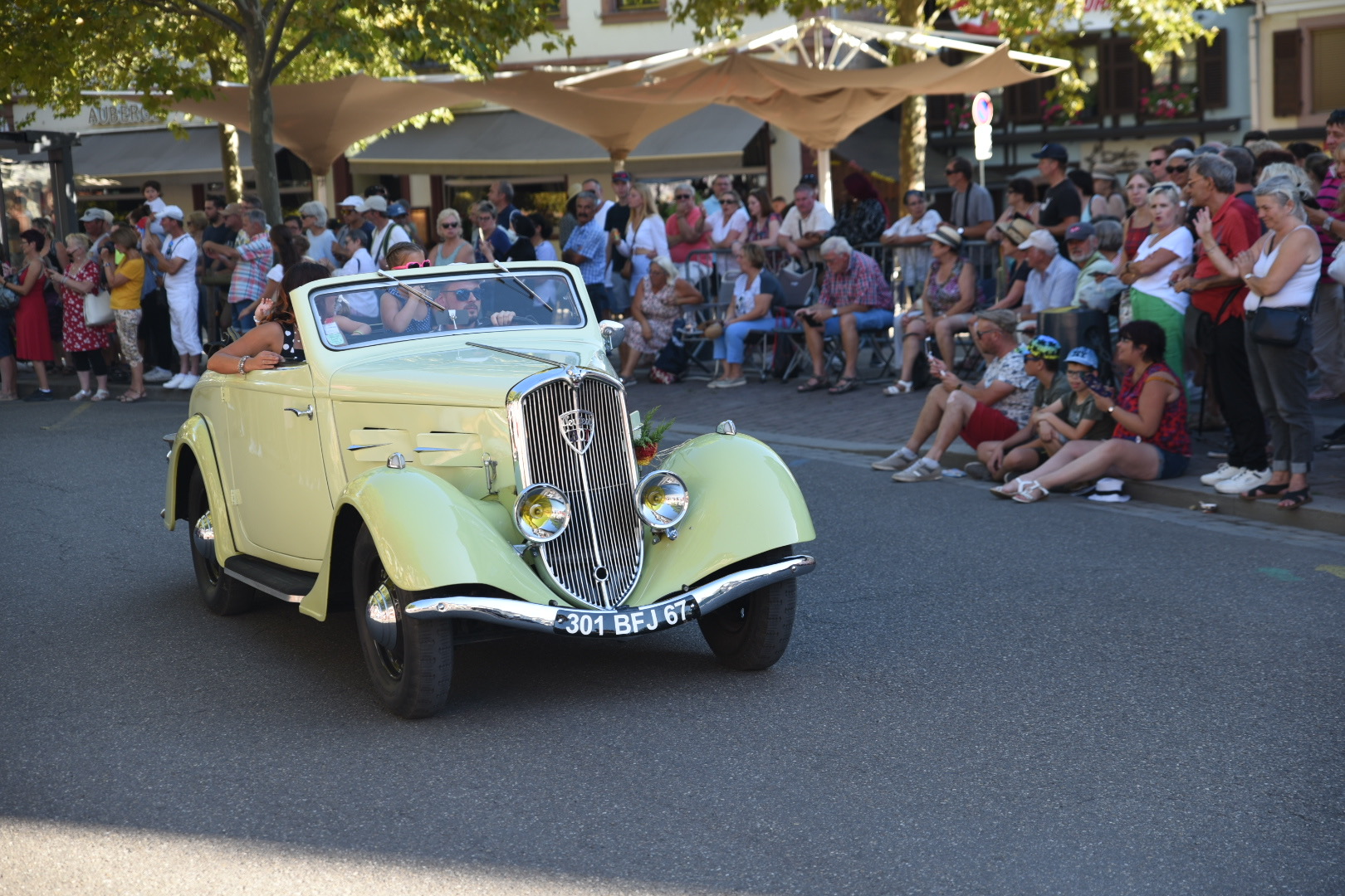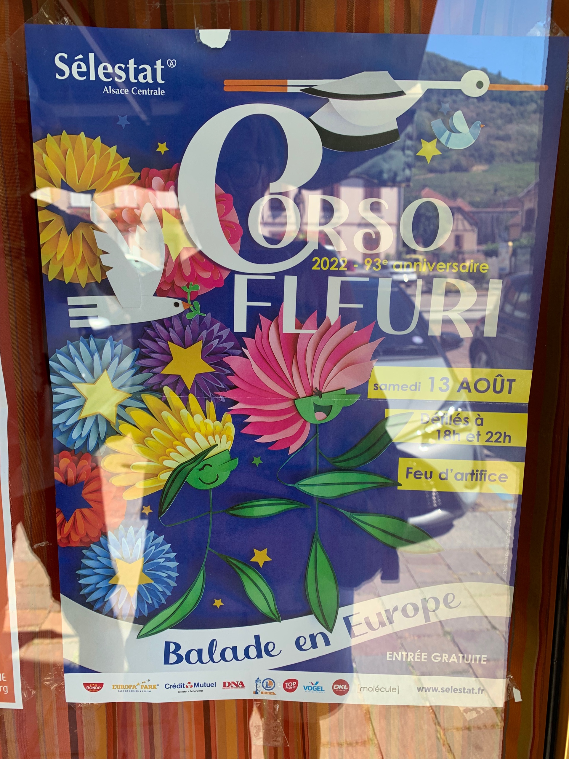 Een nieuw plekje is het doel. Onderweg komen we door een stil Elzas dorpje. Aan de ruit van een winkel hangt een poster. Dahlia corso en vuurwerk in Selestat, daar zijn we vlakbij.