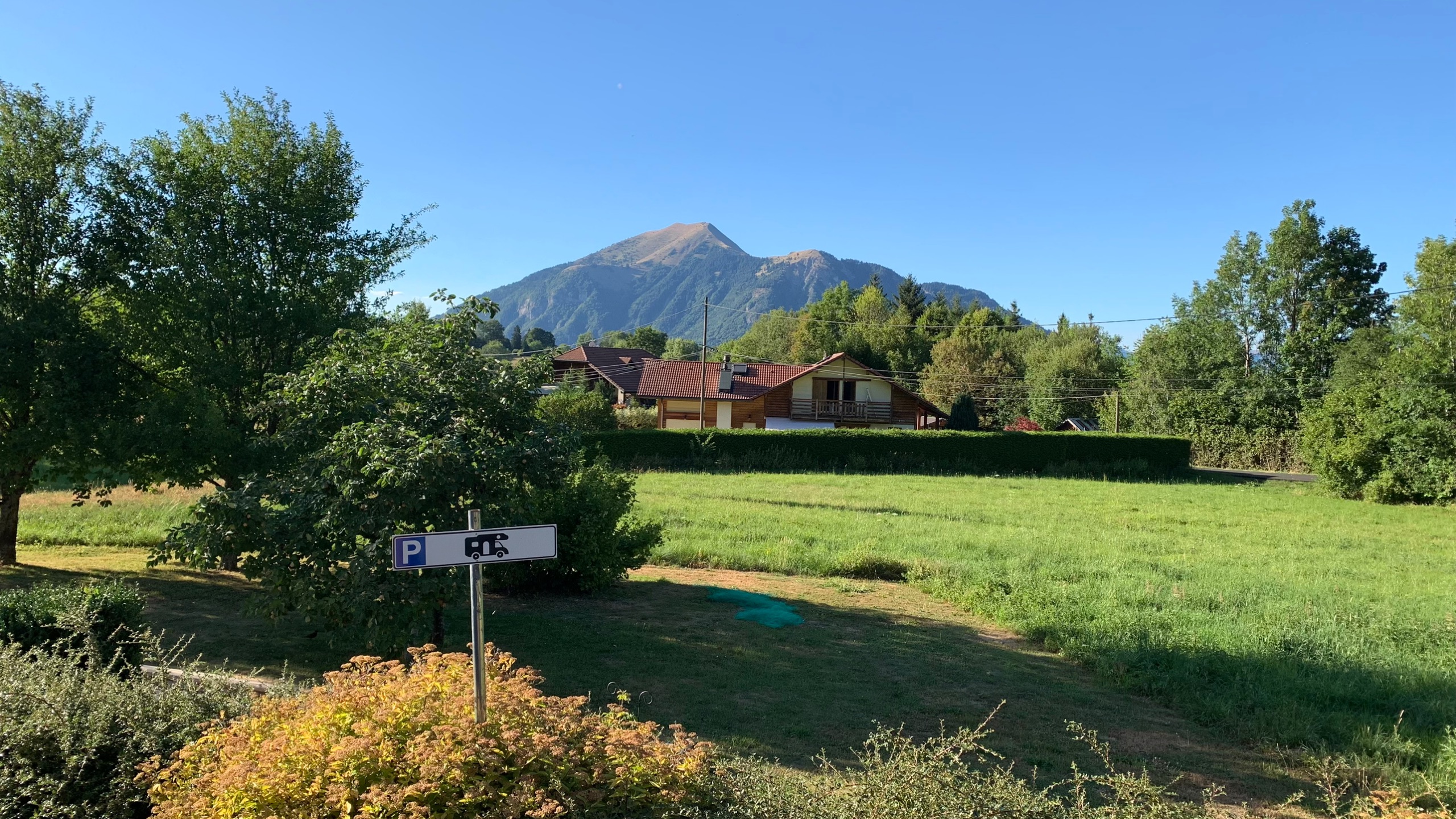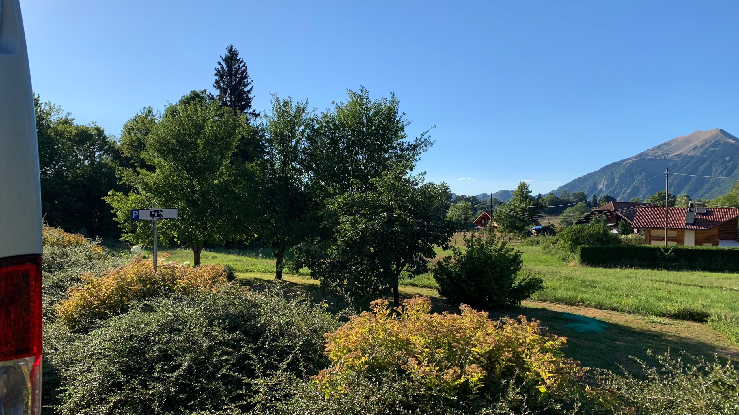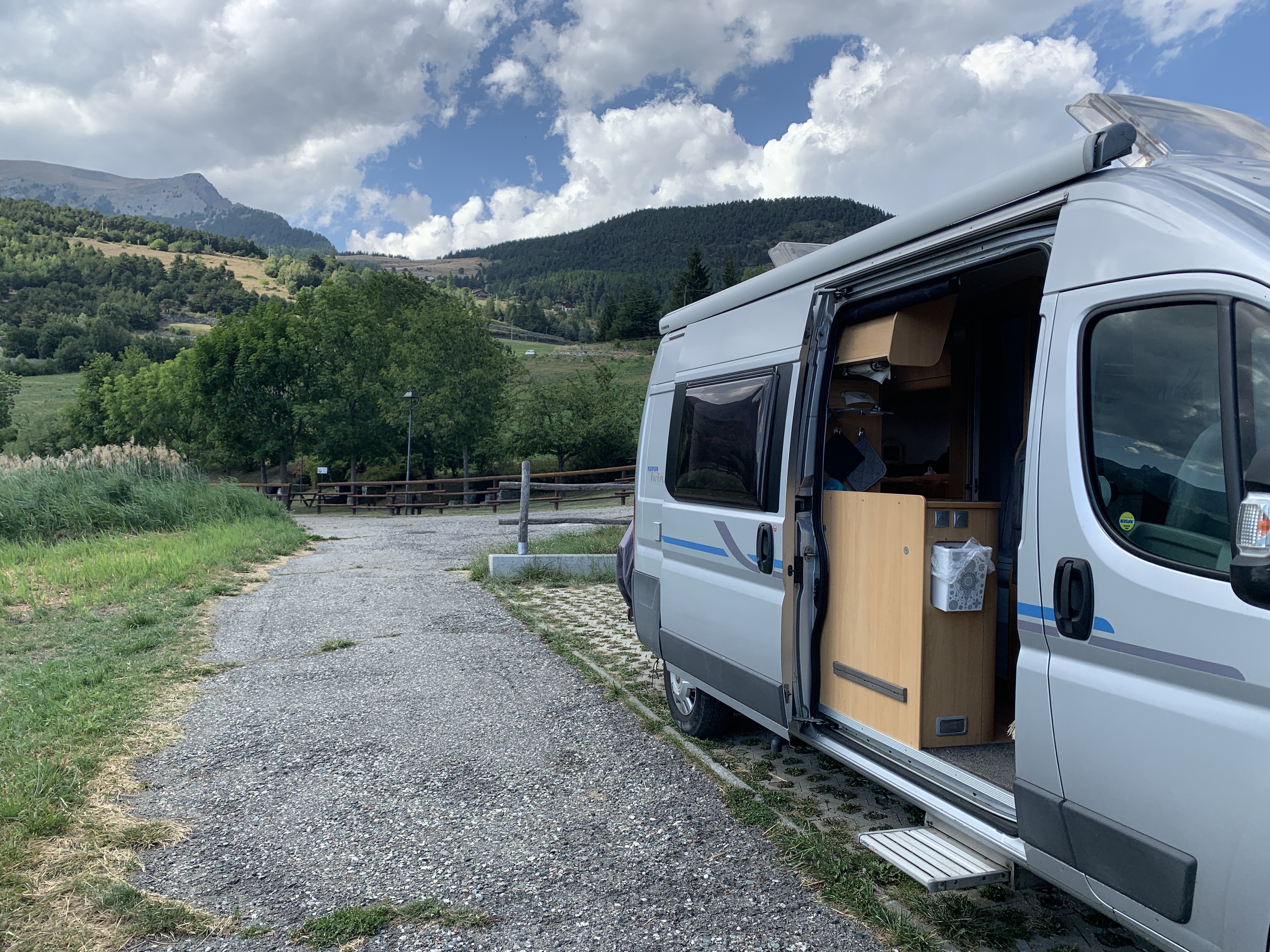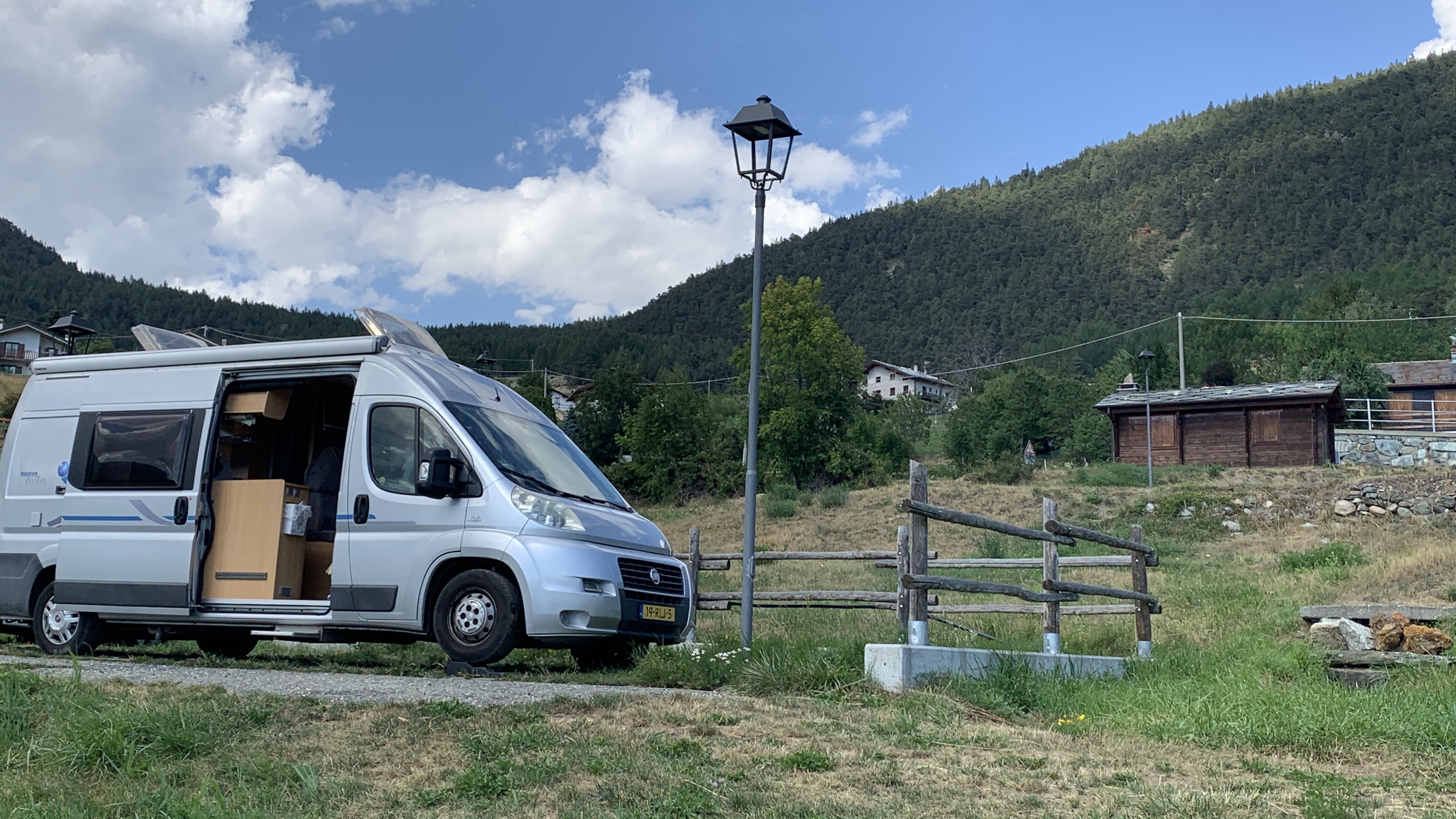 Dan gaan we verder richting Aoste. We nemen daar per ongeluk de autostrada, dat zijn de groene borden 😯 in Frankrijk is groen de route national. Nou ja, we schieten wel op. De camperplaats bij Aoste die we op het oog hadden vinden we niets. We rijden door naar St Dennis. Een grappige route er naar toe. Een soort lintbebouwing langs de berg. Als we arriveren blijkt de kleine camperplaats vol. Dat hadden we niet verwacht bij zo’n plek in the middle of nowhere. Maar ze wijzen ons een naar een klein parkeer terreintje. Een klein stukje terug. Daar kunnen we wel een nachtje staan. We hebben toch ook een kleine camper 😉. Het uitzicht is er prachtig, mooier dan op de camperplaats. En we staan er waarschijnlijk gratis. 😜