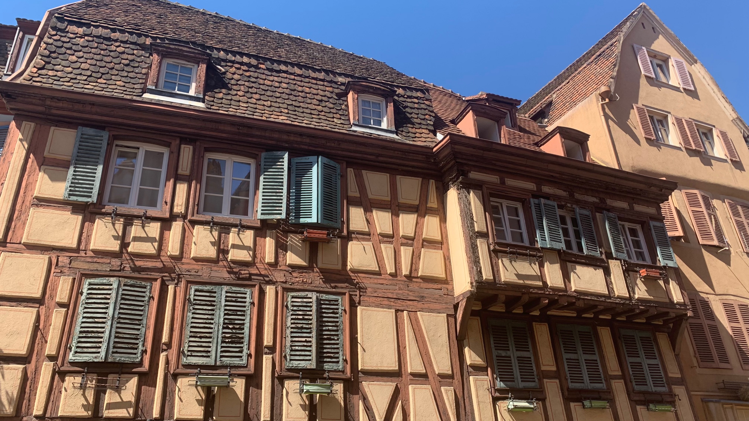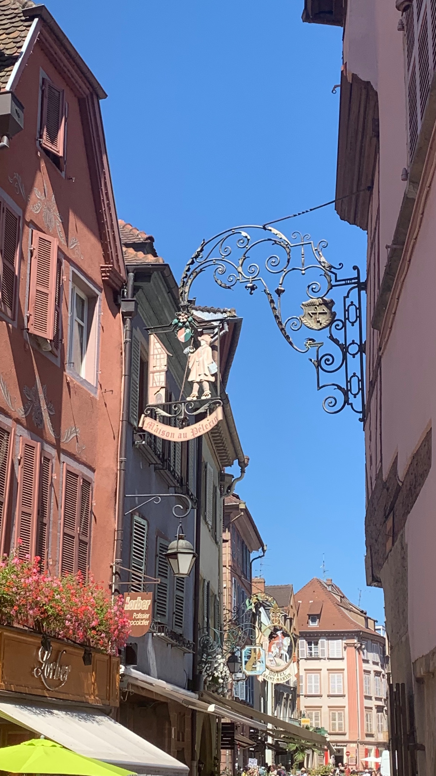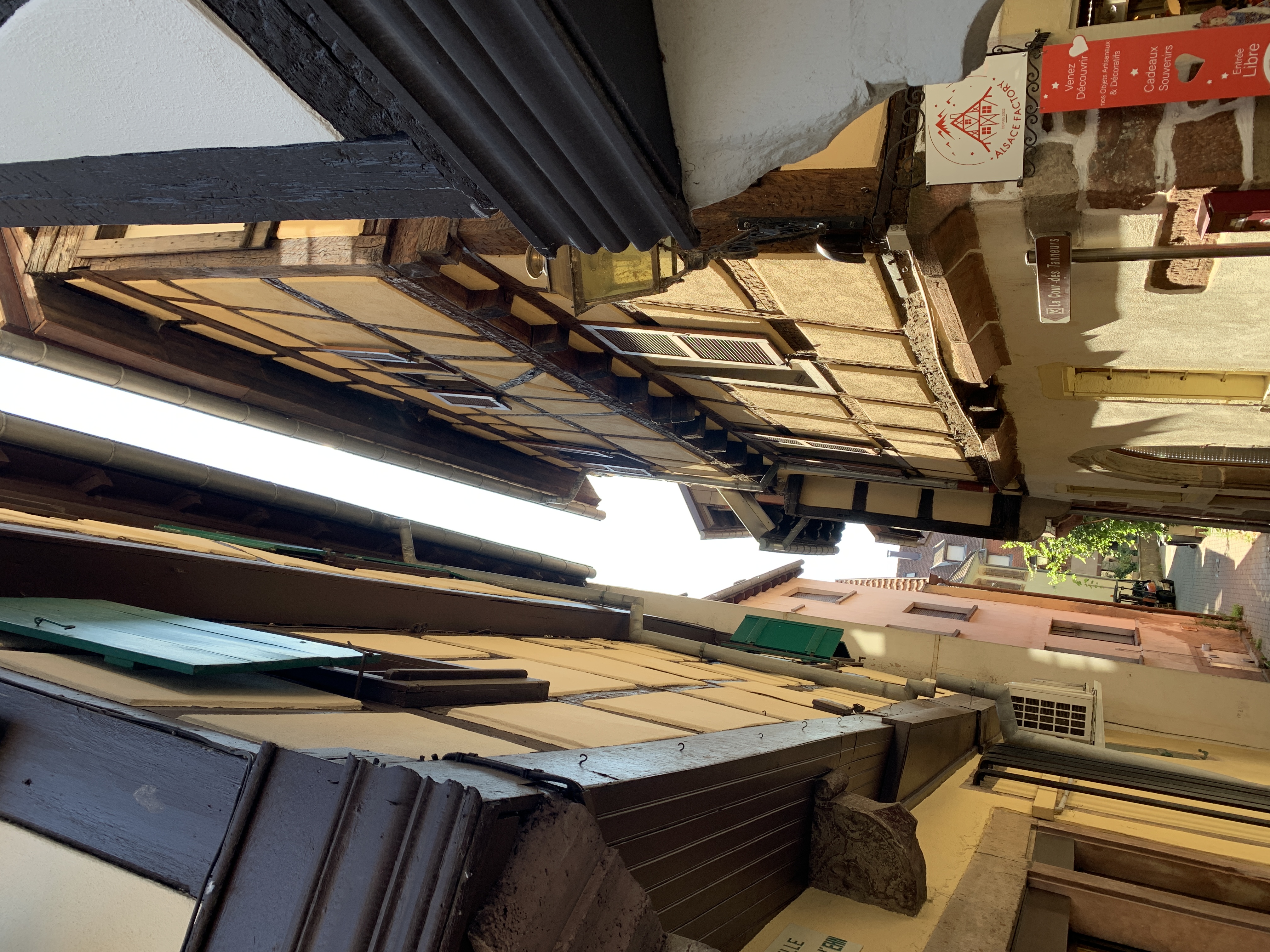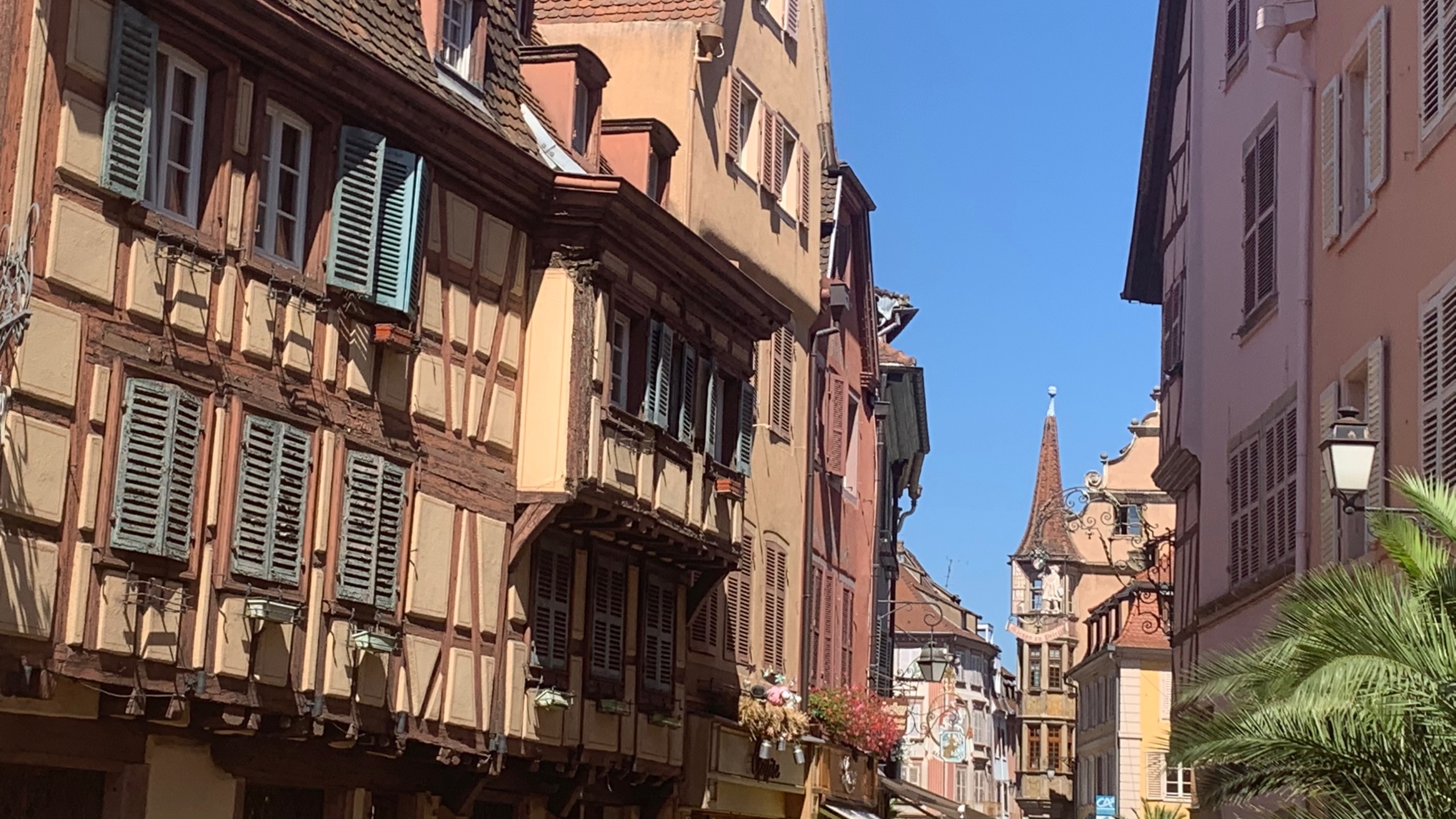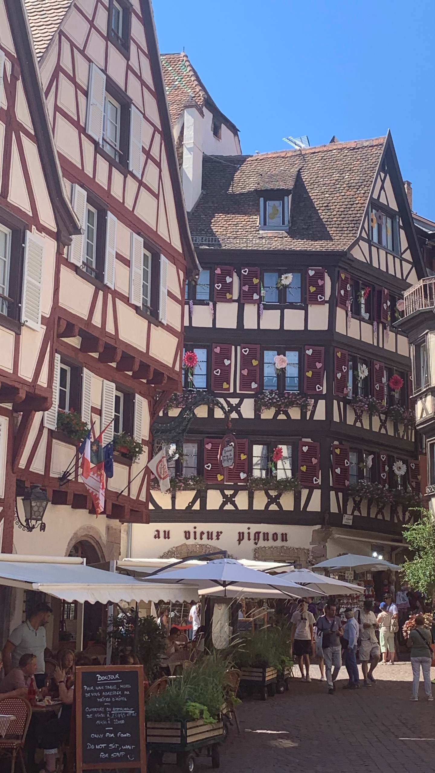 We gaan met de fiets naar Colmar. Een mooi plaatsje en dat vinden heel veel mensen. We wandelen er rond en genieten op een terrasje. Warm blijft het nog steeds.