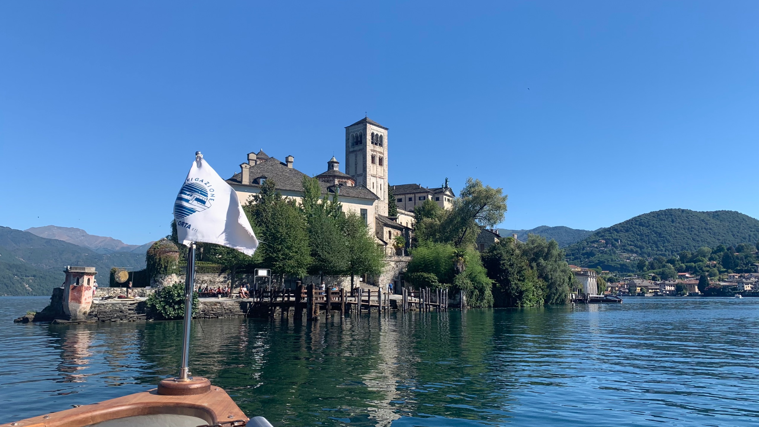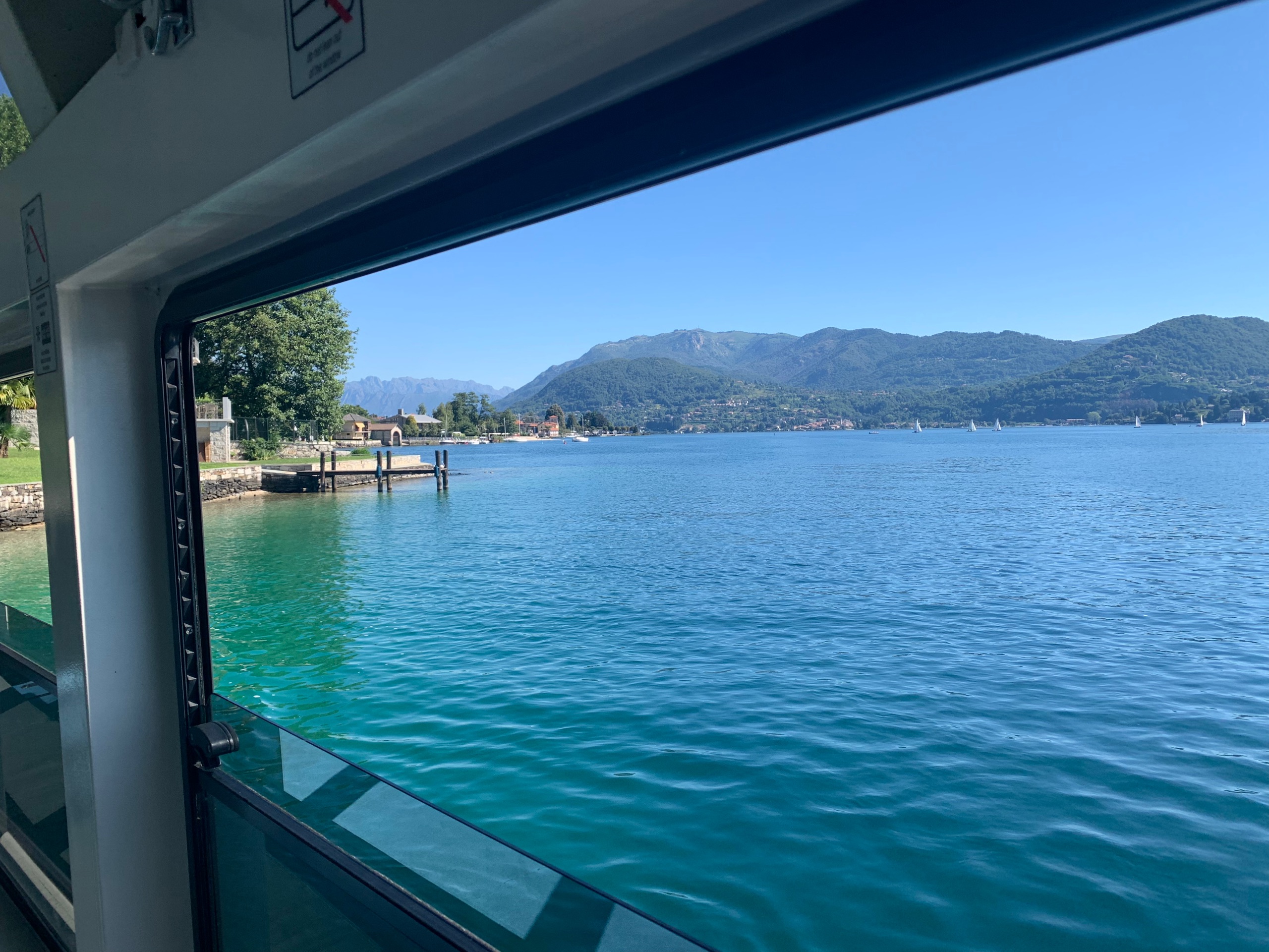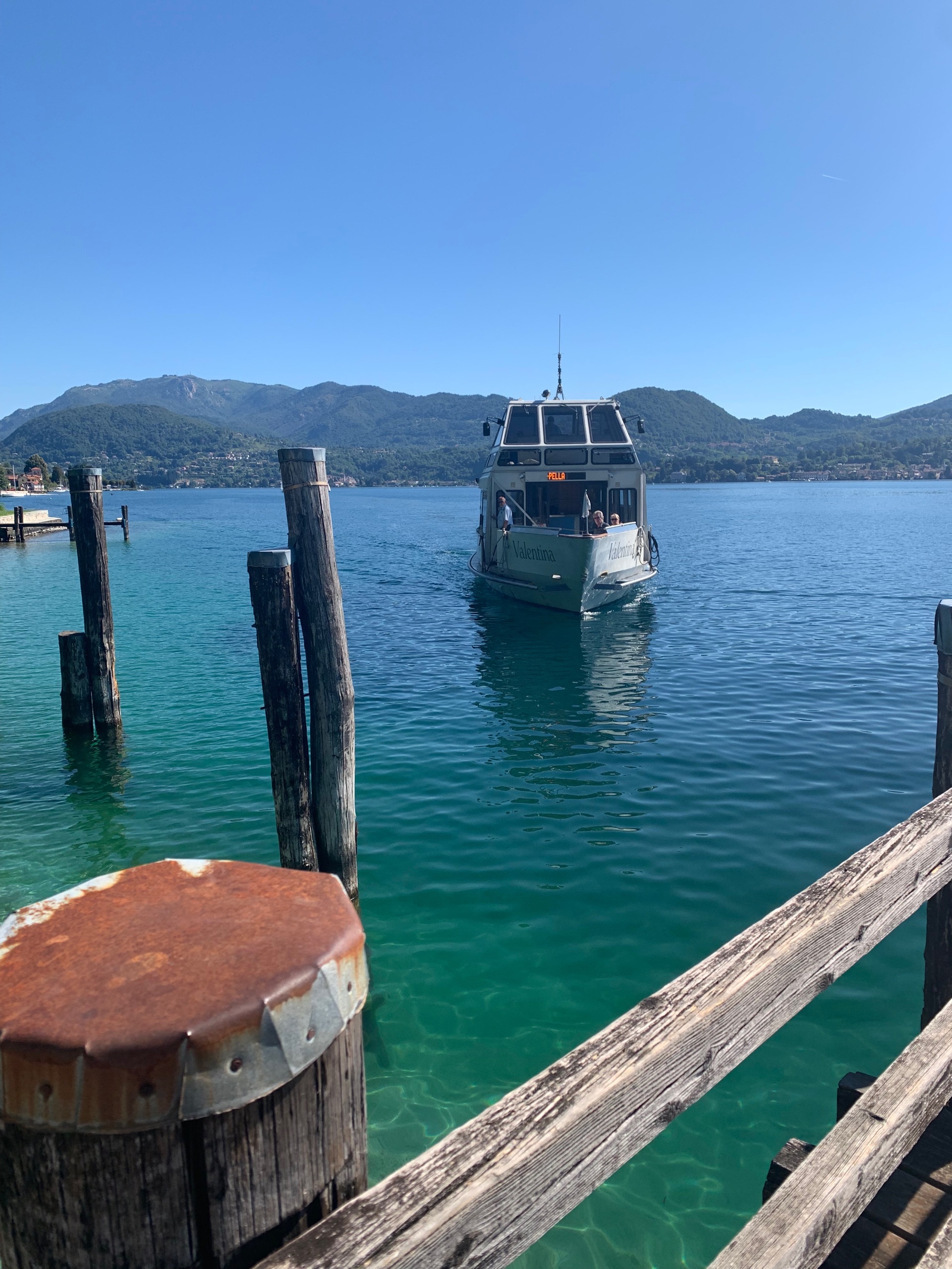 We kopen een kaartje voor de veerdienst over het lago di Orta. Je kunt dan op verschillende plaatsen in en uit stappen. We varen eerst naar Isola San Giulio. Het is een mooi eilandje in het meer met een klooster erop.