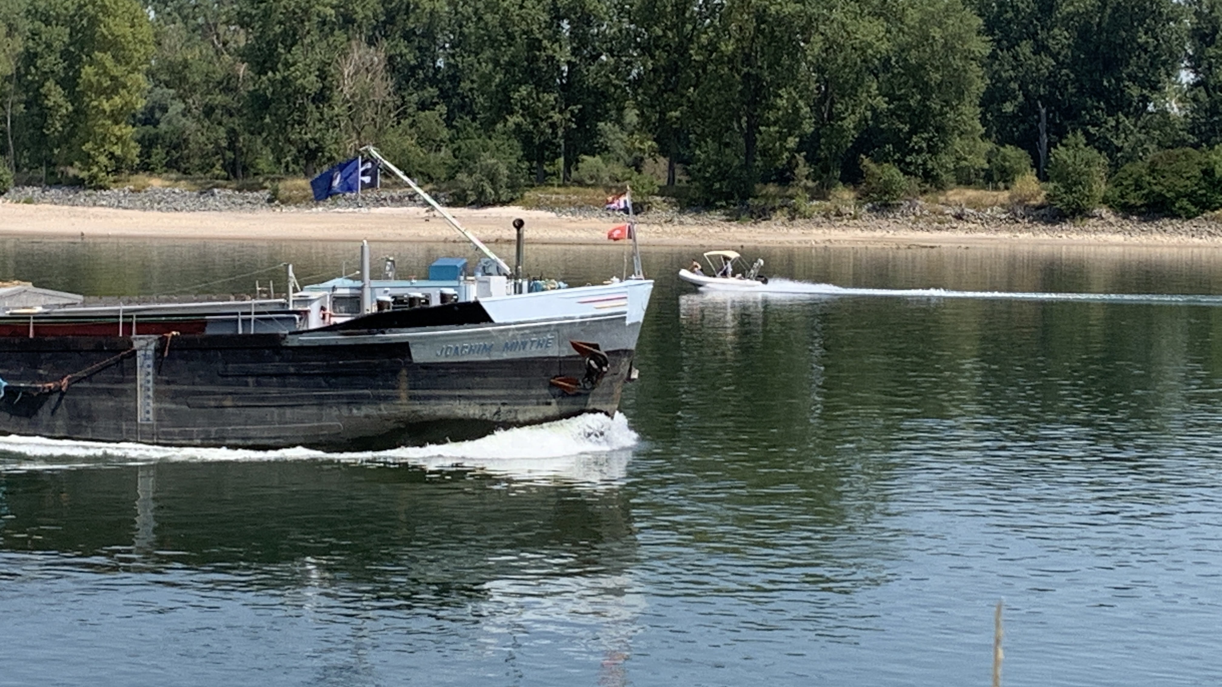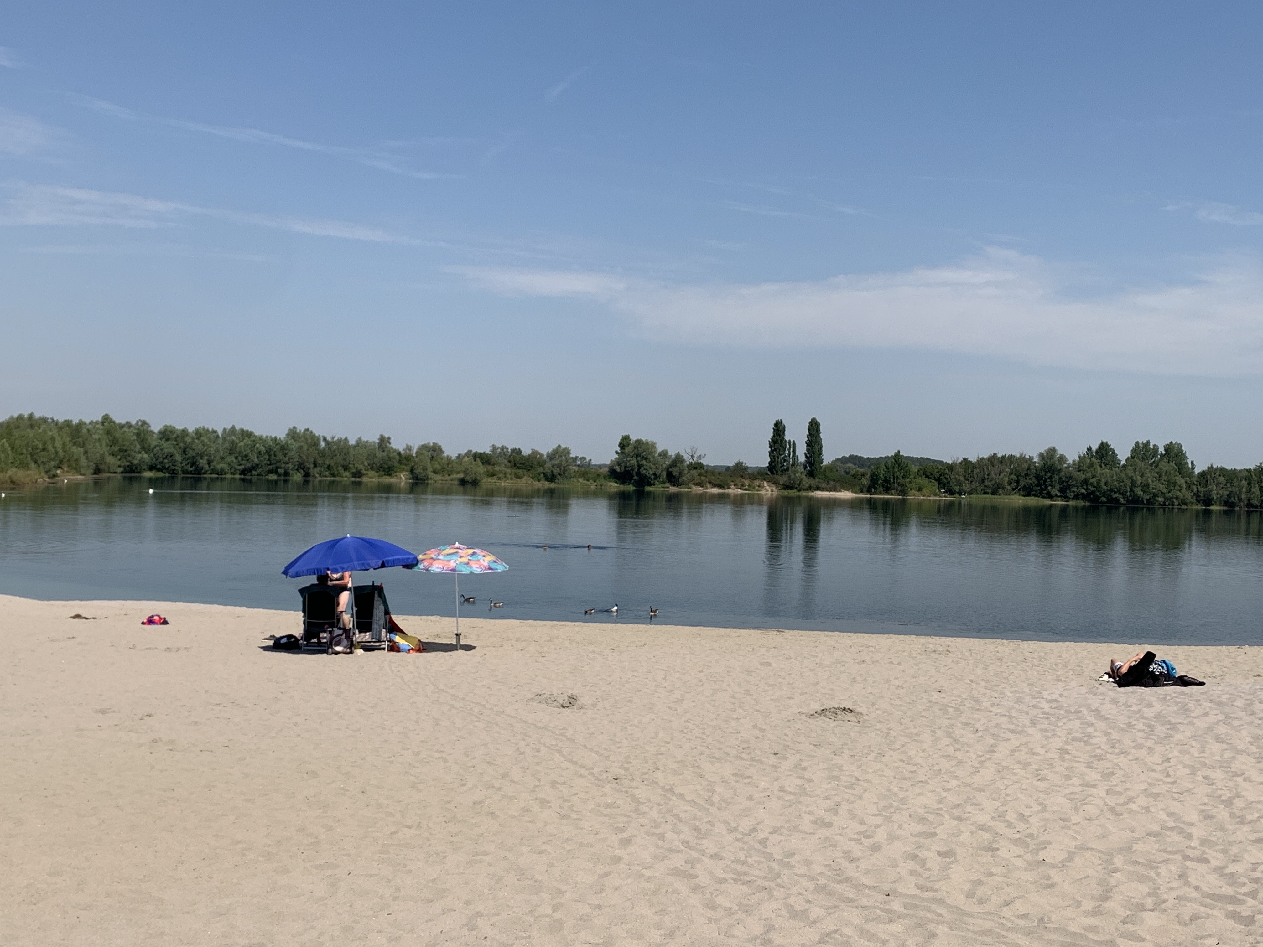 Het is een warme dag, wel minder dan gister. We plannen een fietstochtje naar een zwemmeertje en terug langs de Rijn. Op het heetst van de dag lekker zwemmen. Terug langs de Rijn is het weer erg heet. Terug op de camperplaats zijn we blij dat de sproeier draait. Een heerlijk koele douche 😀.