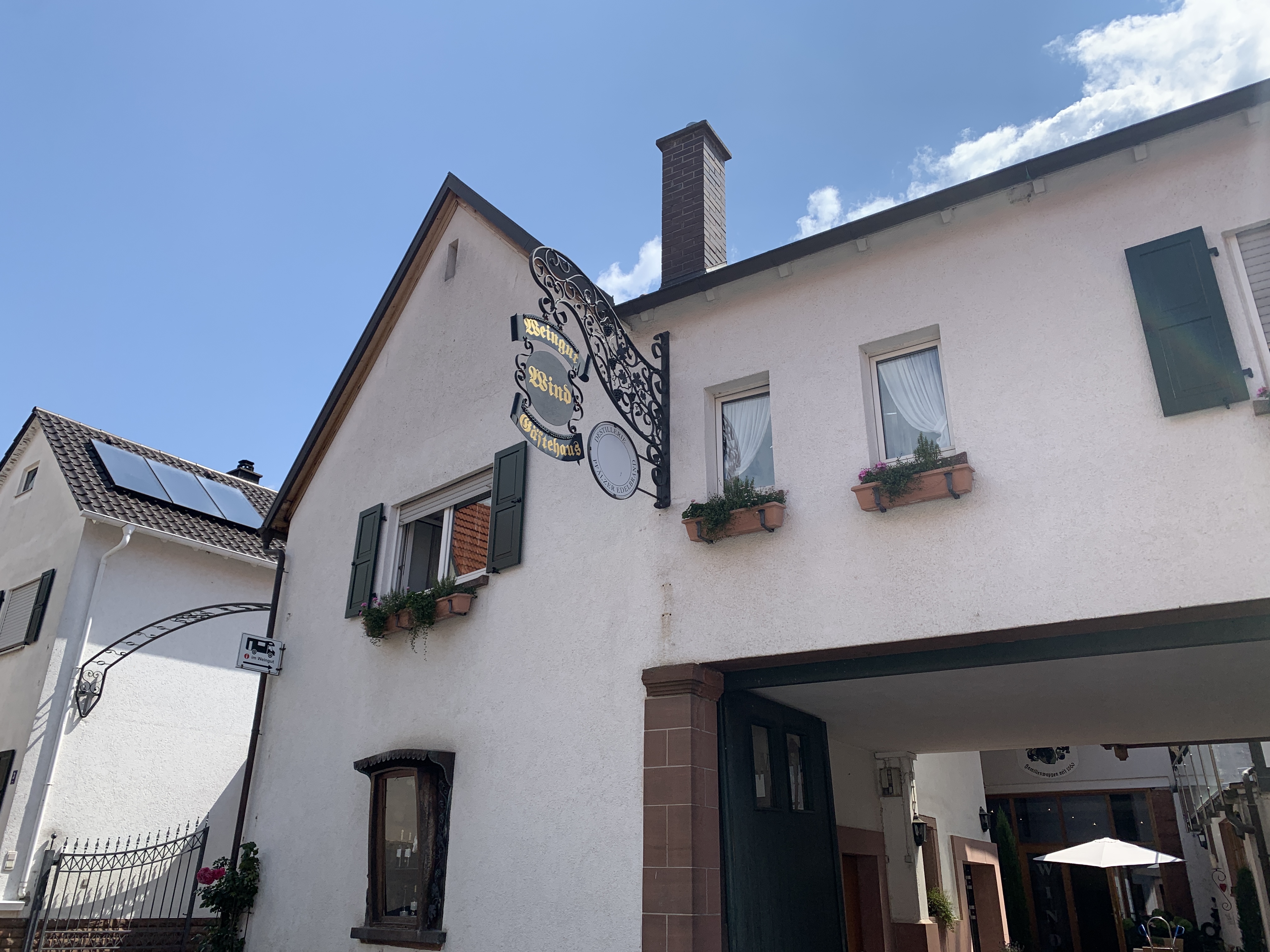 Gisterenavond heeft uiteindelijk het onweer ons toch bereikt. Regen waar de andere morgen niets meer van te vinden is. Wij vertrekken weer van dit plekje. We rijden eerst via een deel van de wijnroute naar Eschbach. Hier hebben we een paar jeer geleden overnacht bij Weingut Wind. We halen er nu enkel een paar flessen wijn die we toen lekker vonden.