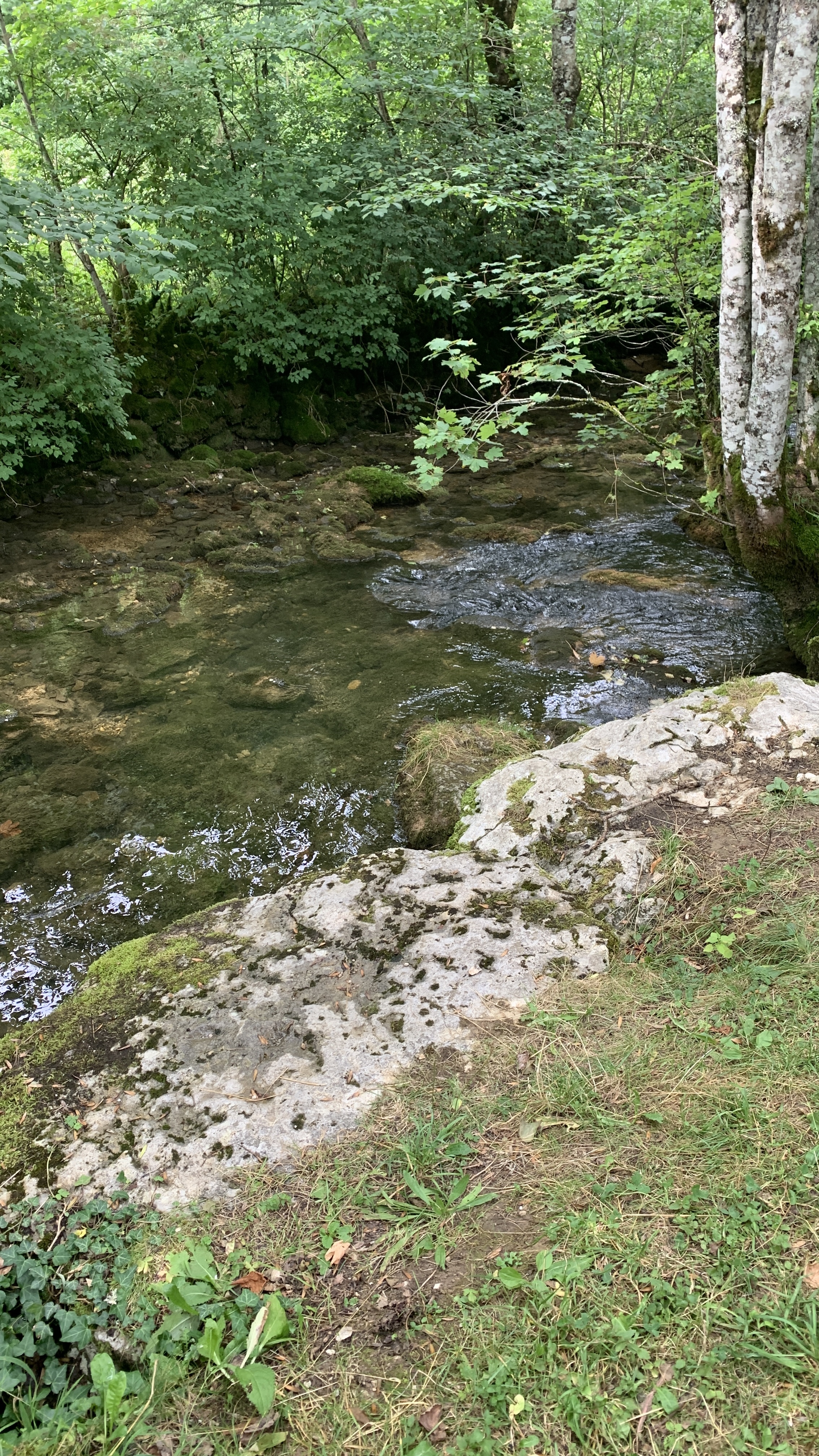 We gaan weer door en komen bij de waterval Pain du Sucre. Toen we vroeger in de Jura kampeerden zijn we hier ook geweest met de jongens. Lekker gezwommen en onder de waterval gestaan. Maar nu, nauwelijks water en in het beetje wat er is “baignade interdit”. Het is verdrietig om dit te zien.