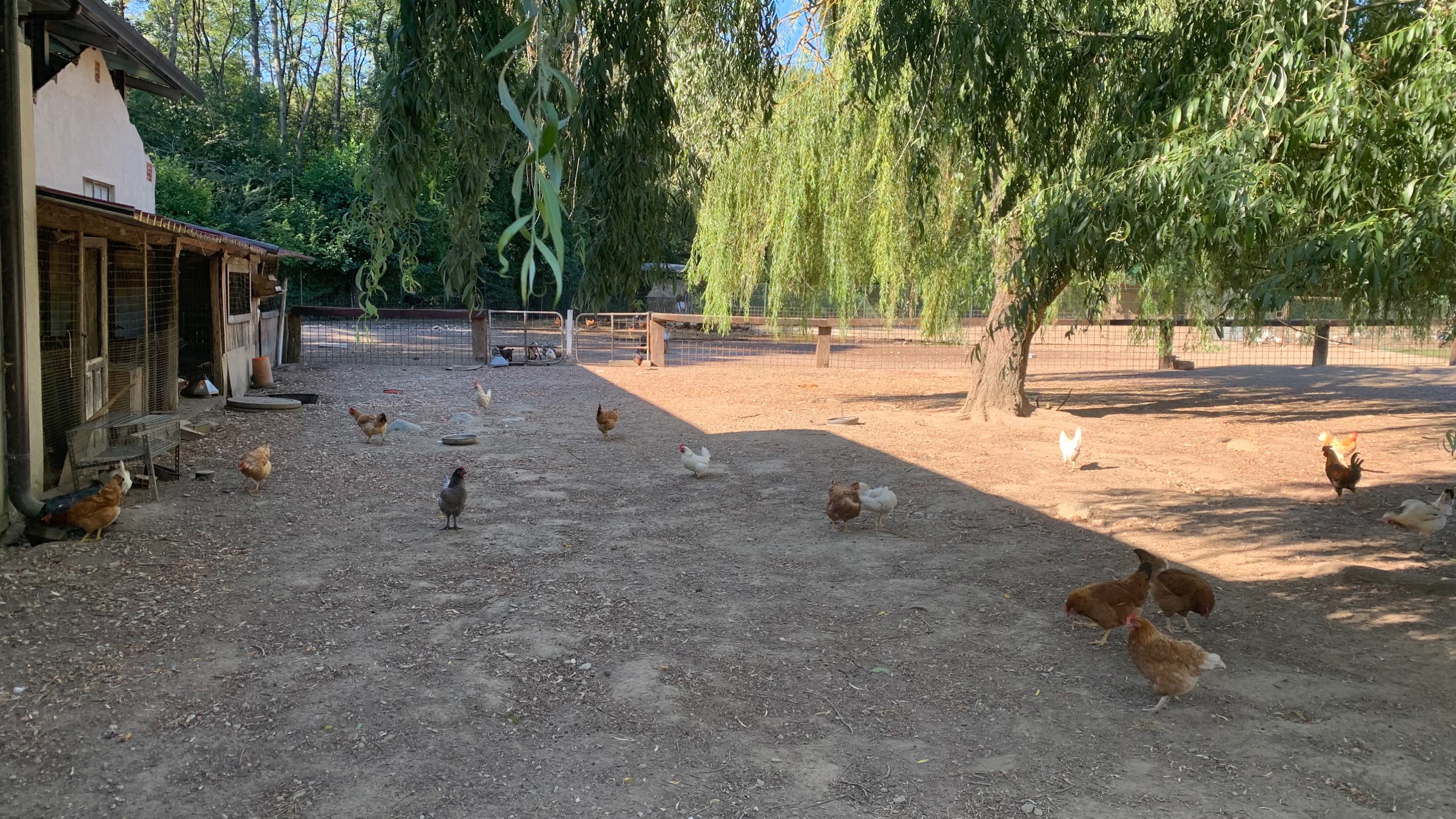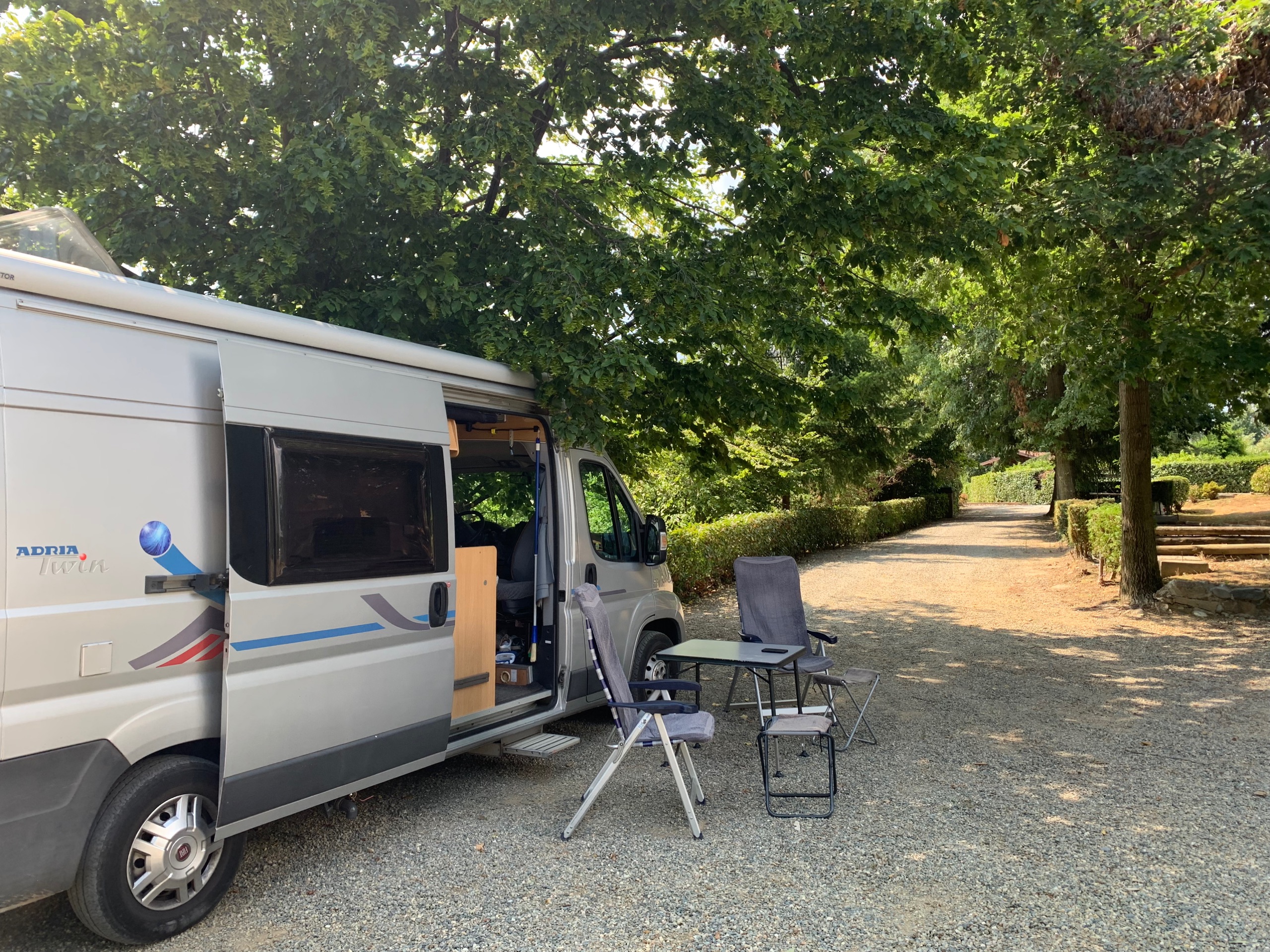 Dan gaan we op weg naar een boerderijplaats van Agricamper. Agriturismo Molino del Sabbione. We krijgen er een mooi plekje in de schaduw naast de kippen en andere beesten.