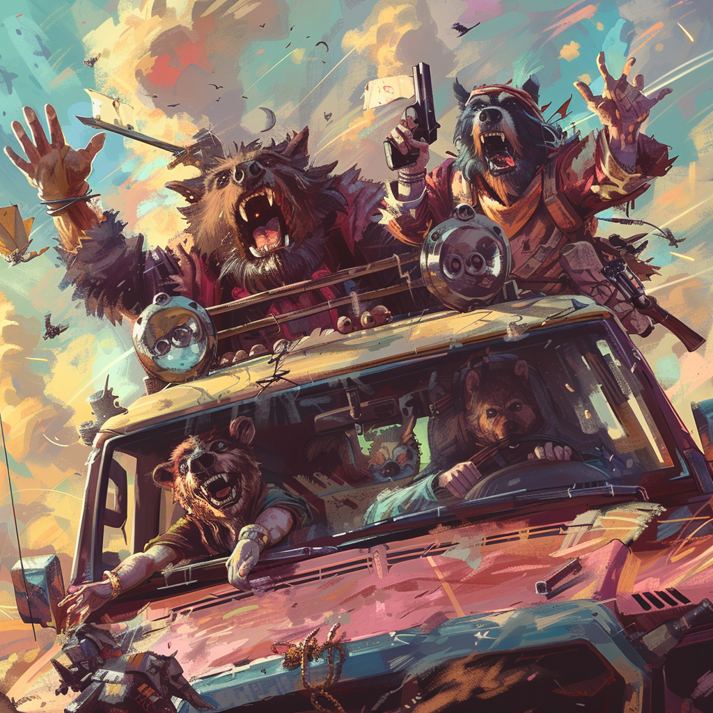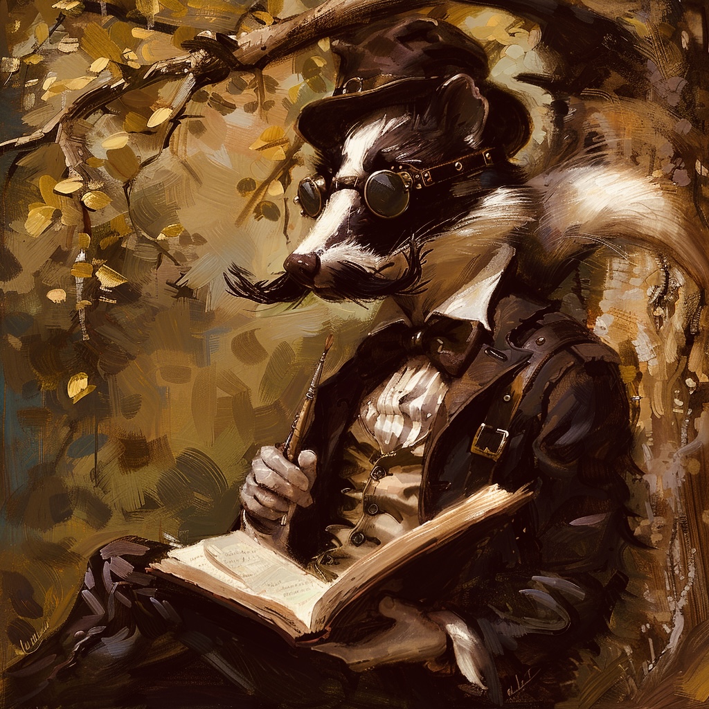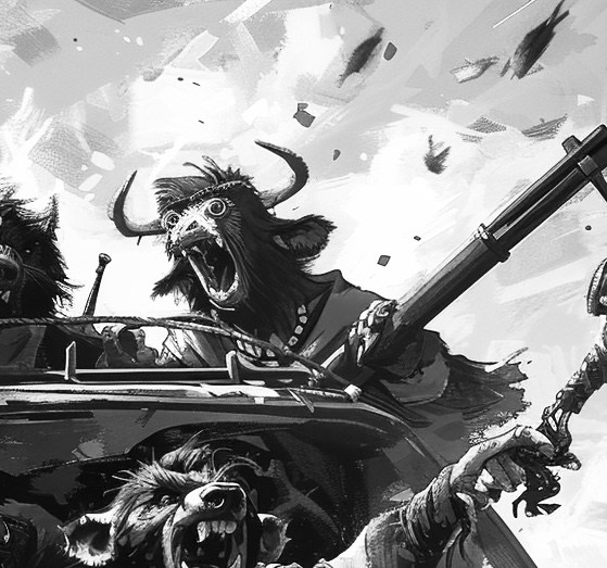 “Dearest Mabel, as I traversed yon hill's crest, my eyes gazed upon a no-good weasel and his bitter buffalo companion. Armed with rifles, it was clear that they sought strife. I was not about to lose another train full of supplies to the likes of them. So with My trusty clockwork pistol in hand, I readied for the impending fray…”