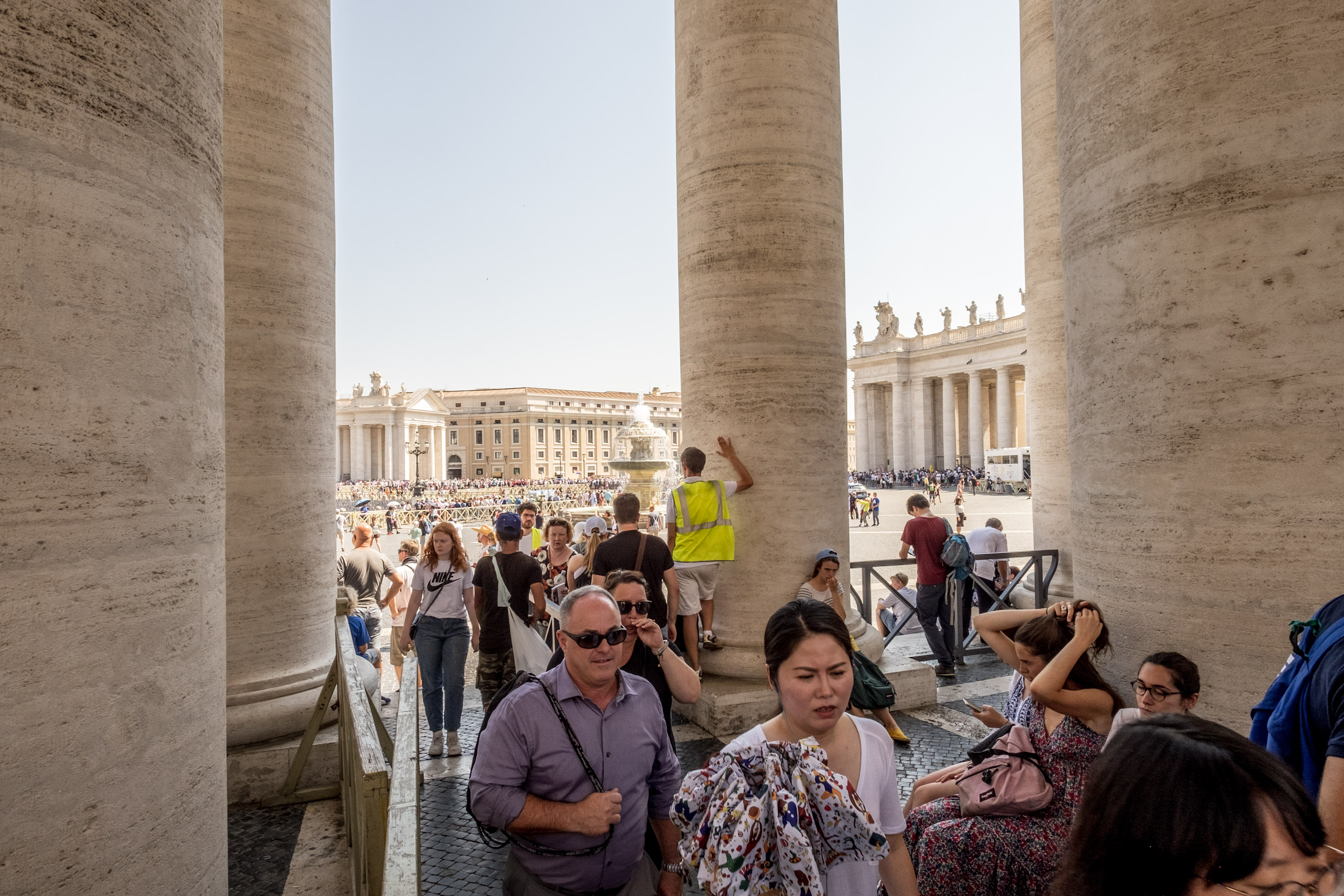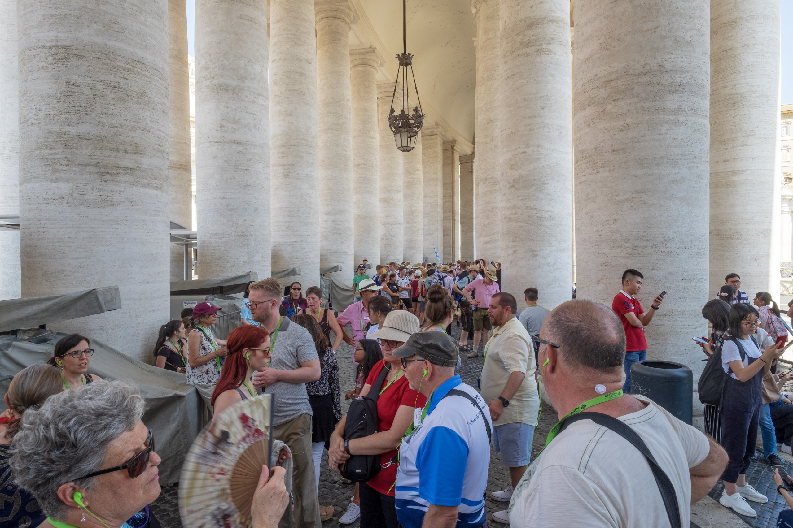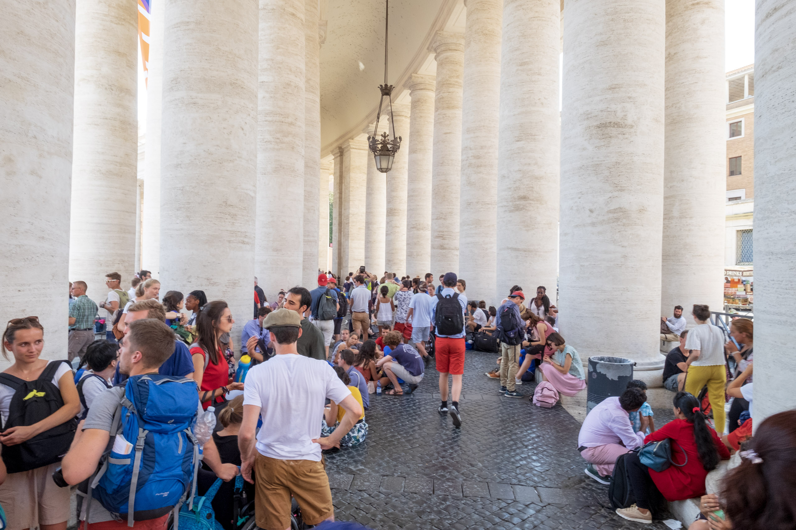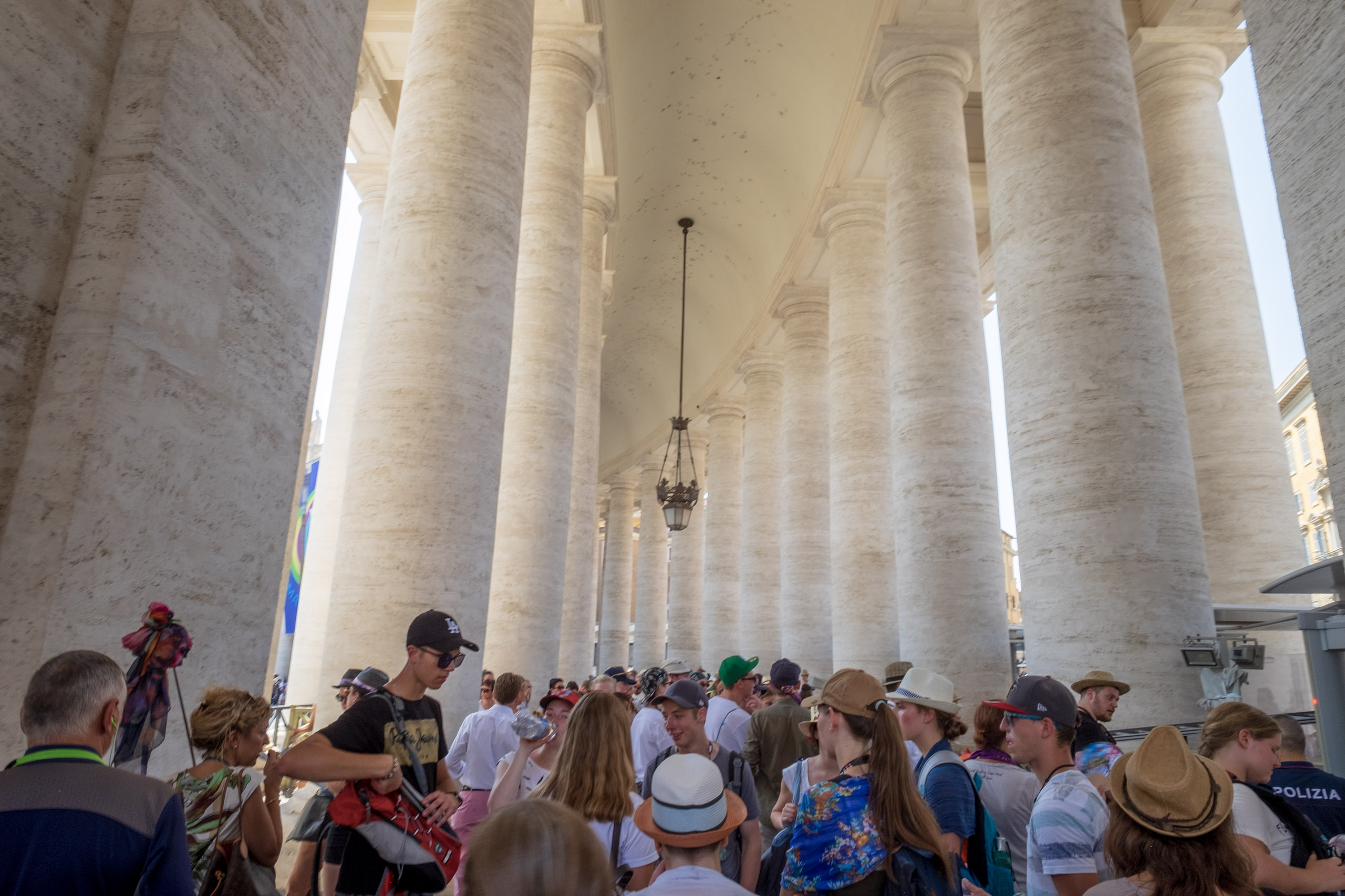 We experienced huge crowds, mostly youth groups who were seeking shade in the columns surrounding St. Peter’s Square when we exited.