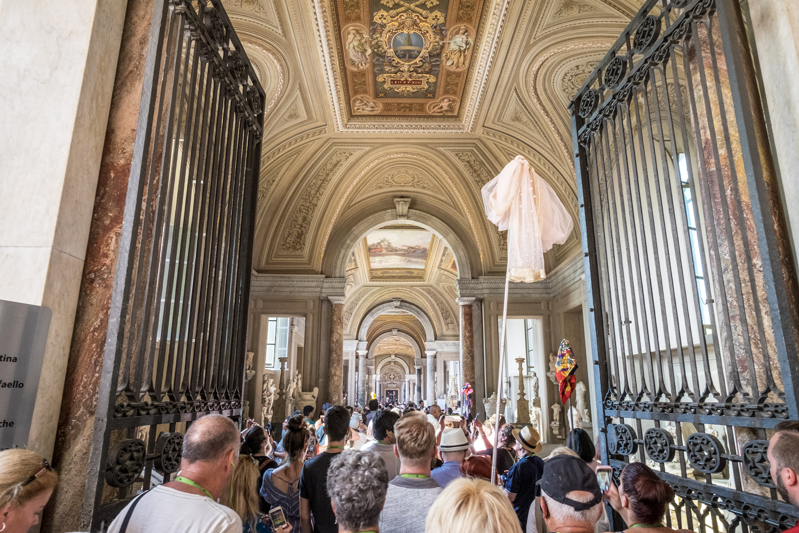 Our tour director prepared us with several comments about “jumping the line” and “early entrance.” At first it sounds leisurely, right up until the coach rolls up. Then we realize that all the tour companies have “jump the line” status. This could be a problem. People, hordes of them, are everywhere, milling about, as if movement would stave off the heat. Our tour director, Sasha, explains the need to use the Vatican “Radios” for listening to our local guide. There is no allowance for outside communication devices. “Holy radios” - who knew?