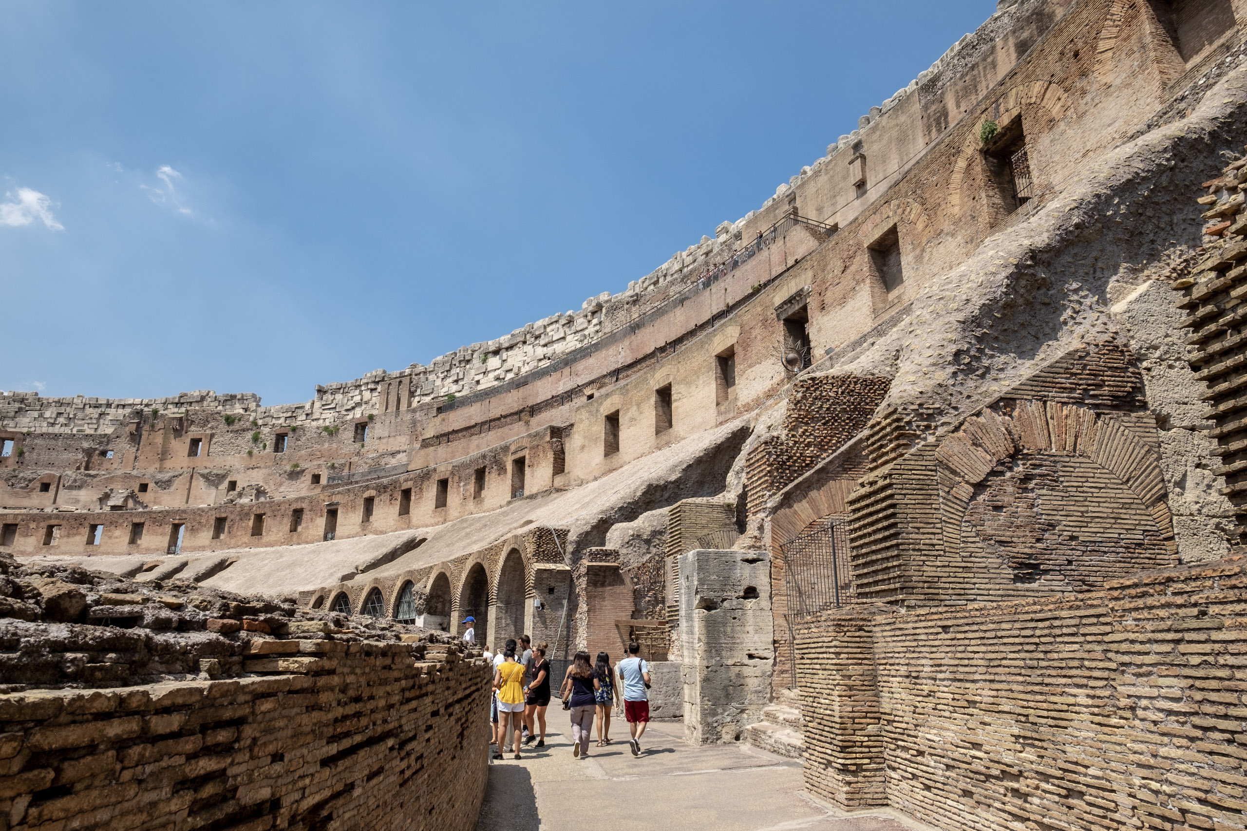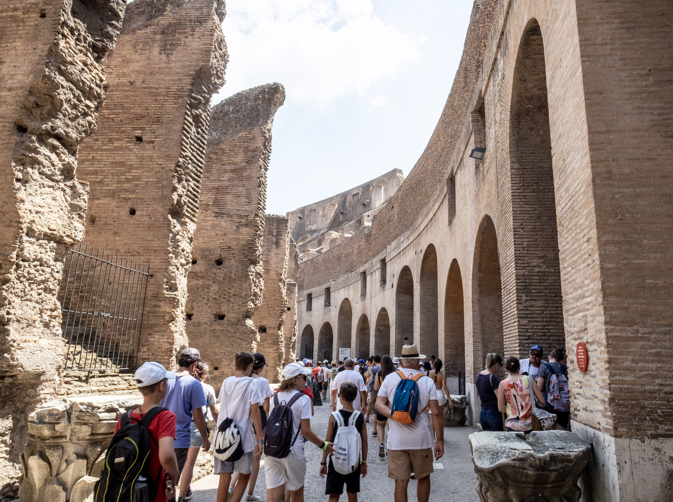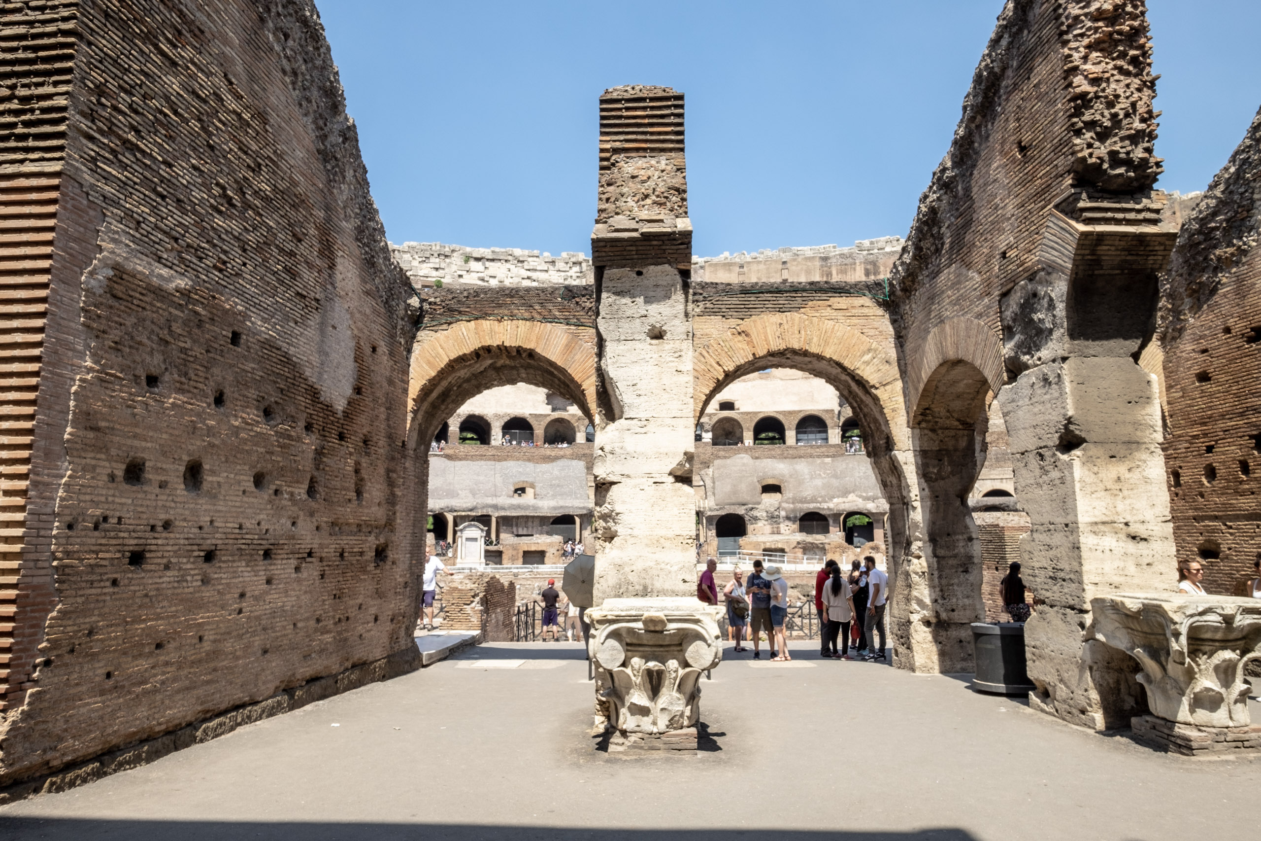We reboard our coach, only to find that we are two short. Our Australian companions are nowhere to be found. We press on regardless, and take a scenic route to the Colosseum grounds. Christina warns all to avoid the street vendors and their cold water, as it is often from untested, bacteria-rich sources. We arrive near the Arch of Constantino, which we’re told served as inspiration for the Parisian Arc de Triomph. The Colosseum is teeming with fans, not unlike its Los Angeles relative on Fall weekends. It is in surprisingly good shape, and we are able to navigate two levels. Christina tells us that the levels are organized according to social strata, with the most well connected and wealthy of the Imprerial era enjoying the best seats. It all sounds more than vaguely familiar. . . .