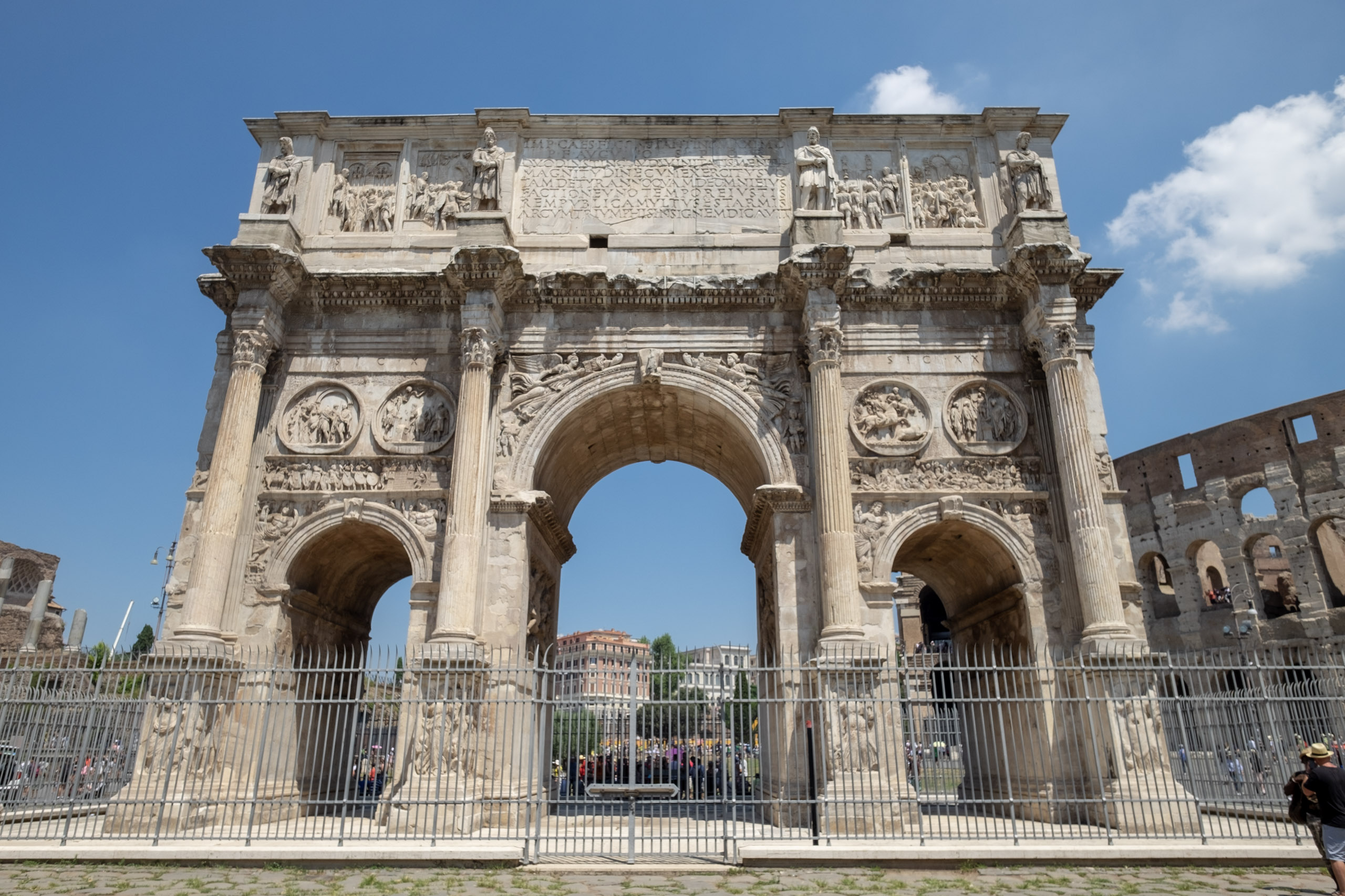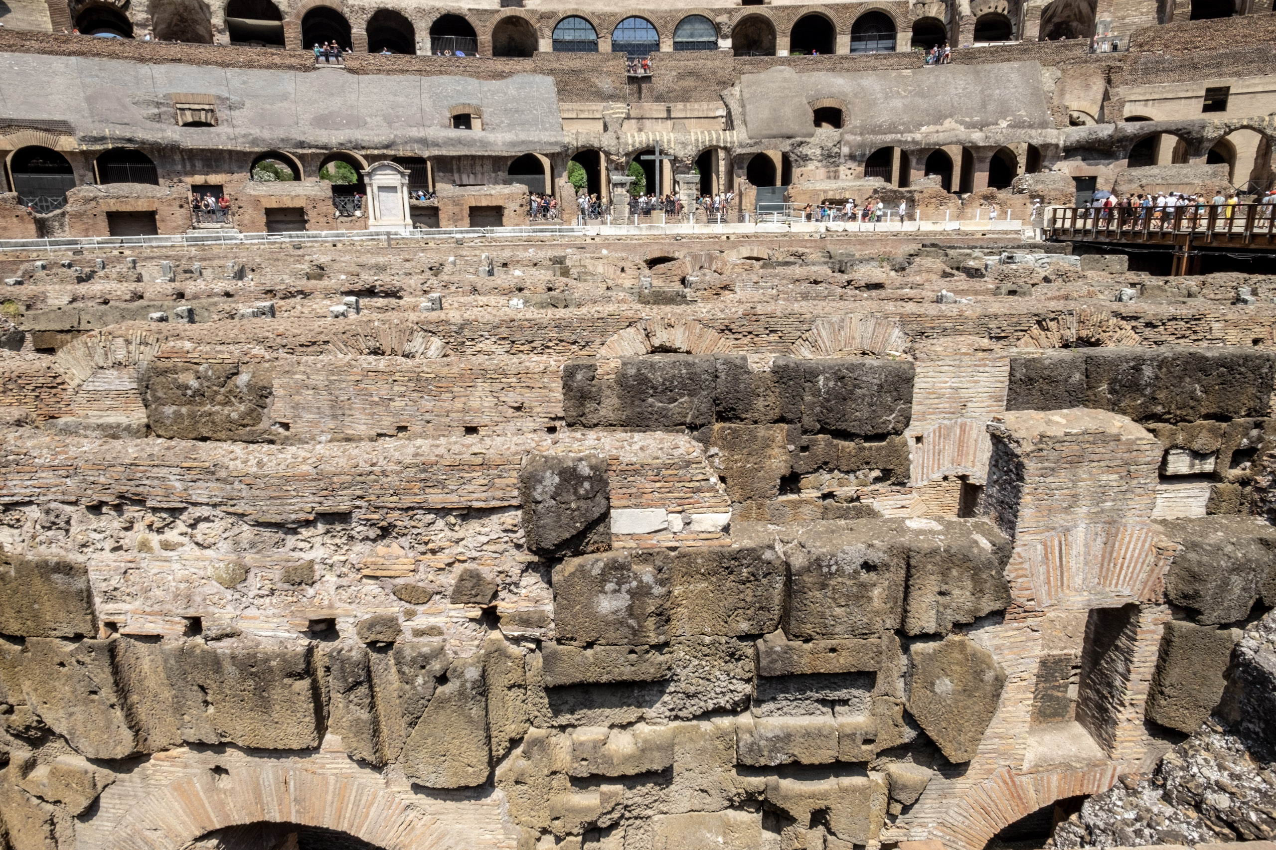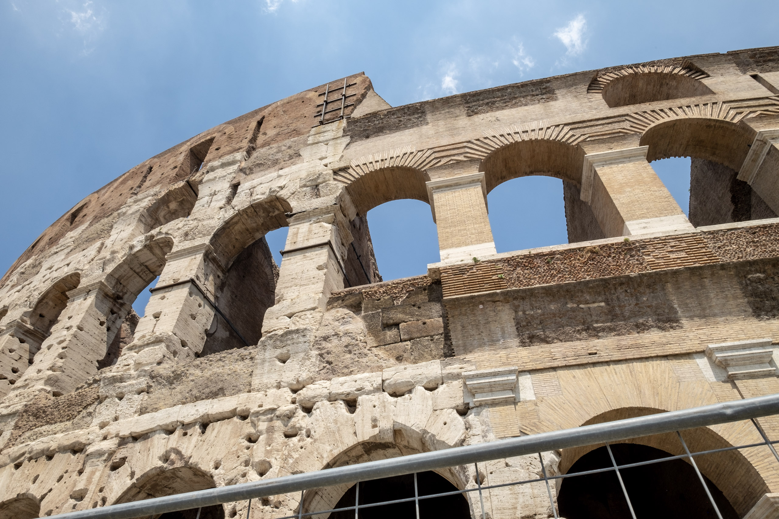We reboard our coach, only to find that we are two short. Our Australian companions are nowhere to be found. We press on regardless, and take a scenic route to the Colosseum grounds. Christina warns all to avoid the street vendors and their cold water, as it is often from untested, bacteria-rich sources. We arrive near the Arch of Constantino, which we’re told served as inspiration for the Parisian Arc de Triomph. The Colosseum is teeming with fans, not unlike its Los Angeles relative on Fall weekends. It is in surprisingly good shape, and we are able to navigate two levels. Christina tells us that the levels are organized according to social strata, with the most well connected and wealthy of the Imprerial era enjoying the best seats. It all sounds more than vaguely familiar. . . .