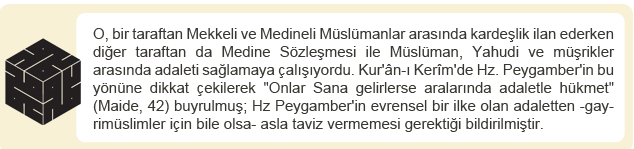 Allah Rasûlü mübarek hayatı boyunca, toplumda adaleti hâkim kılmak için mücadele etmiş, gerek Müslümanlar gerekse gayrimüslimler arasındaki muamele ve hükümlerde adaletin en güzel örneklerini vermiş, adaleti temel hakların ve özgürlüklerin korunması, toplumsal huzurun ve barışın sağlanmasının teminatı olarak görmüştür.