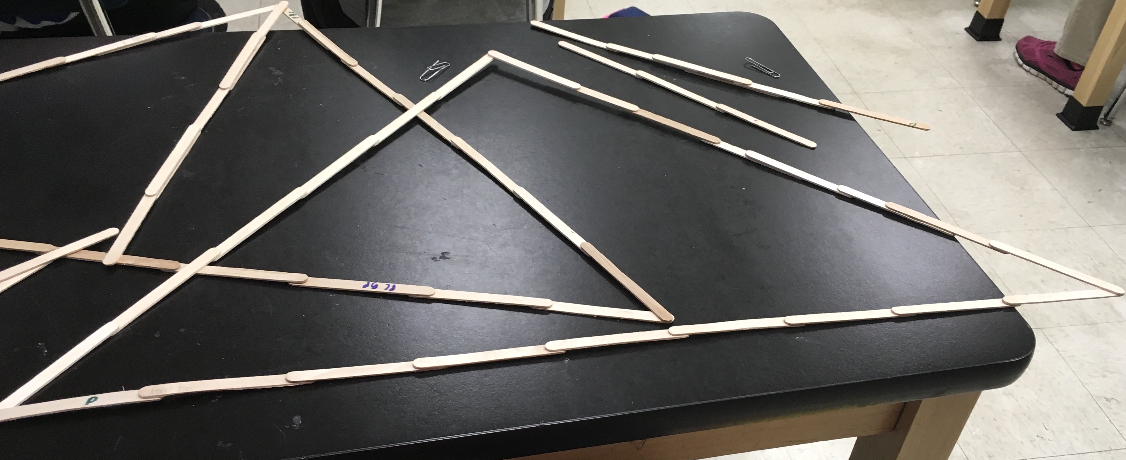 Step 5: After the Isoceles triangles fully dry, carefully remove all paper clips if you used any. Next lay down, glue, and clip small, straight lines, down the middle from touching the vertex to touching the baseline, of each Isoceles triangle, that divides each Isoceles triangle into 2 more triangles, using however many sticks it takes to do so and let dry for 20 minutes Remember to use the same overlap pattern when doing so.