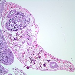 The rickettsial organism Neorickettsia helmonthoeca is embedded within the fluke, Nanophyetus salmincola, which is embedded within raw fish. Once in the dog's intestinal tract, the larval flukes excyst and release the rickettsiae. The rickettsial organisms then hematogenously spread to the liver, lungs, brain, and lymphoid tissues causing necrosis, hemorrhage, and hyperplasia.